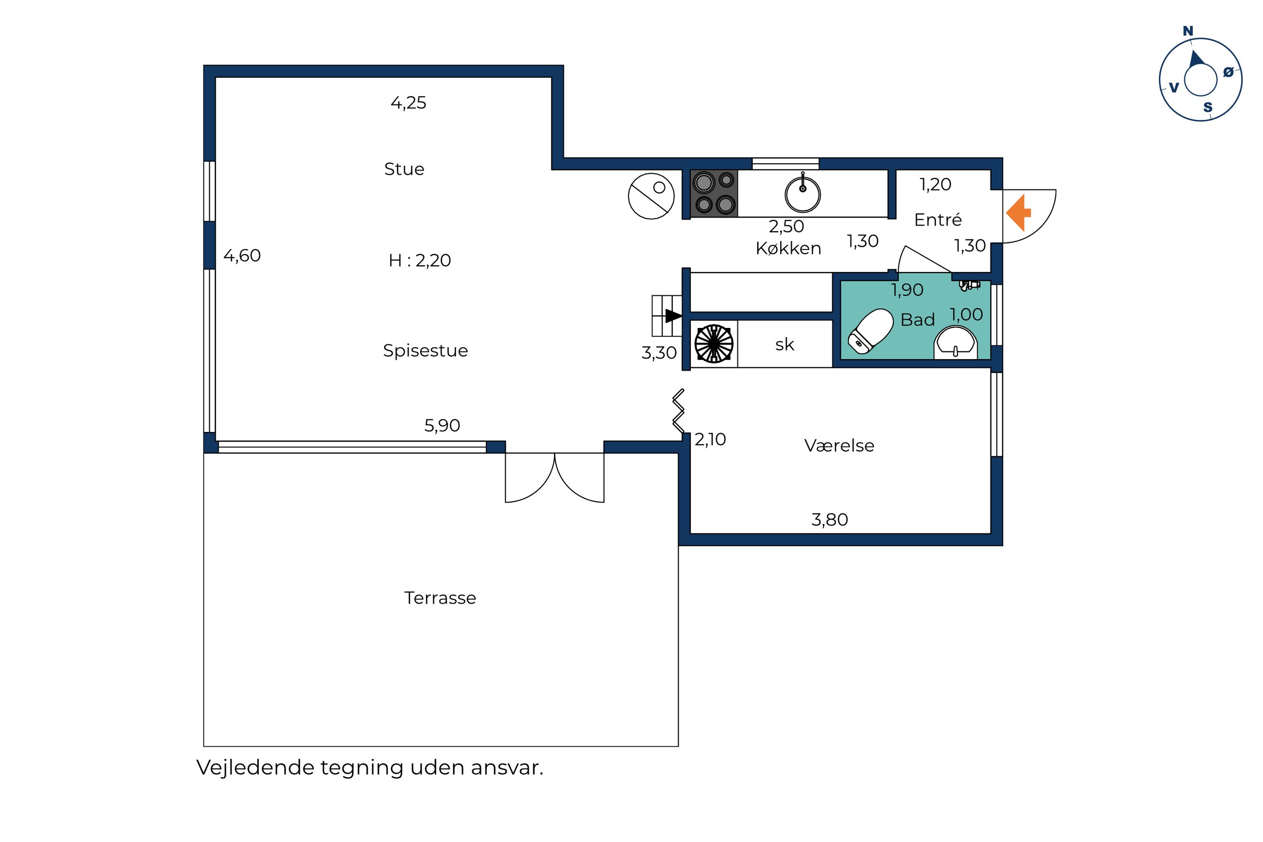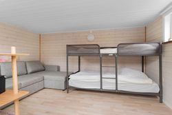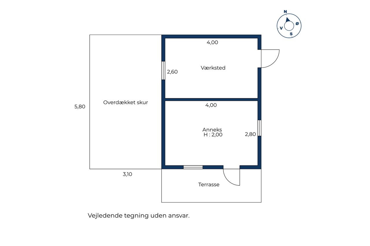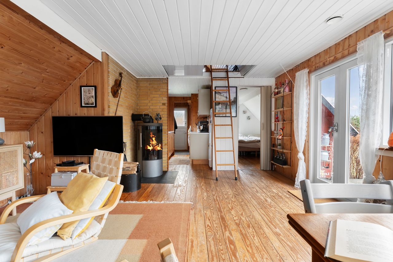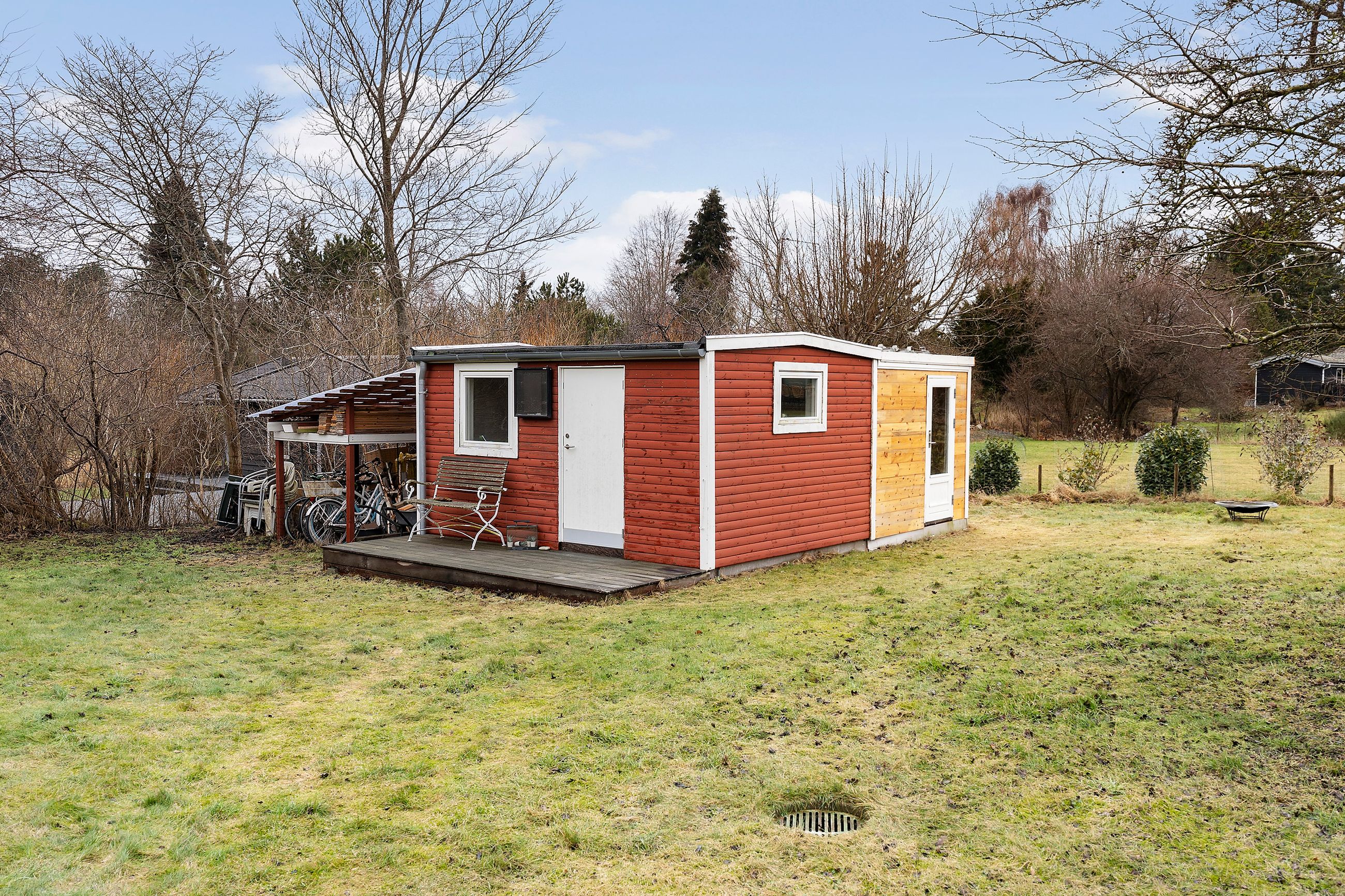 Huset er indrettet med stue og køkken i åben forbindelse og med en foldedør ind til soveværelset. I hovedhuset er der desuden entré og badeværelse, mens det isolerede anneks byder velkommen til et ekstra soveværelse, hvor der er fire sovepladser, hvoraf de to er køjesenge. Annekset er BBR-registreret, og ved siden af det får I et rum på cirka ti kvadratmeter, der kan bruges til opbevaring eller hobbyværksted.