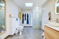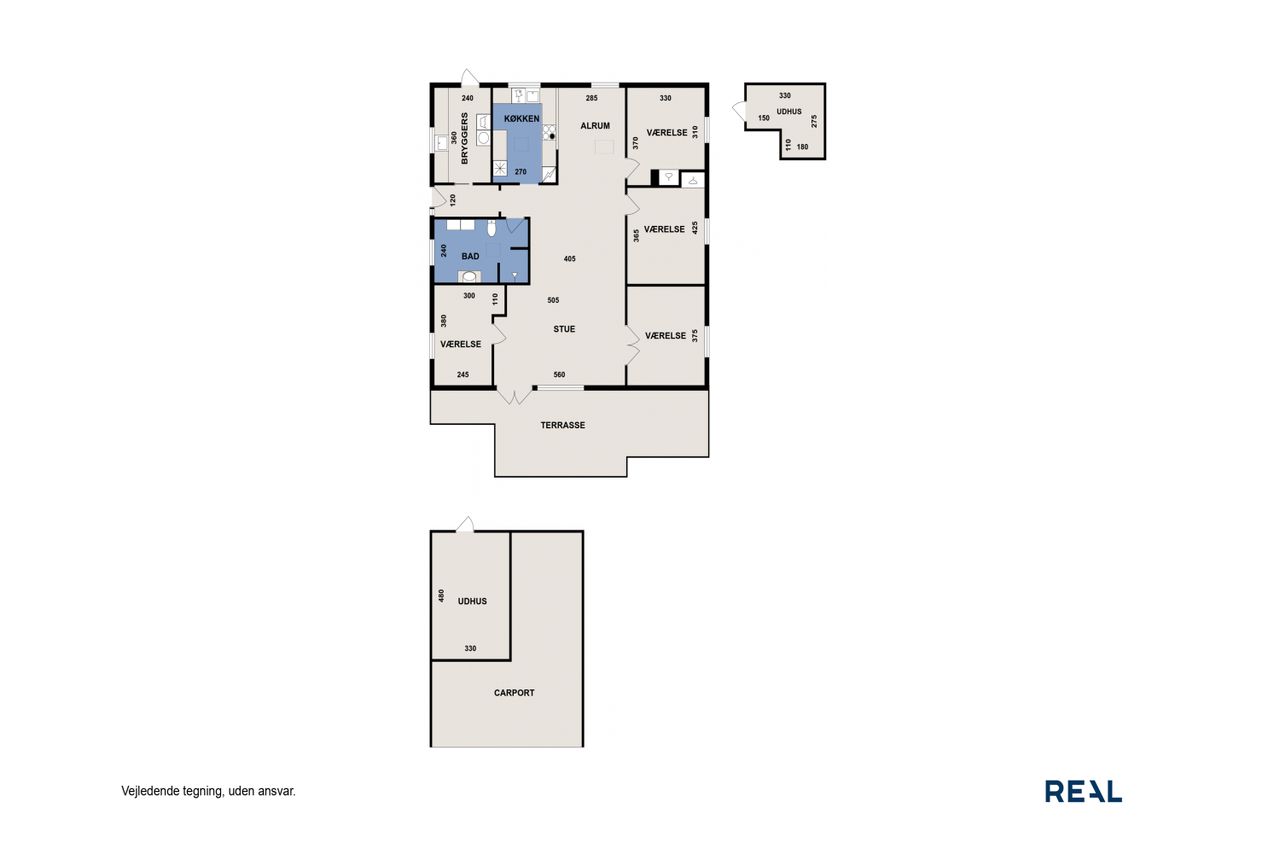 Der er samtidig mulighed for at etablere et gæstetoilet – enten ved at opdele det eksisterende badeværelse, eller ved at indrette det i bryggerset med adgang fra entréen. Vælger man sidstnævnte løsning, kan man desuden skabe praktisk adgang til bryggerset direkte fra køkkenet.