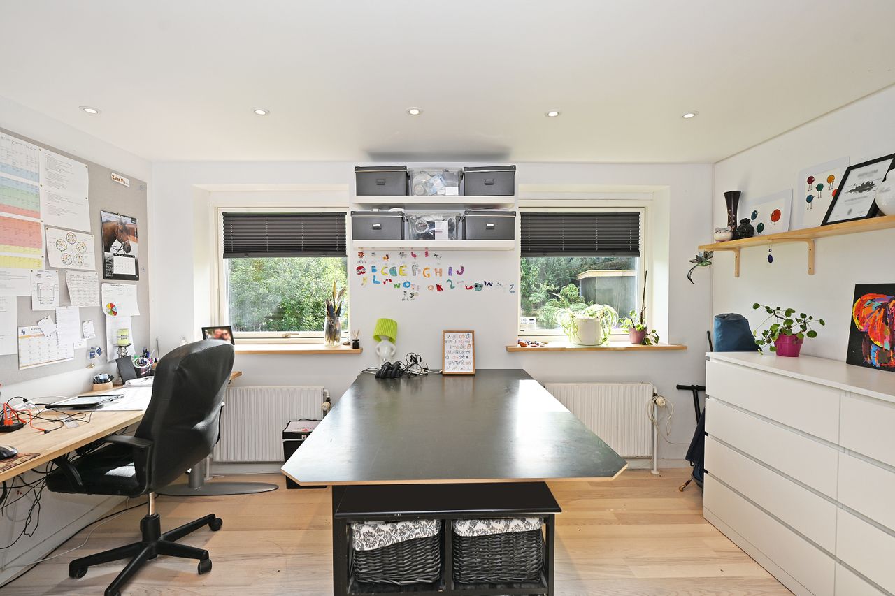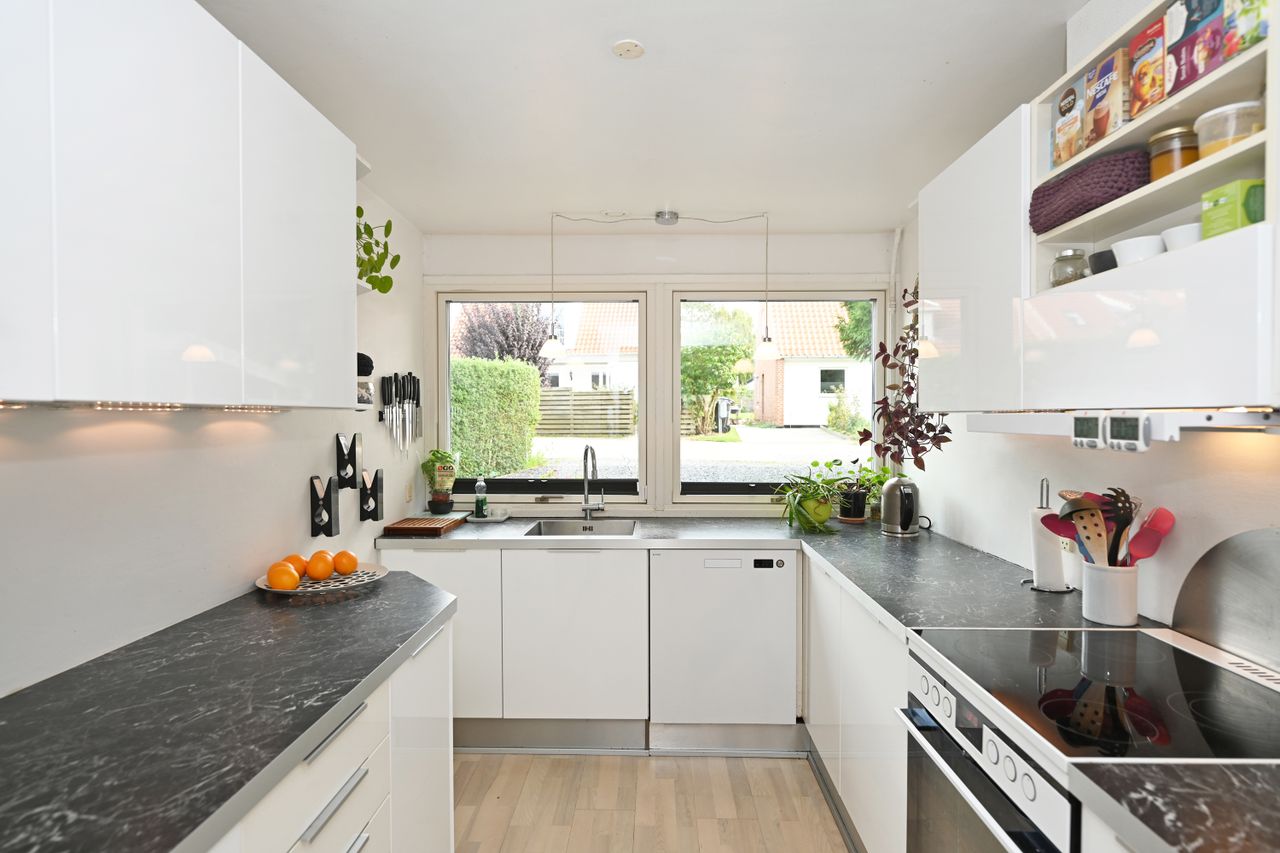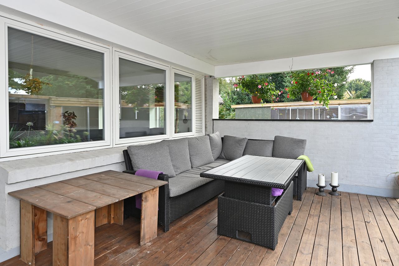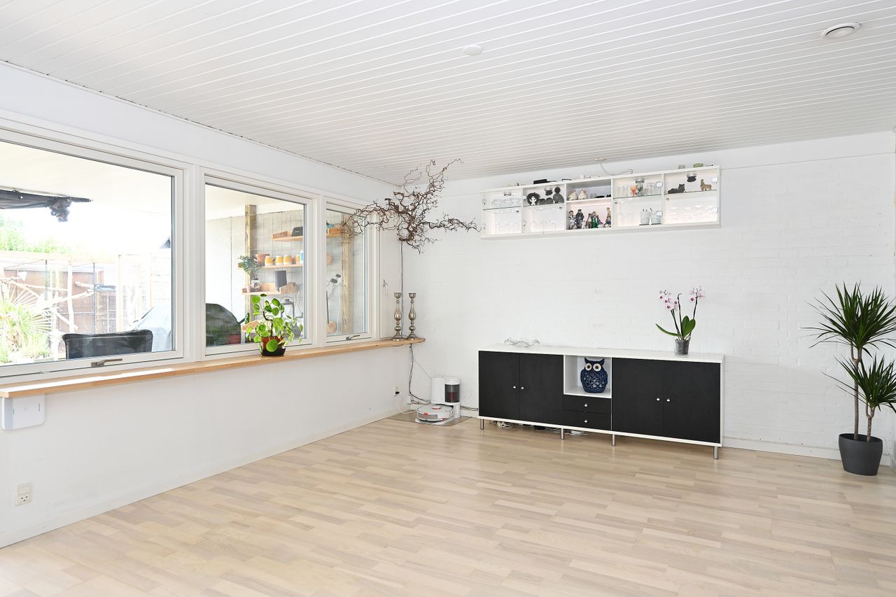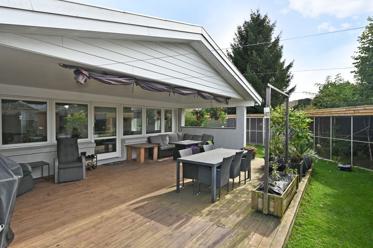 Indretningen er lys og rummelig med en stor, åben stue, hvorfra der er direkte adgang til en skøn overdækket træterrasse – perfekt til udendørs ophold året rundt. Køkkenet ligger i åben forbindelse med spisestuen og har god skabsplads. Boligen rummer desuden fire gode værelser, som kan anvendes som soveværelser, kontor eller børneværelser.