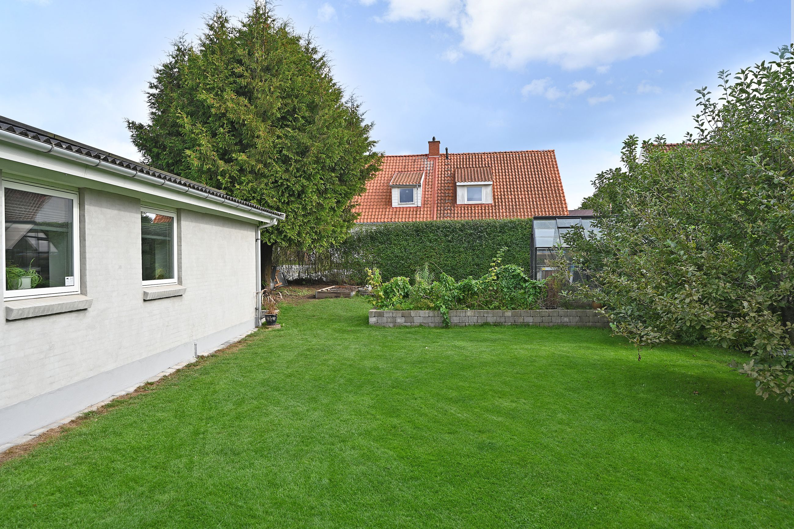 Haven er ugeneret og velanlagt med græsplæne, højbede og hyggelige kroge. Derudover er der en stor indkørsel med plads til flere biler.