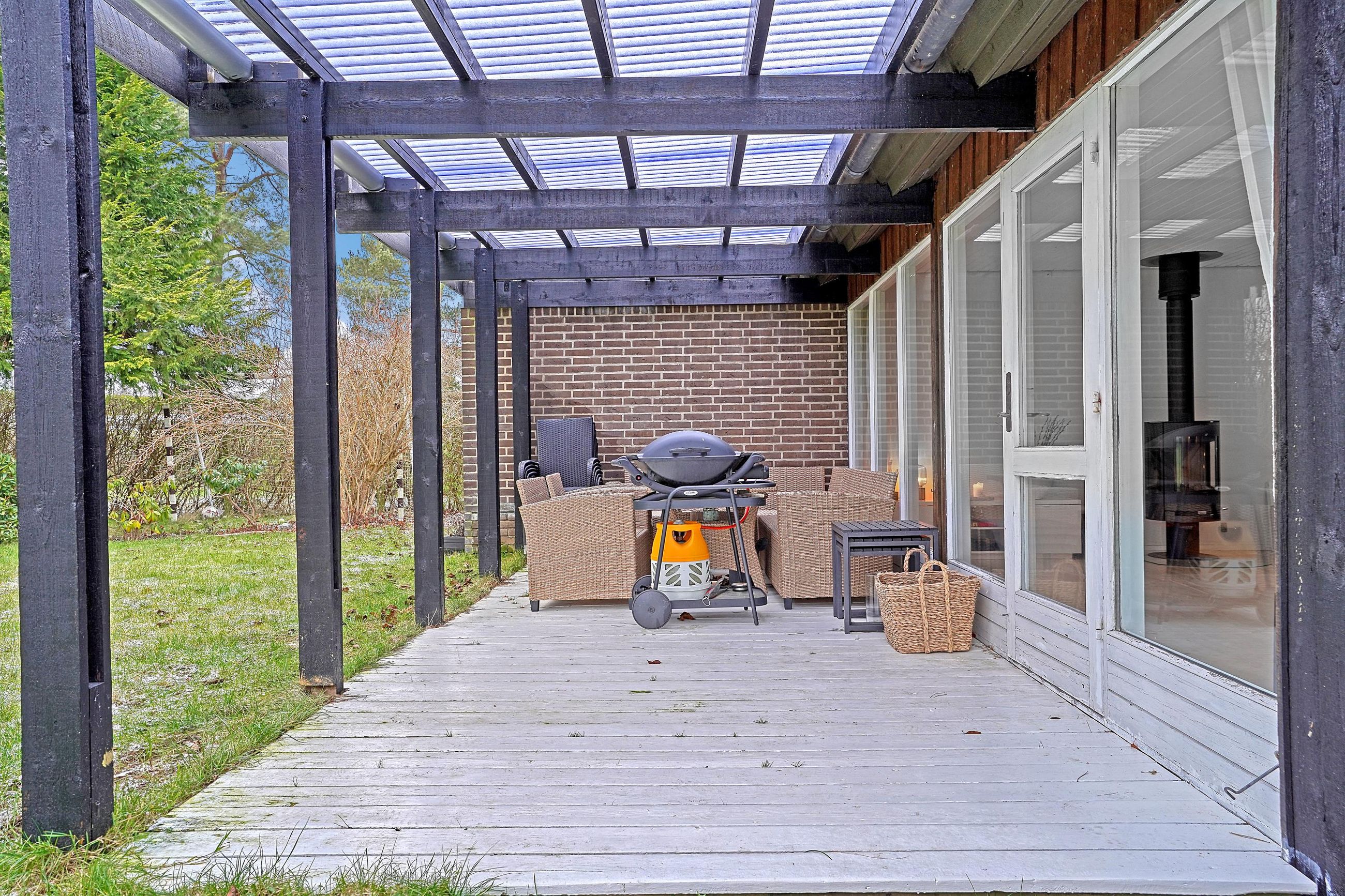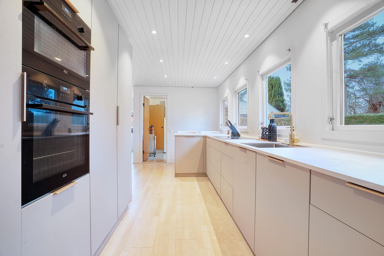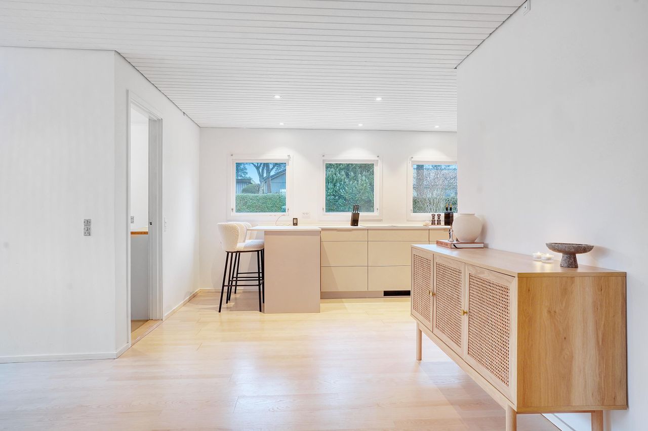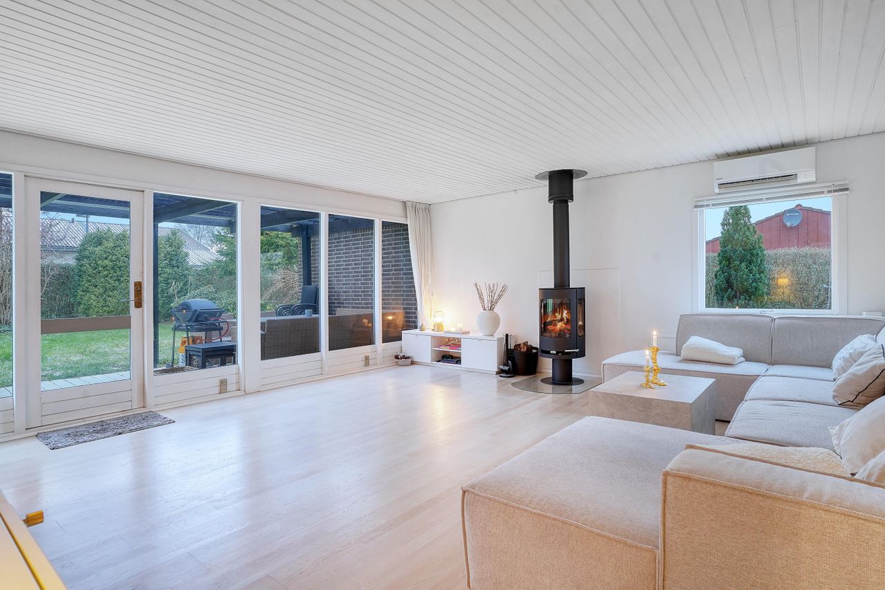 Hjemmets hjerte er det moderne kvik køkken, der med sine lyse elementer, stilrene detaljer og gode arbejdsplads gør madlavningen til en fornøjelse. Køkkenet er åbent mod alrummet, hvor en indbygget spiseplads giver en hyggelig stemning og skaber en naturlig overgang til boligens øvrige rum. Den rummelige stue har et fantastisk lysindfald fra de store vinduespartier, som giver en flot udsigt til haven og direkte udgang til en overdækket terrasse. Stuen indbyder til afslapning med en brændeovn som et hyggeligt supplement til boligens primære opvarmningskilde.