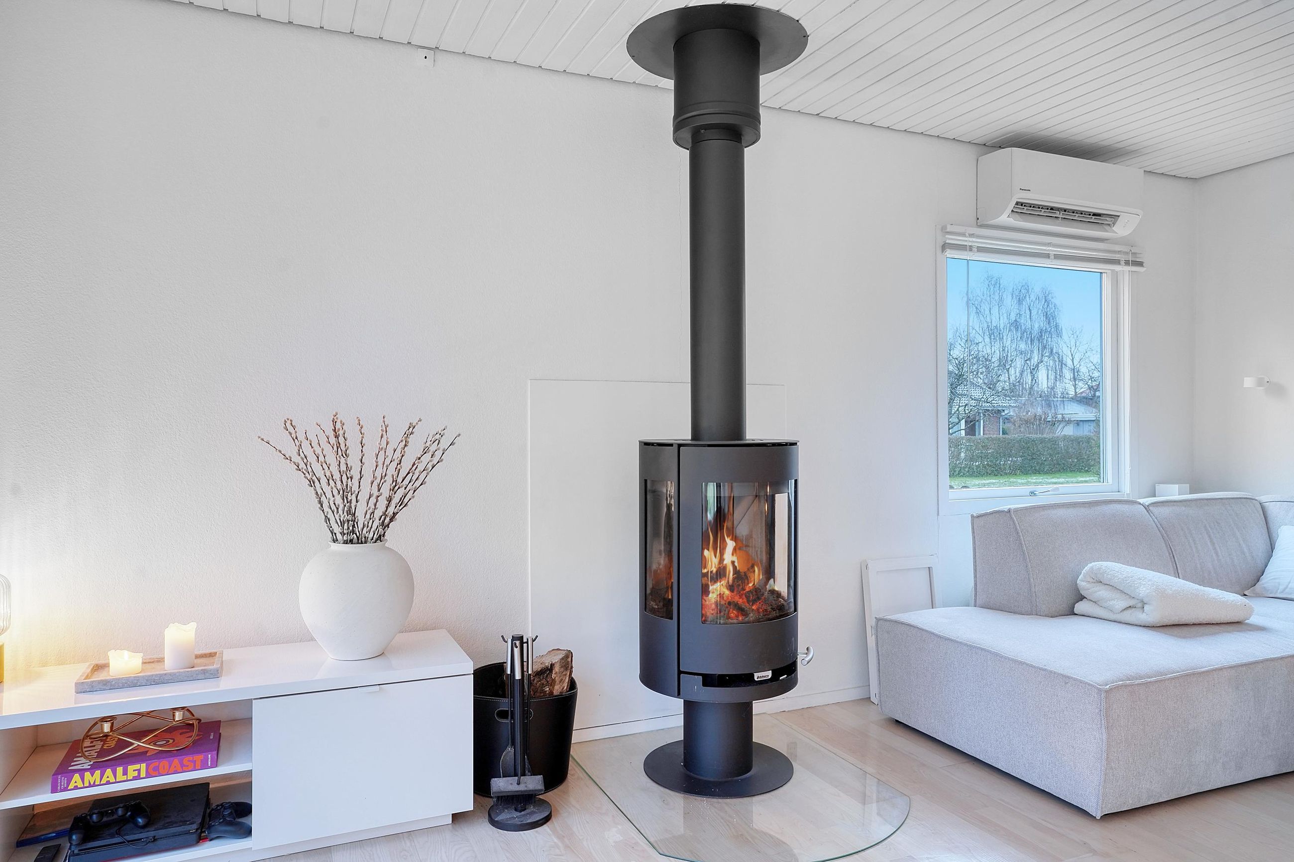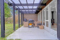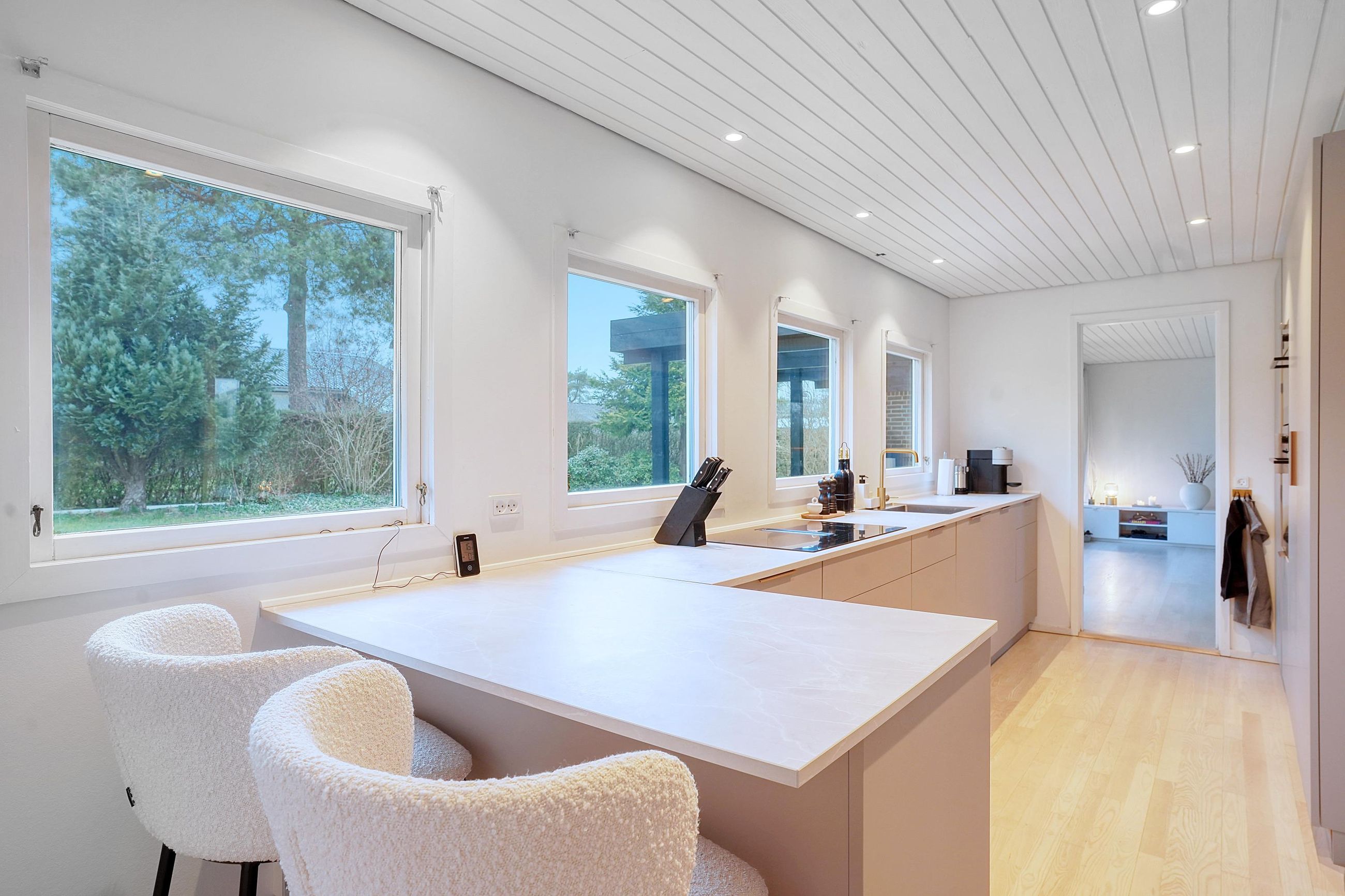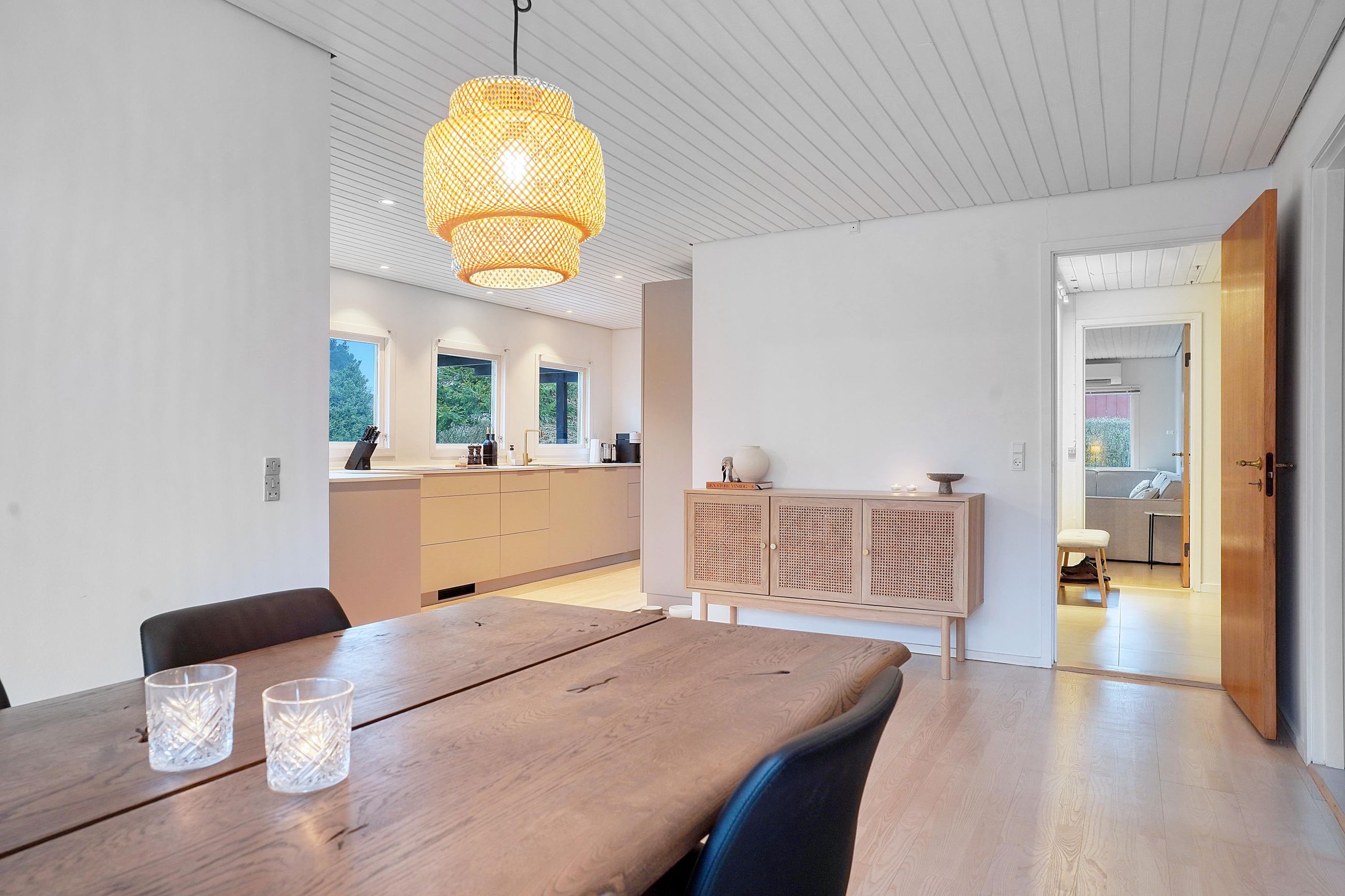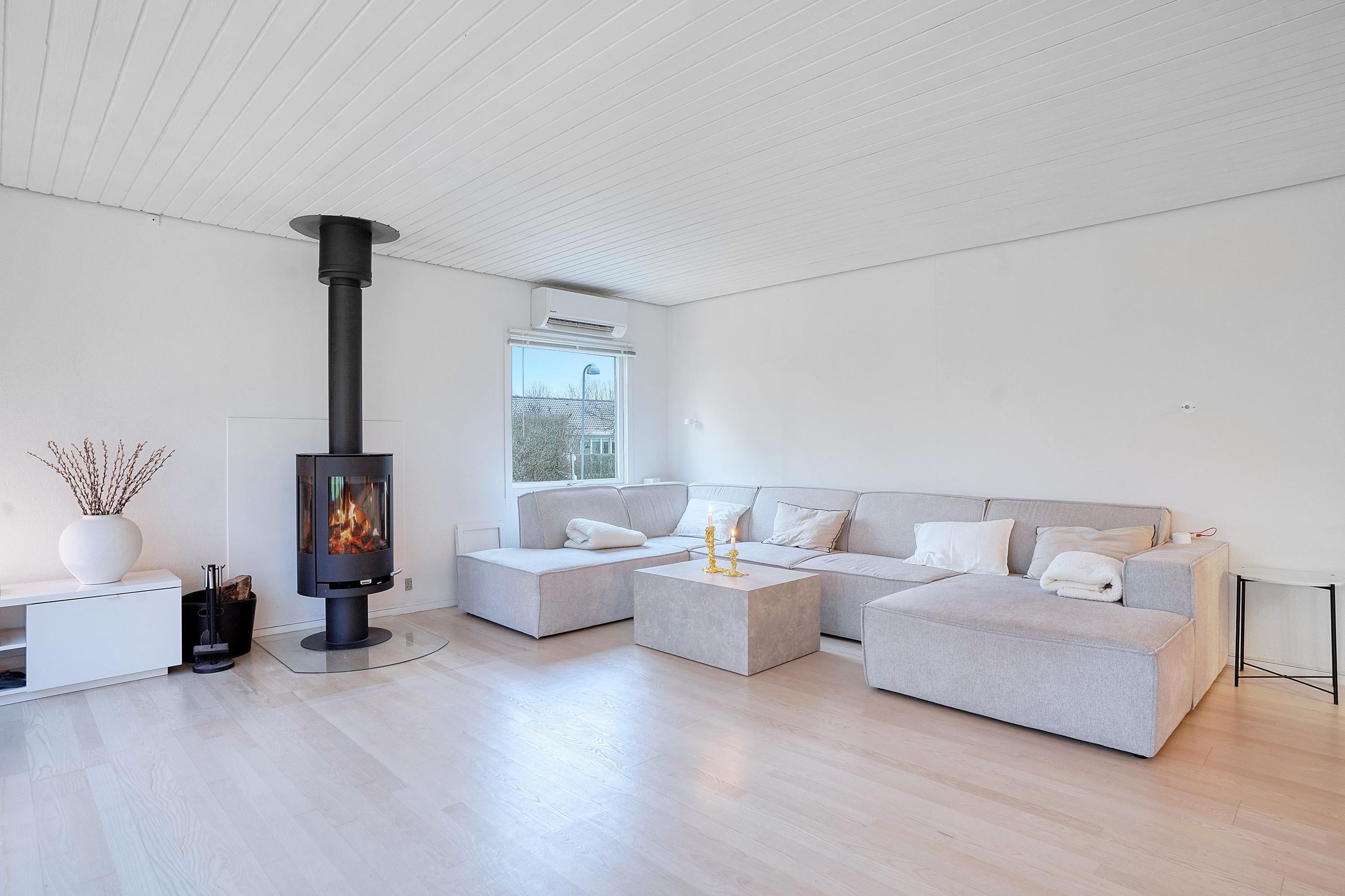 Hjemmets hjerte er det moderne kvik køkken, der med sine lyse elementer, stilrene detaljer og gode arbejdsplads gør madlavningen til en fornøjelse. Køkkenet er åbent mod alrummet, hvor en indbygget spiseplads giver en hyggelig stemning og skaber en naturlig overgang til boligens øvrige rum. Den rummelige stue har et fantastisk lysindfald fra de store vinduespartier, som giver en flot udsigt til haven og direkte udgang til en overdækket terrasse. Stuen indbyder til afslapning med en brændeovn som et hyggeligt supplement til boligens primære opvarmningskilde.