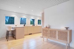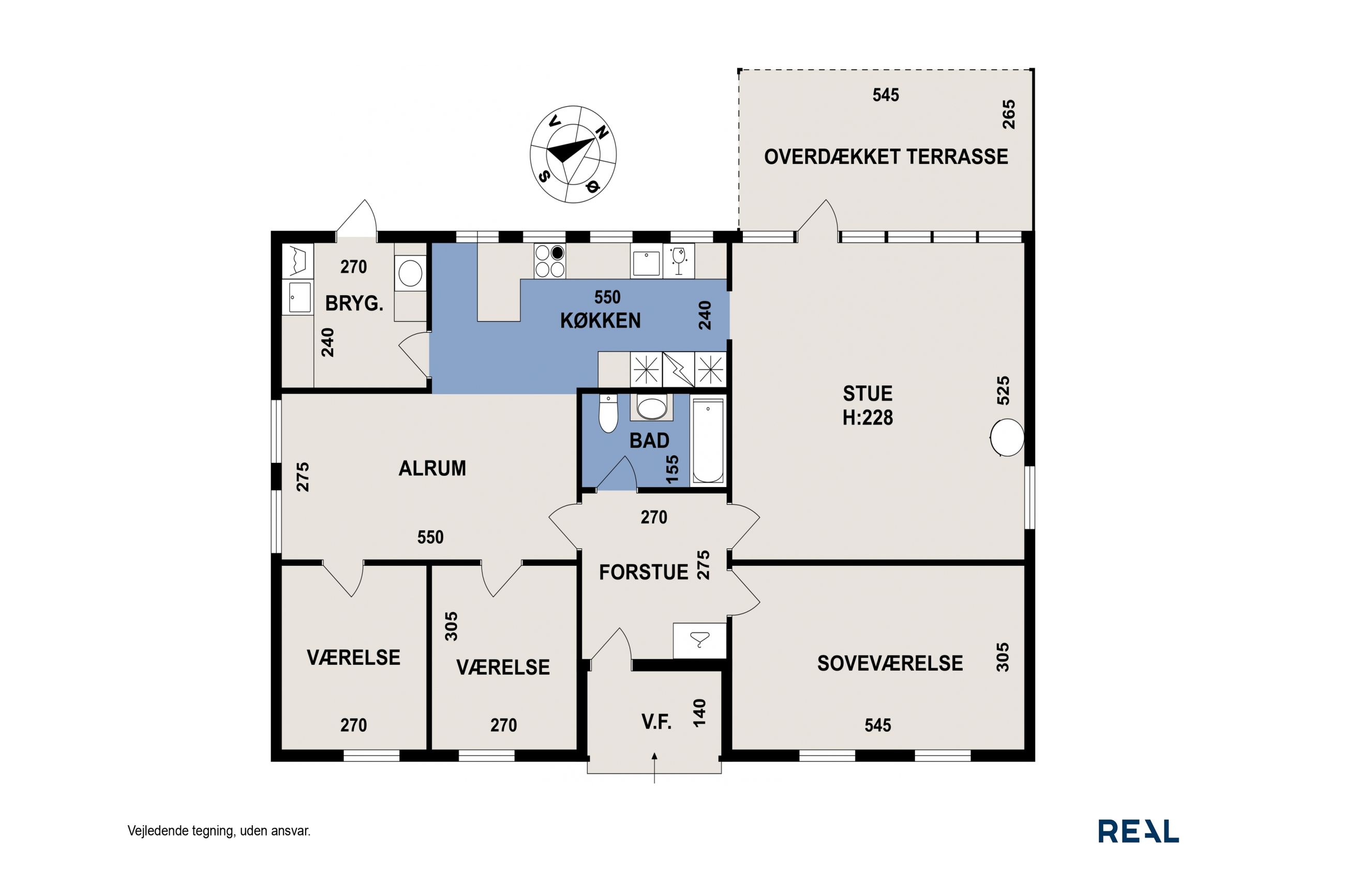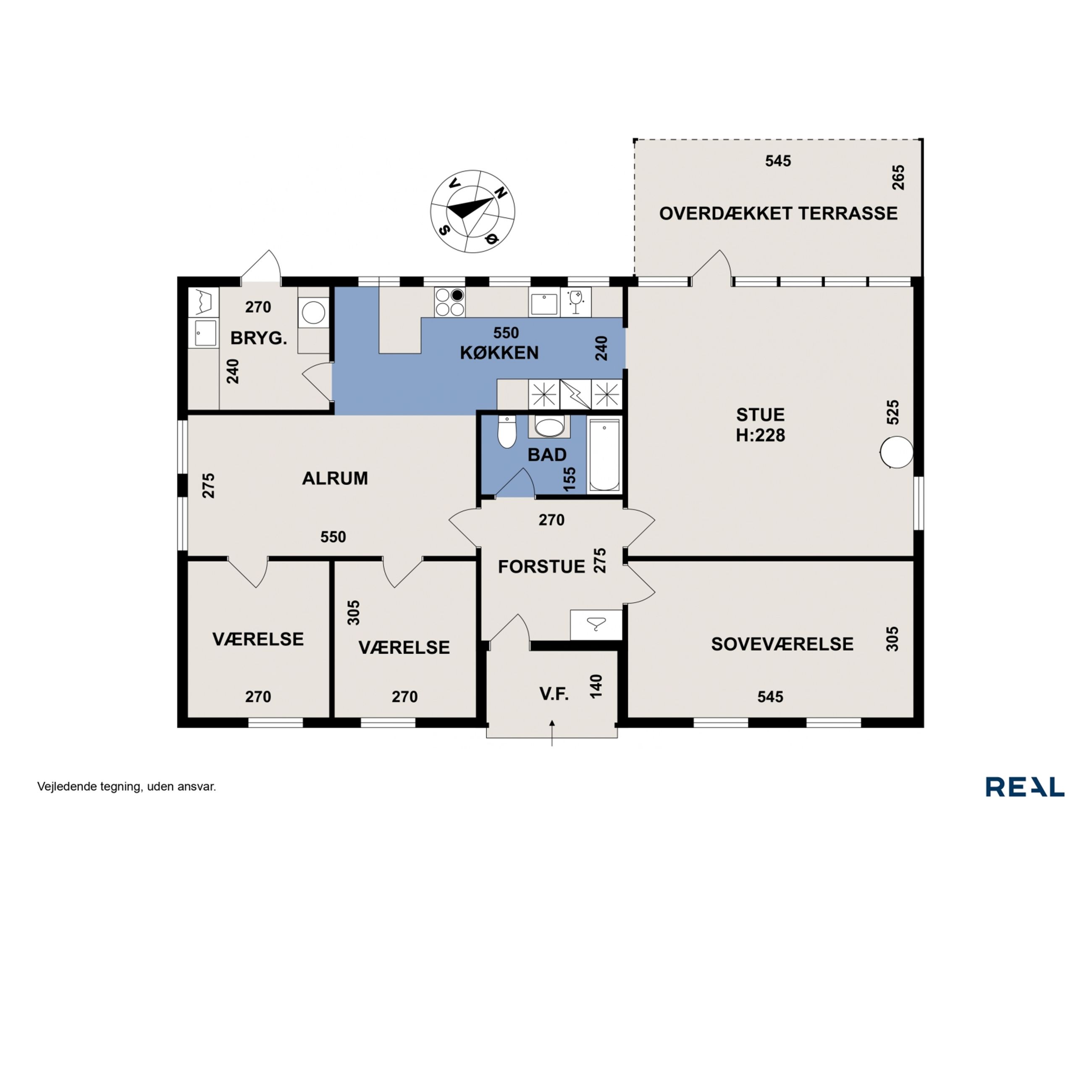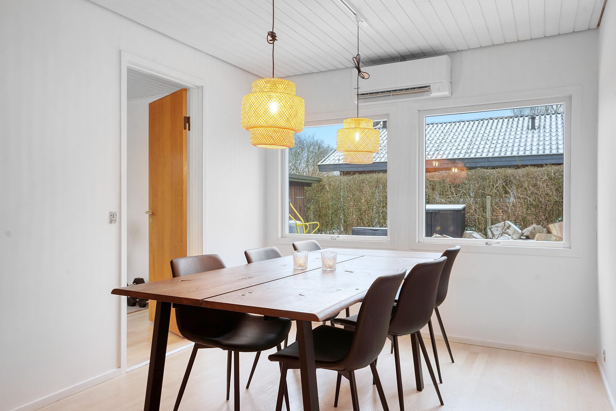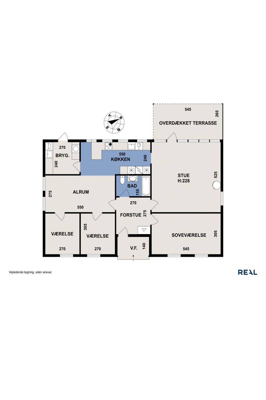 Hjemmets hjerte er det moderne kvik køkken, der med sine lyse elementer, stilrene detaljer og gode arbejdsplads gør madlavningen til en fornøjelse. Køkkenet er åbent mod alrummet, hvor en indbygget spiseplads giver en hyggelig stemning og skaber en naturlig overgang til boligens øvrige rum. Den rummelige stue har et fantastisk lysindfald fra de store vinduespartier, som giver en flot udsigt til haven og direkte udgang til en overdækket terrasse. Stuen indbyder til afslapning med en brændeovn som et hyggeligt supplement til boligens primære opvarmningskilde.