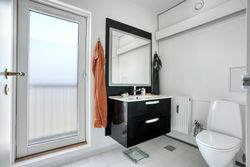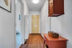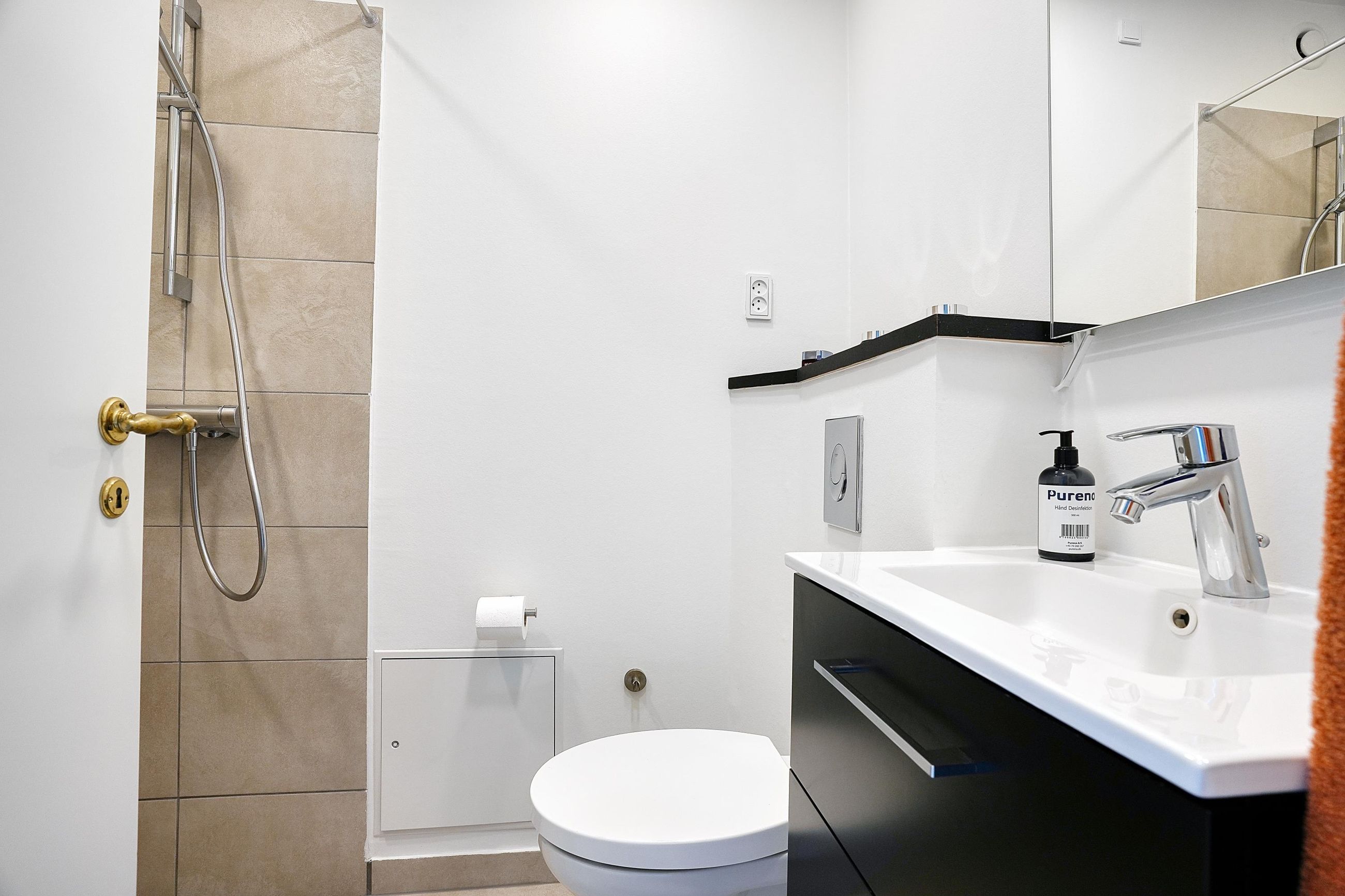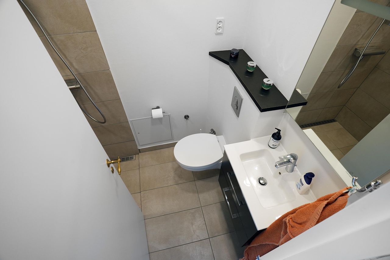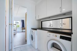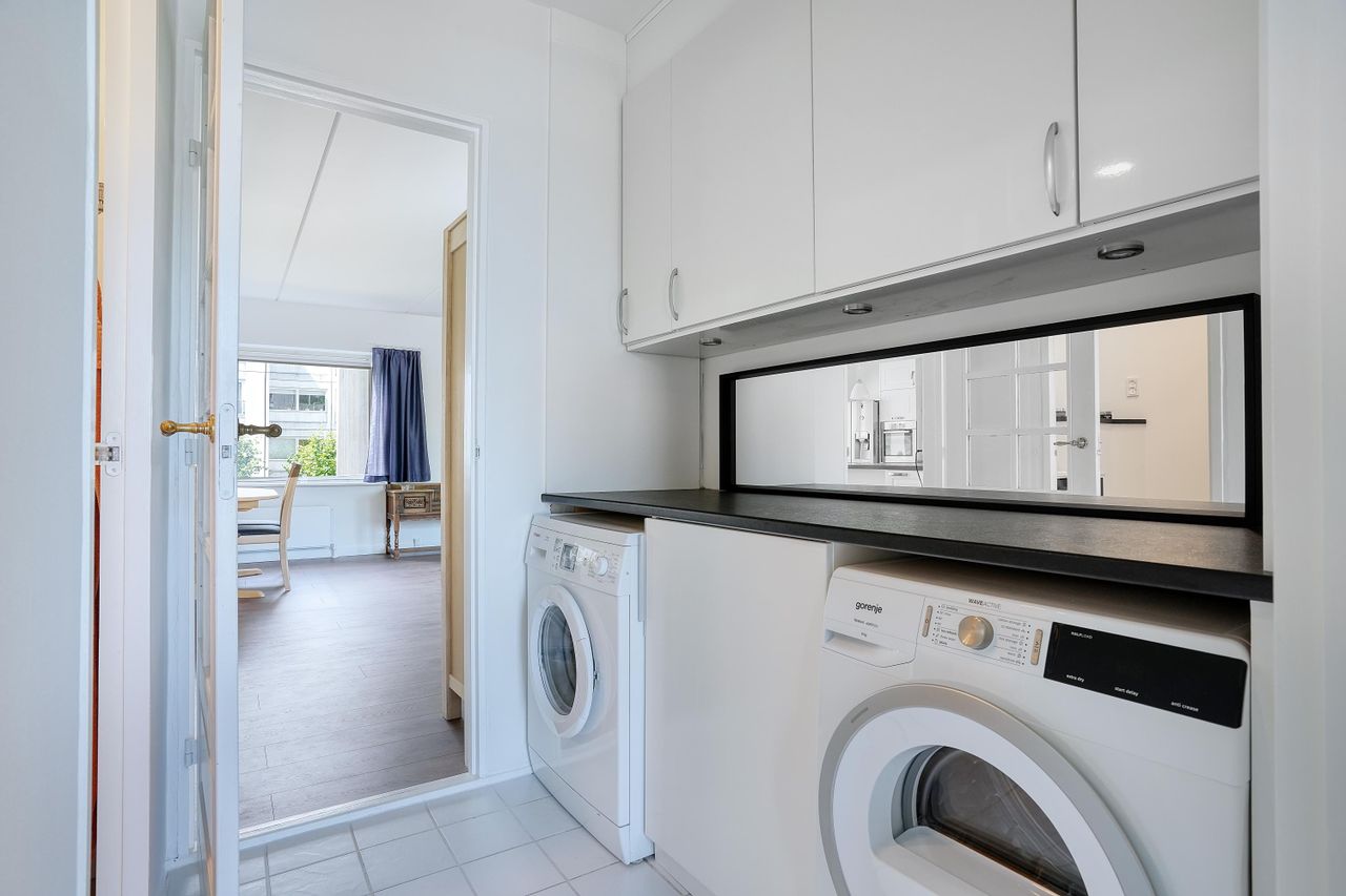I lejligheden findes et moderne badeværelse med bruseniche samt et separat gæstetoilet – en sjælden og praktisk løsning, der giver ekstra komfort i hverdagen. Her ligger også et rummeligt bryggers med vaskemaskine, tørretumbler og gode opbevaringsmuligheder.