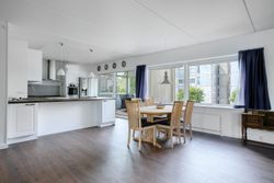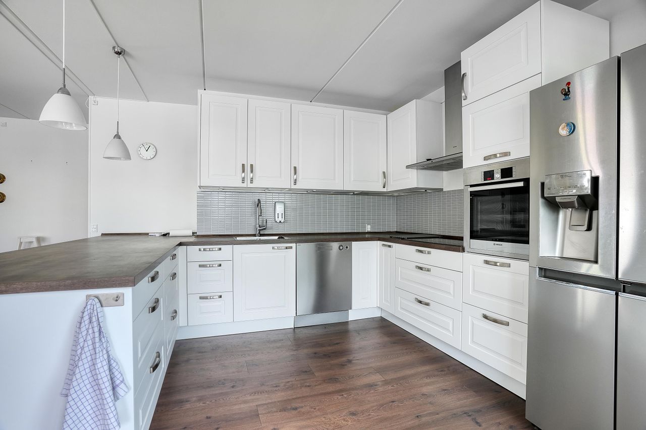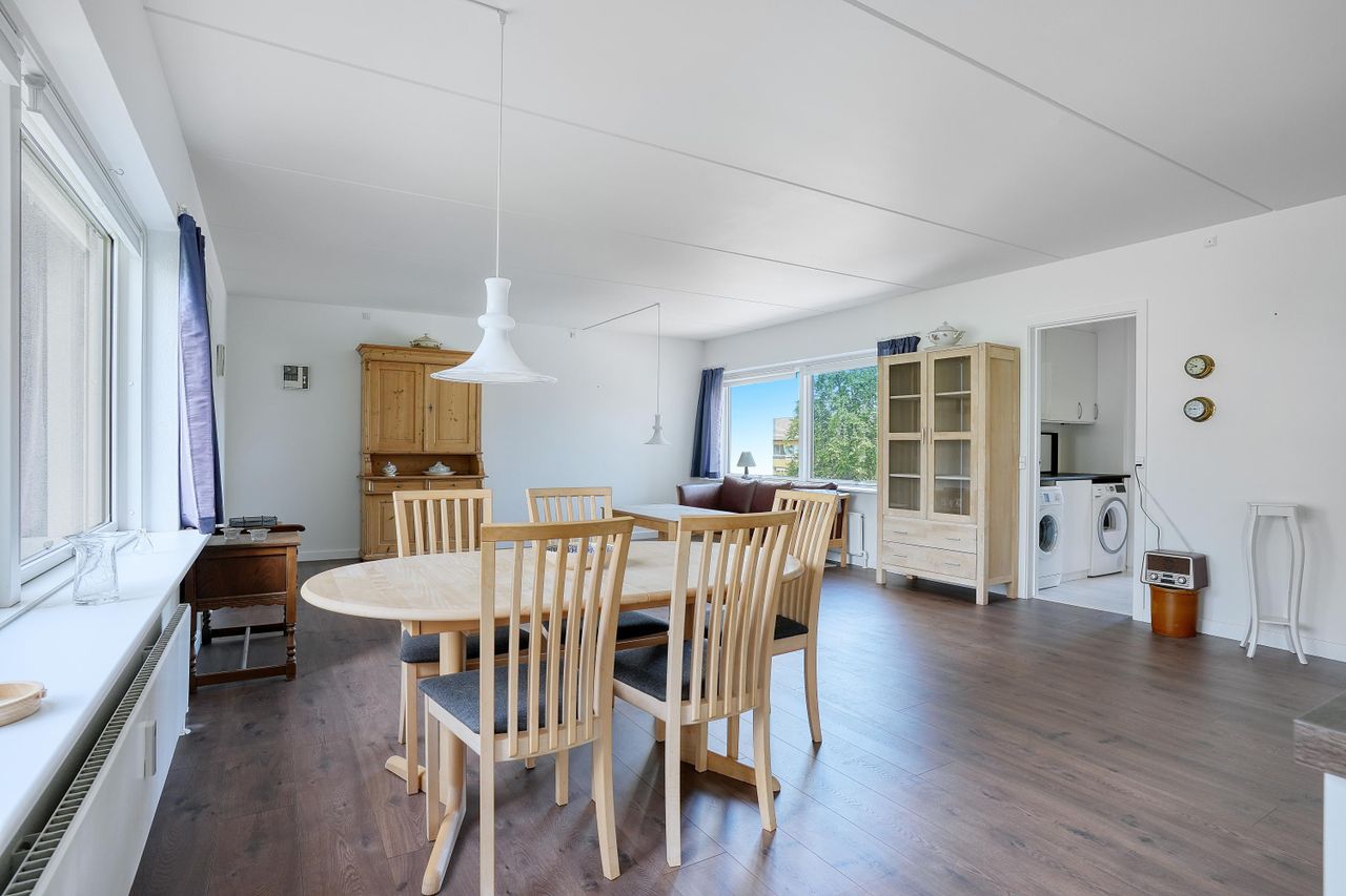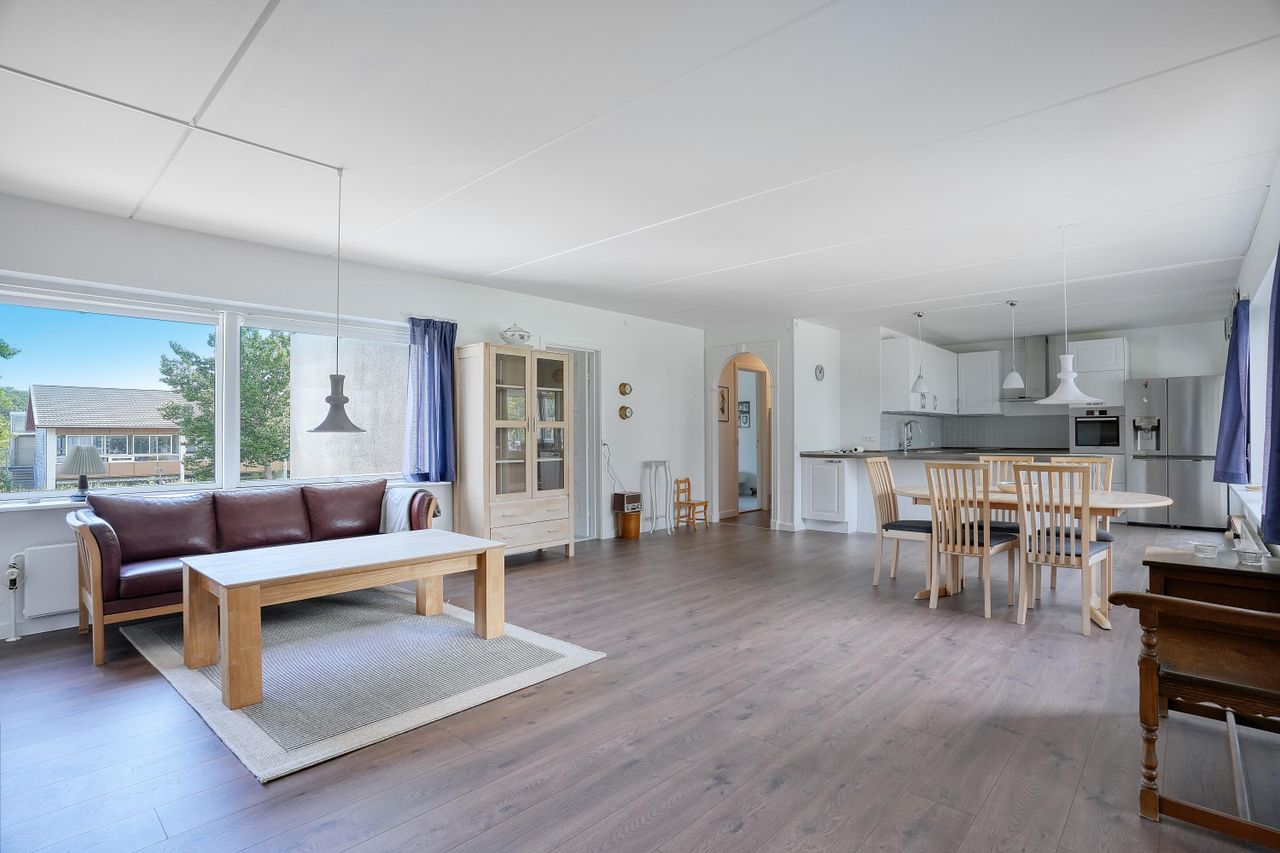 Lejlighedens hjerte er det store, åbne opholdsrum, hvor stue og køkken flyder sammen i ét. Køkkenet er holdt i tidløst hvidt design med god skabsplads, integrerede hvidevarer og praktisk opvaskestation. Den tilhørende spiseafdeling ligger ud mod altanen, der er lukket med skydedøre og fungerer som en lun udestue – perfekt til både afslapning og hyggelige middage året rundt.