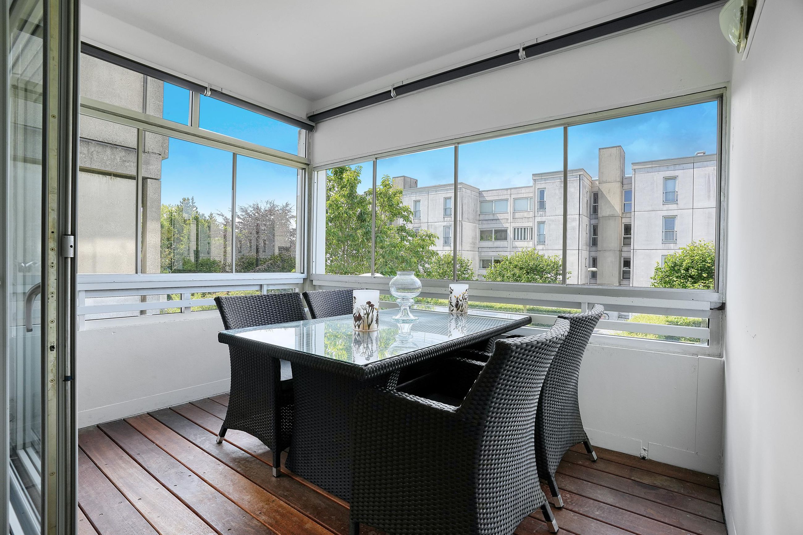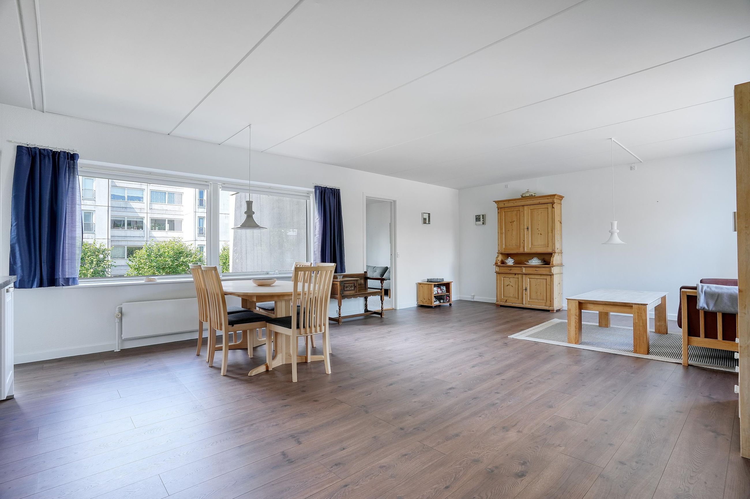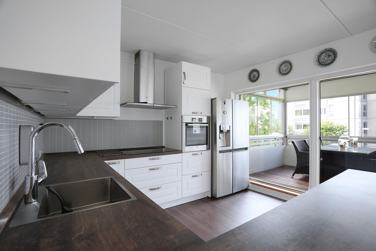 Lejlighedens hjerte er det store, åbne opholdsrum, hvor stue og køkken flyder sammen i ét. Køkkenet er holdt i tidløst hvidt design med god skabsplads, integrerede hvidevarer og praktisk opvaskestation. Den tilhørende spiseafdeling ligger ud mod altanen, der er lukket med skydedøre og fungerer som en lun udestue – perfekt til både afslapning og hyggelige middage året rundt.