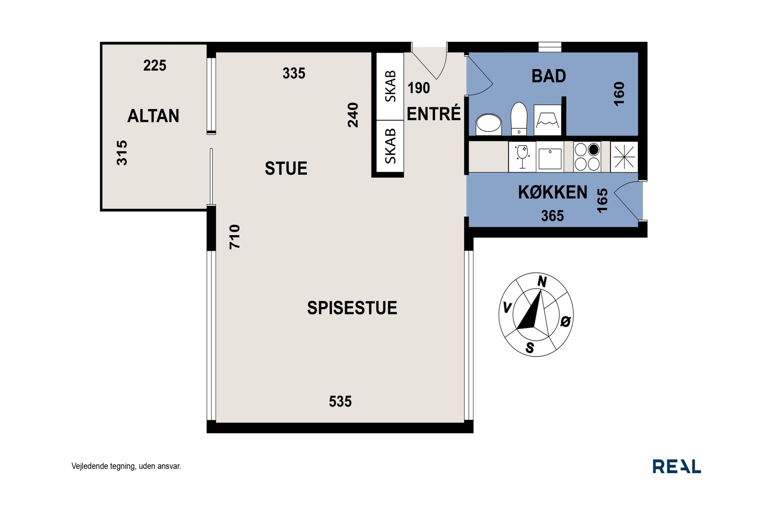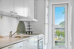 Køkkenet er velindrettet og funktionelt, og badeværelset er udstyret med bruseniche og vaskesøjle. Fra stuen er der adgang til en overdækket altan, hvor du kan nyde udsigten og den rolige atmosfære uanset vejr.
