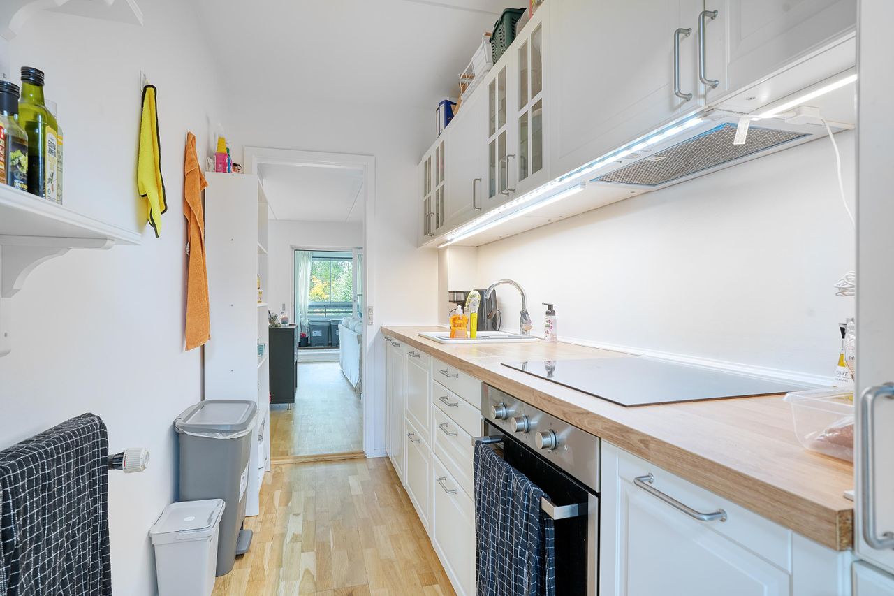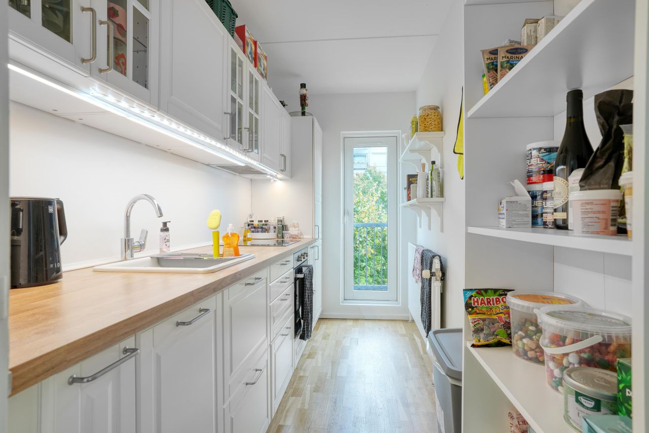 Efter badeværelset kommer køkkenet med både overskabe, skuffer, en flot bordplade og alle nødvendige hvidevarer til at få hverdagen til at fungere optimalt.