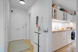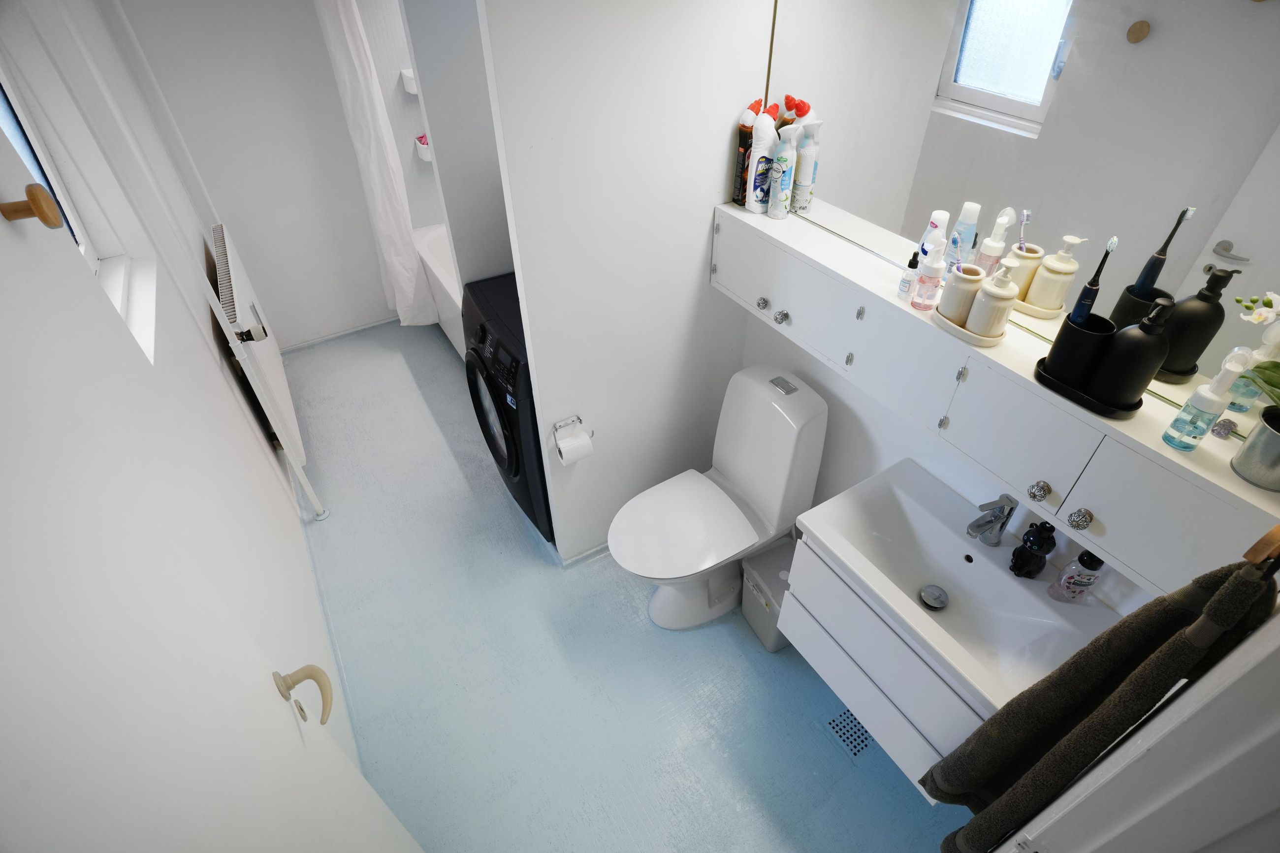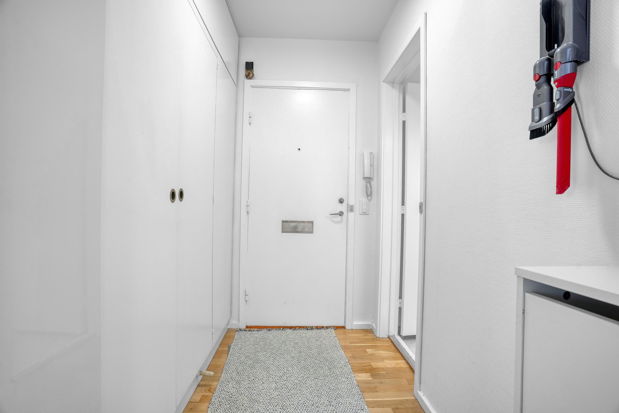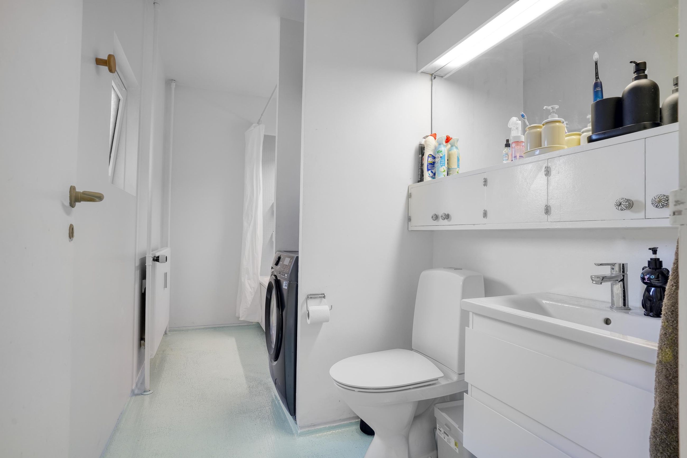 Du træder ind i en bred entré med indbyggede skabe og god plads til sko og overtøj, som baner vejen til resten af lejligheden. Lejligheden har et stort badeværelse med badekar og plads til komplet vaskesøjle, hvis du ønsker. Derudover er der oplukkeligt vindue, så du kan lufte ordentligt ud på badeværelset.