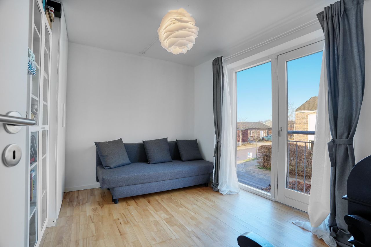 Huset er opført i 2008 og rummer tre værelser samt en stor opholdsstue i åben forbindelse med køkken-alrummet, som fungerer som boligens naturlige samlingspunkt. Her er god plads til både hverdag og gæster, og de store vinduespartier samt terrassedøre sikrer et flot lysindfald og direkte udgang til baghaven. Den åbne trappe til førstesalen bidrager til en luftig og sammenhængende rumfornemmelse mellem etagerne.