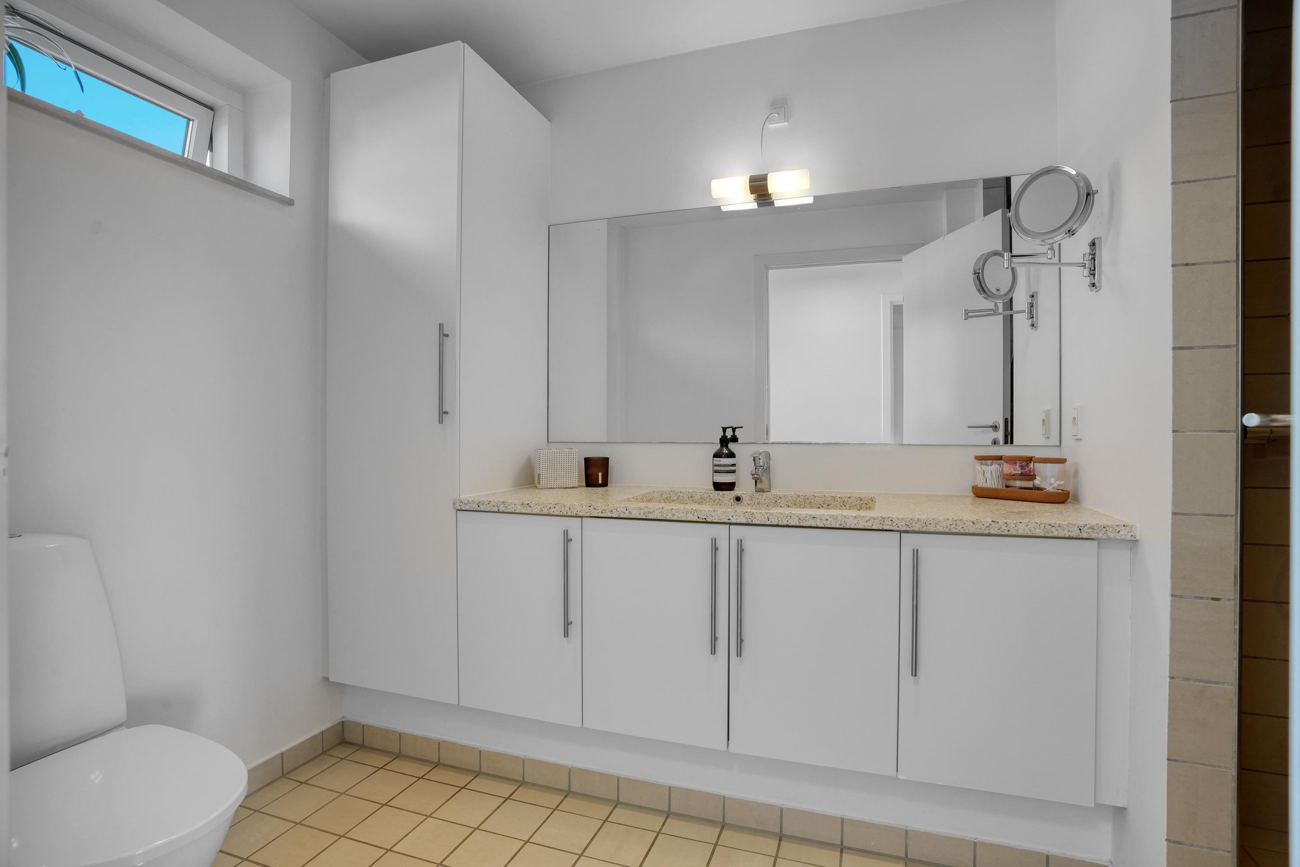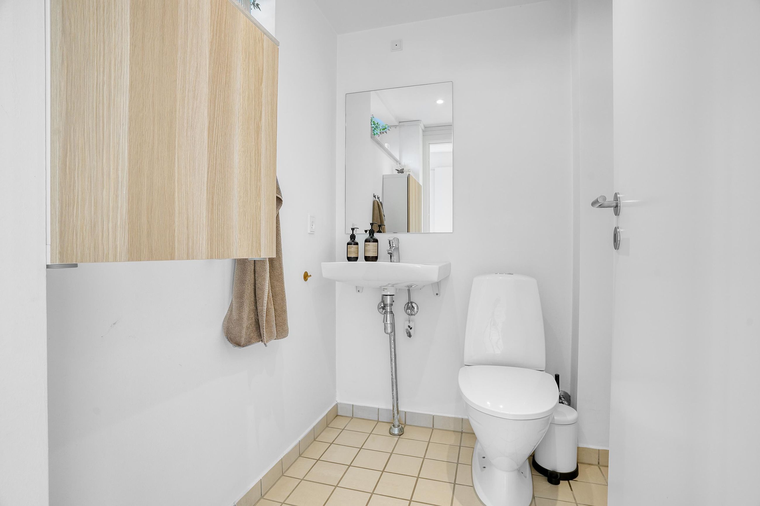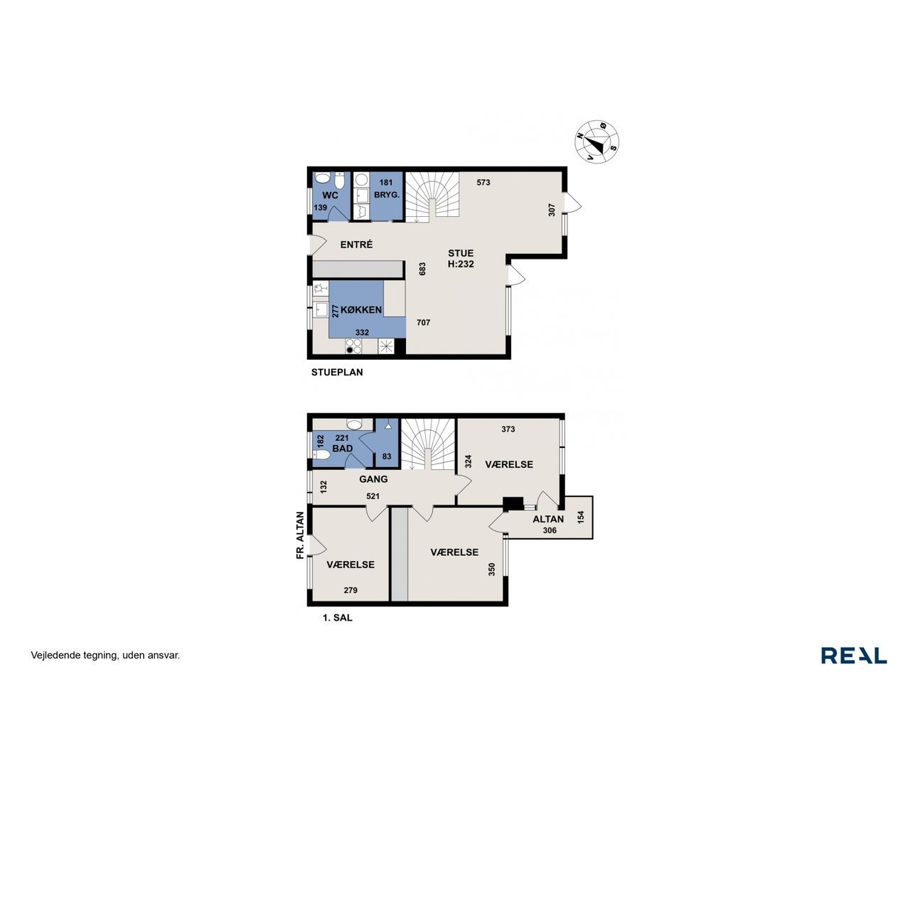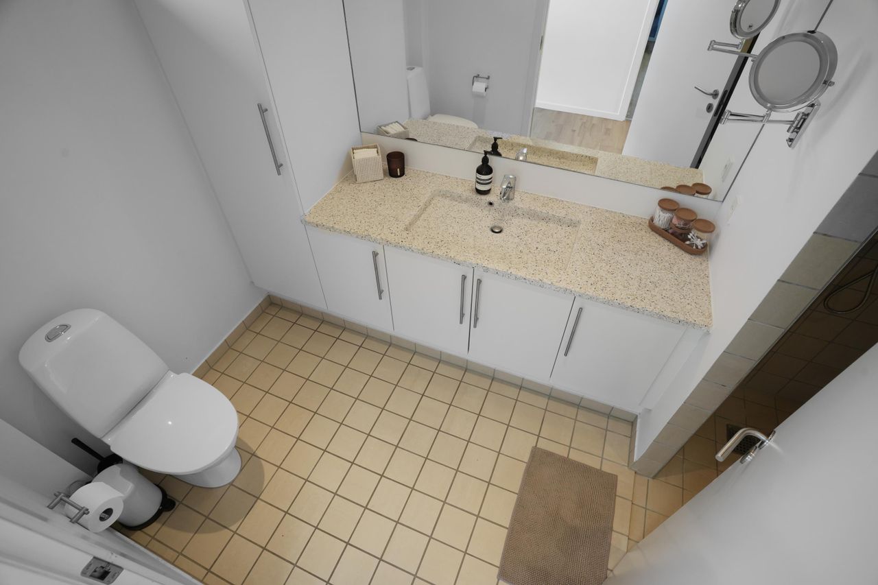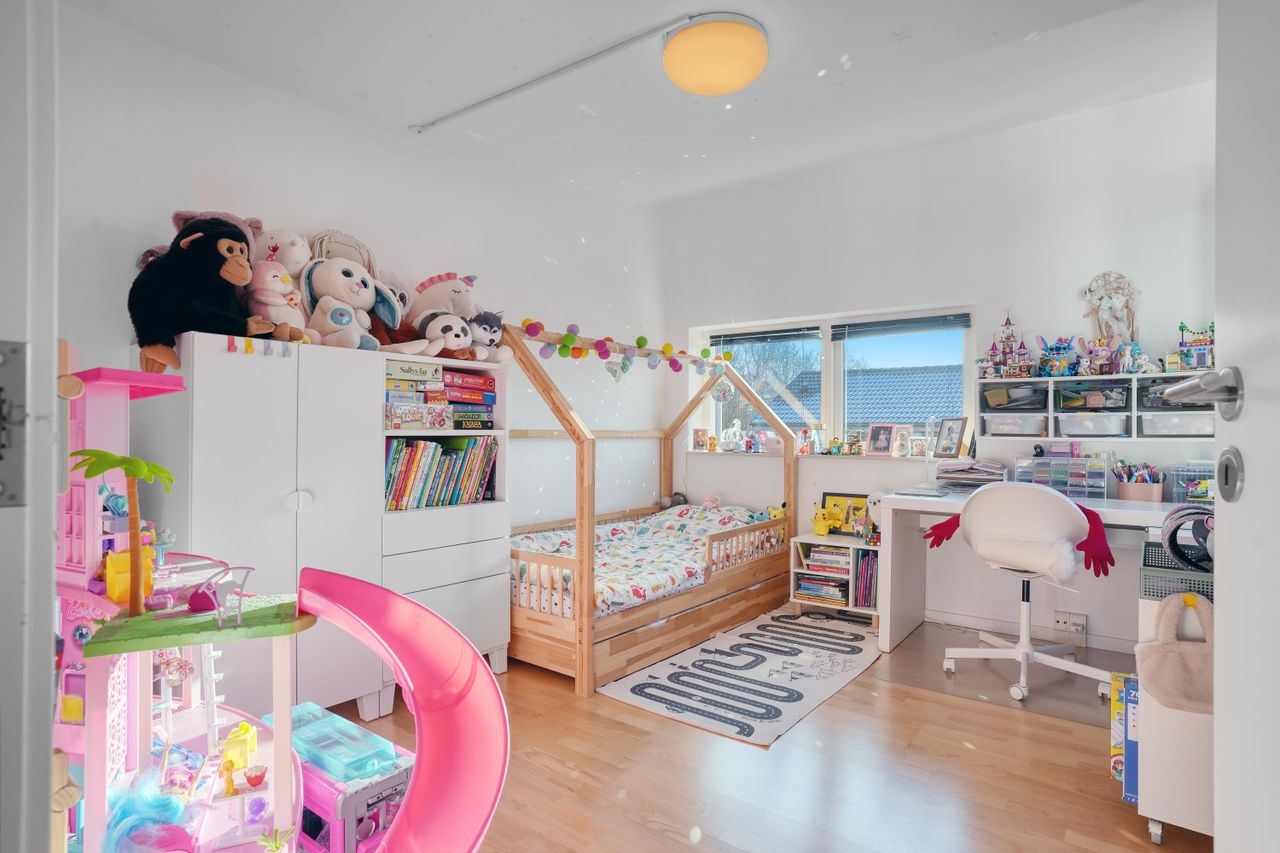 På førstesalen findes tre gode værelser. Fra forældreværelset er der udgang til en sydvestvendt altan – et skønt uderum til rolige stunder. Etagen rummer desuden et pænt badeværelse med bruseniche og stort vaskeskab, samt adgang til loftrum med god opbevaringsplads.