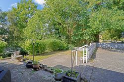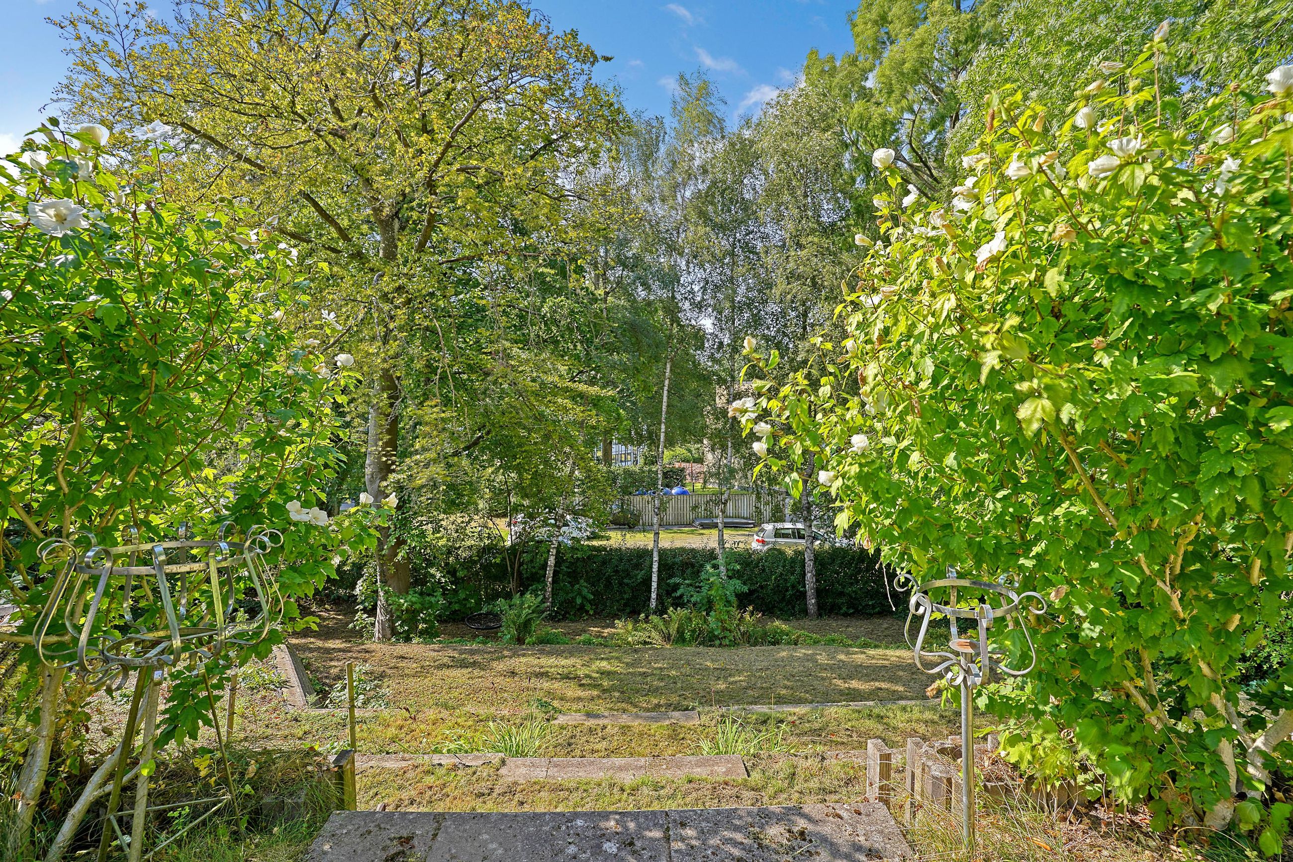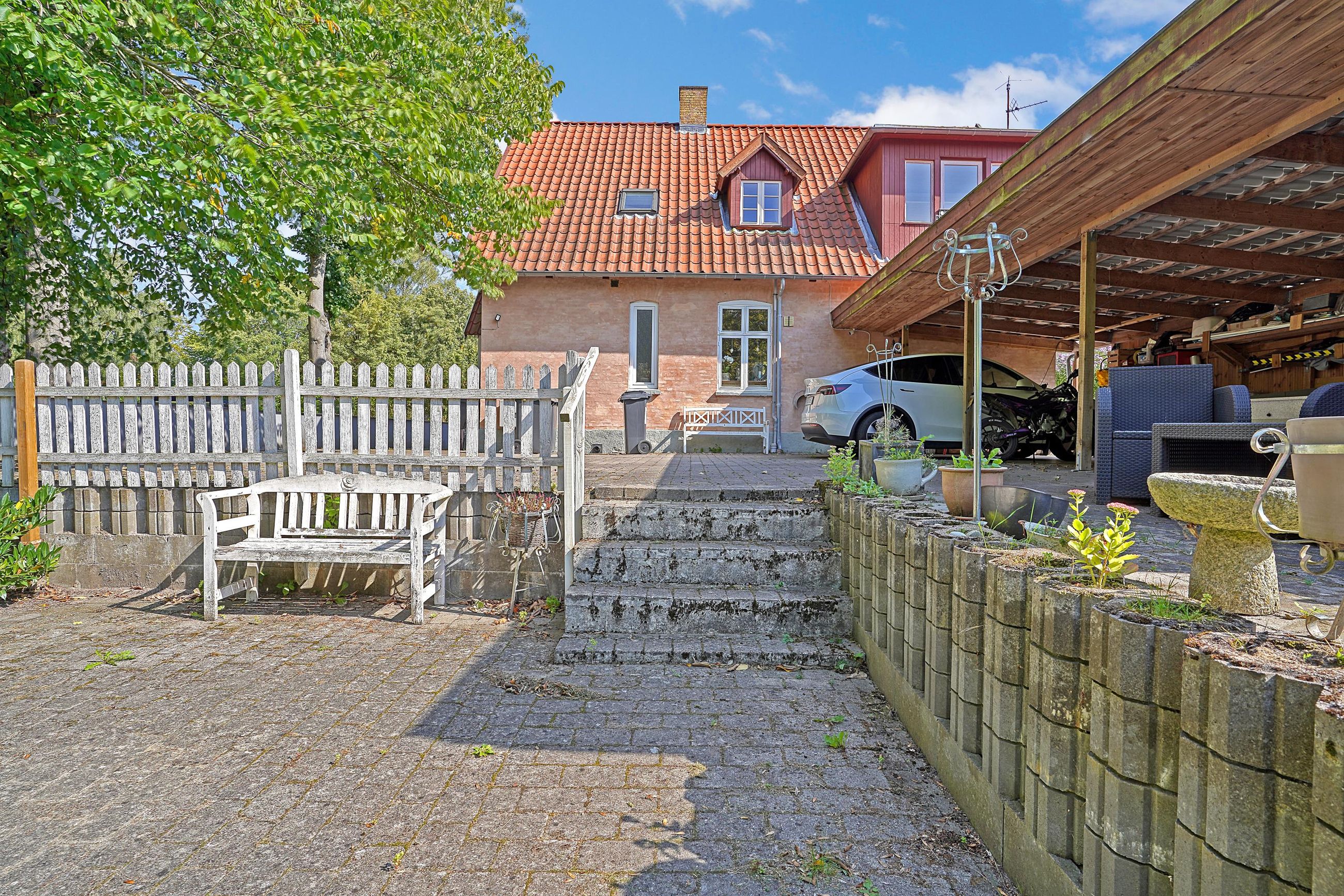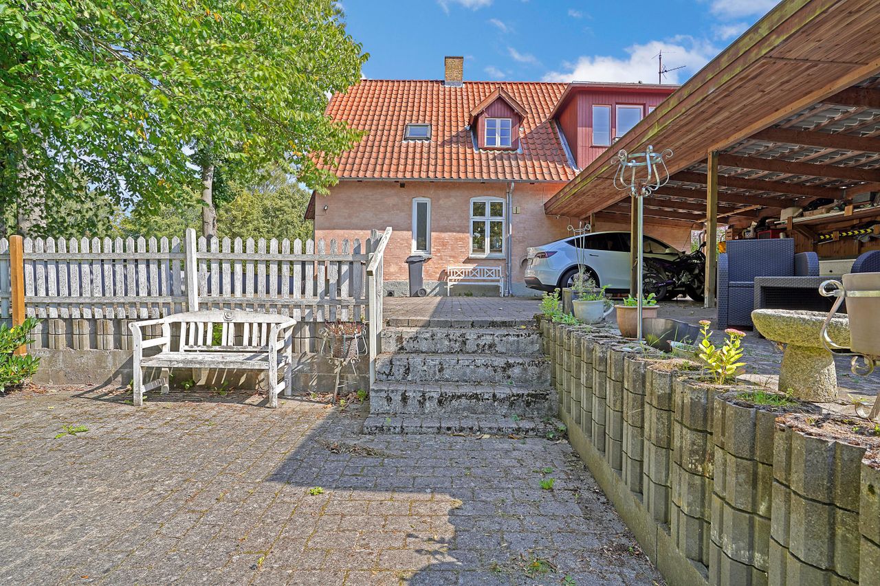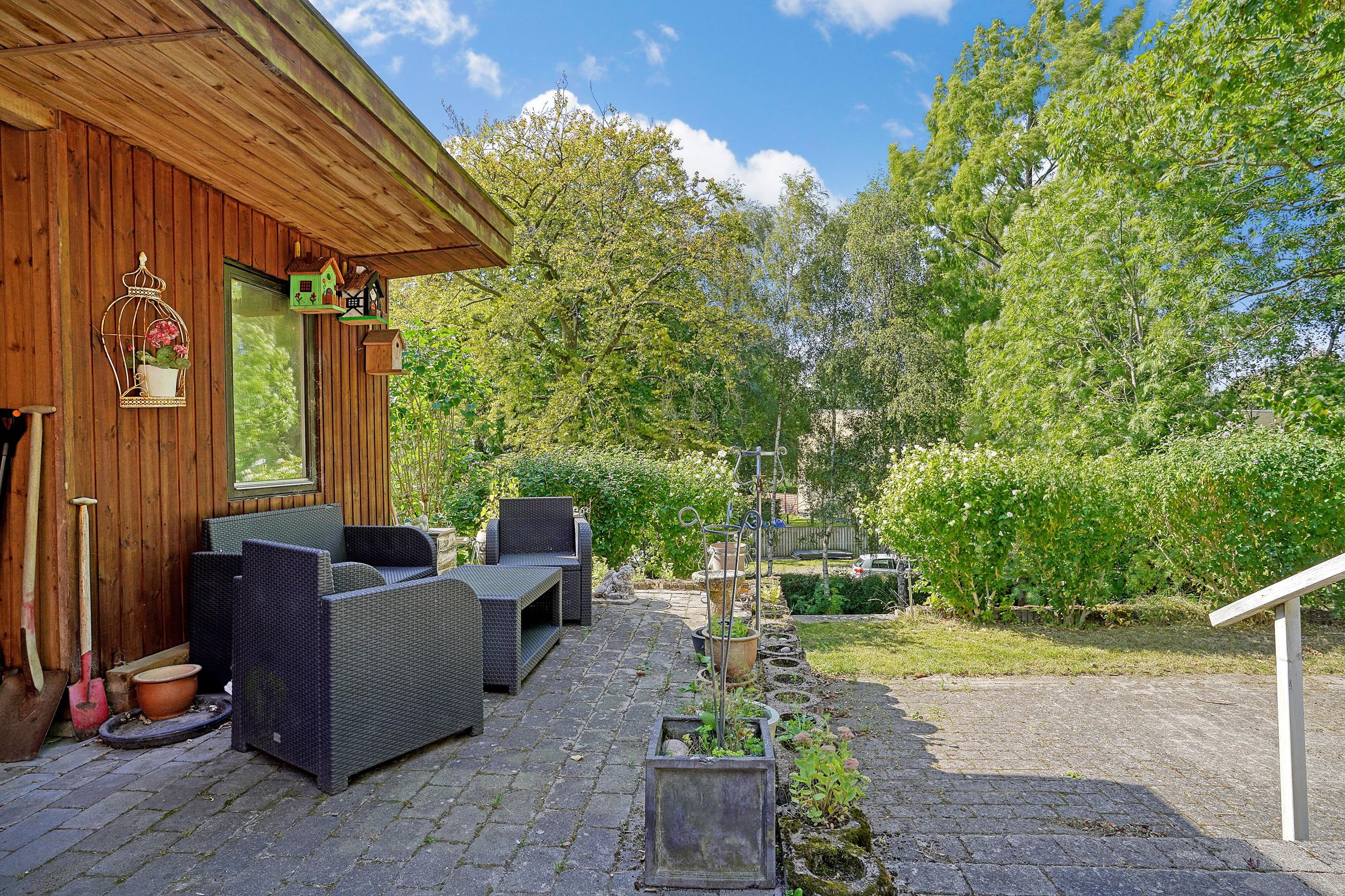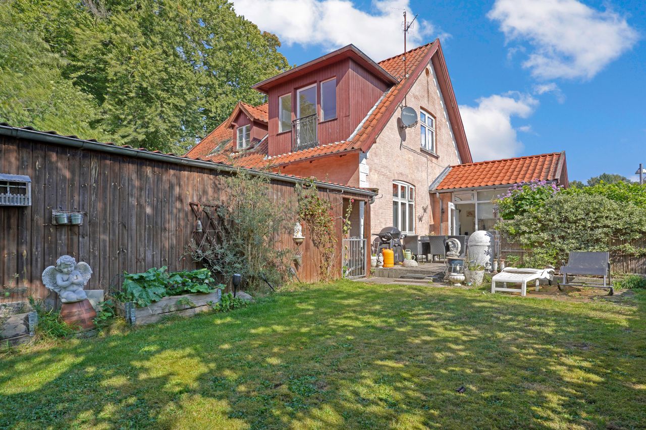Til villaen er her etableret stort skur med plads til cykler, haveredskaber og -maskiner. Her er plæner, terrasser og gamle, smukke træer samt sol gennem hele dagen.