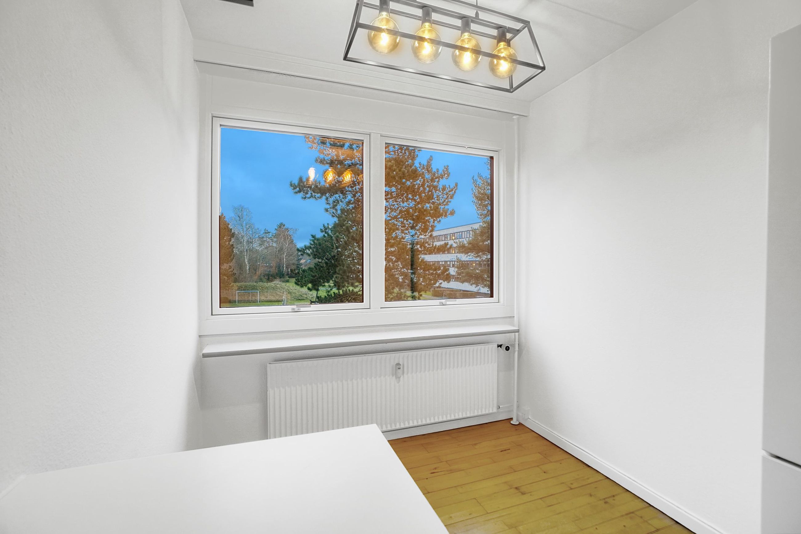 opvaskemaskine og kølefryse/-skab. Der er endvidere en spiseplads i køkkenet med udsigt til grønne