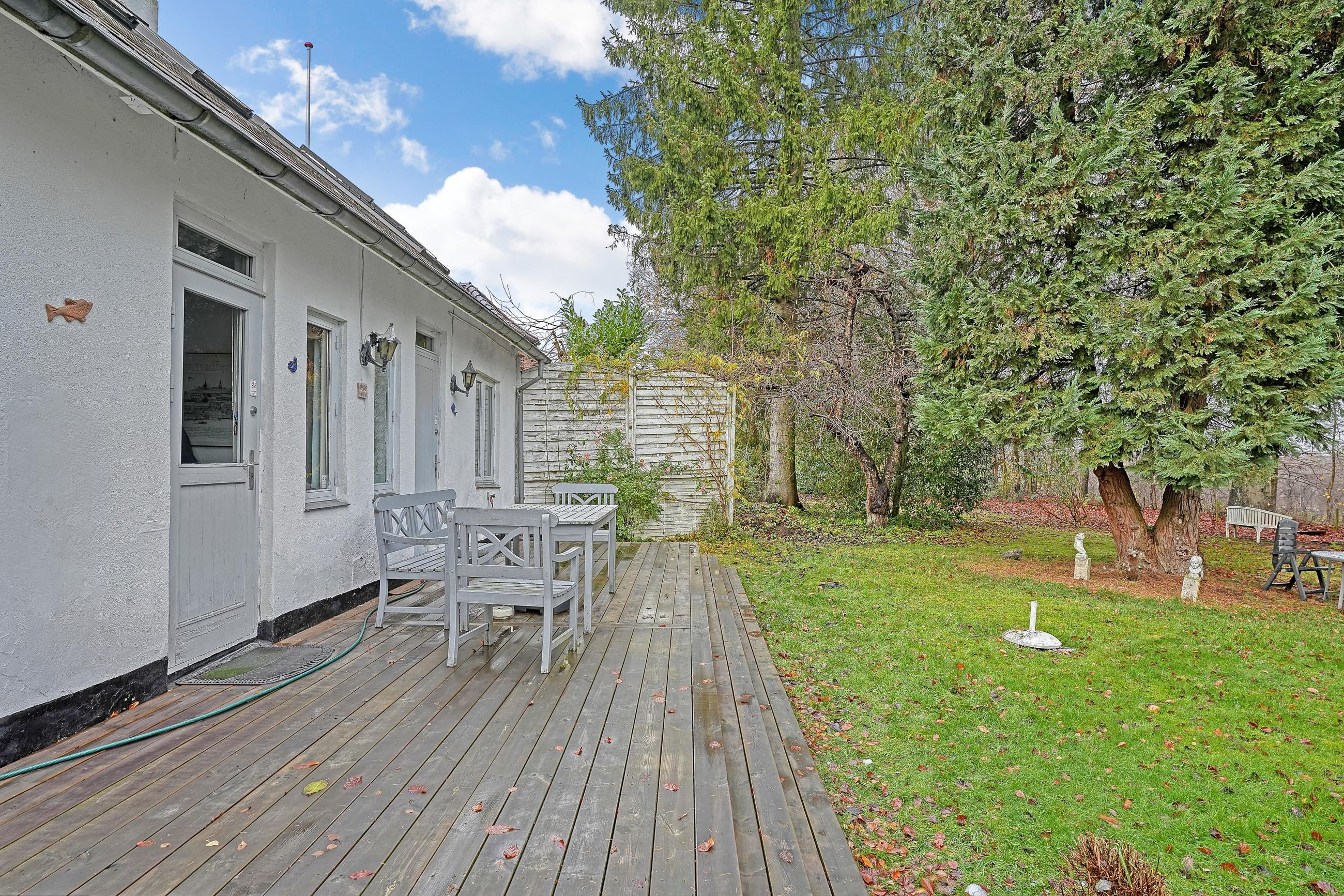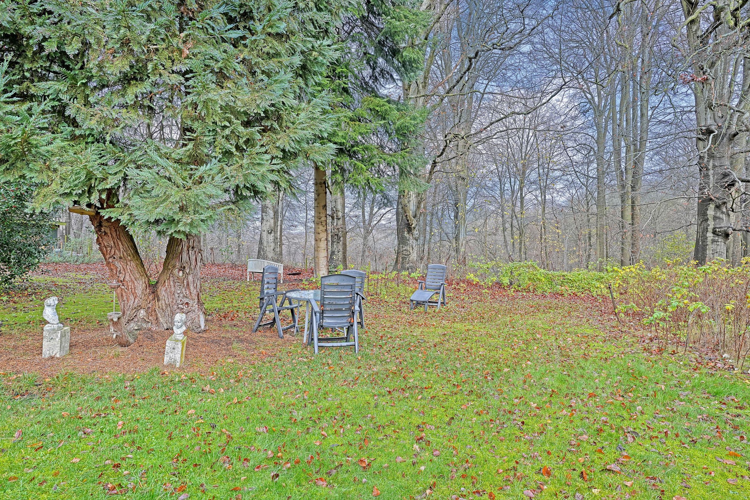 Haven er fantastisk dejlig med ældre beplantning og stor græsplæne direkte til skoven.