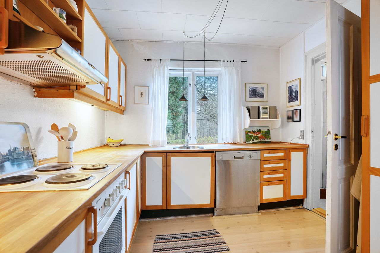 Man ankommer til ejendommen via indkørsel til gårdsplads. Ejendommen indeholder i stueplan møblerbar entre med trappe til 1. sal, åbent landligt køkken holdt i lyse farver som er i direkte forbindelse med spisestue. Opholdsstue, som kan opdeles i flere miljøer samt værelse/stue. Badeværelse. Der er fra stueplan 2 udgange til stor nyanlagt træterrasse (2024) hvor man har udsigten til haven og skoven.