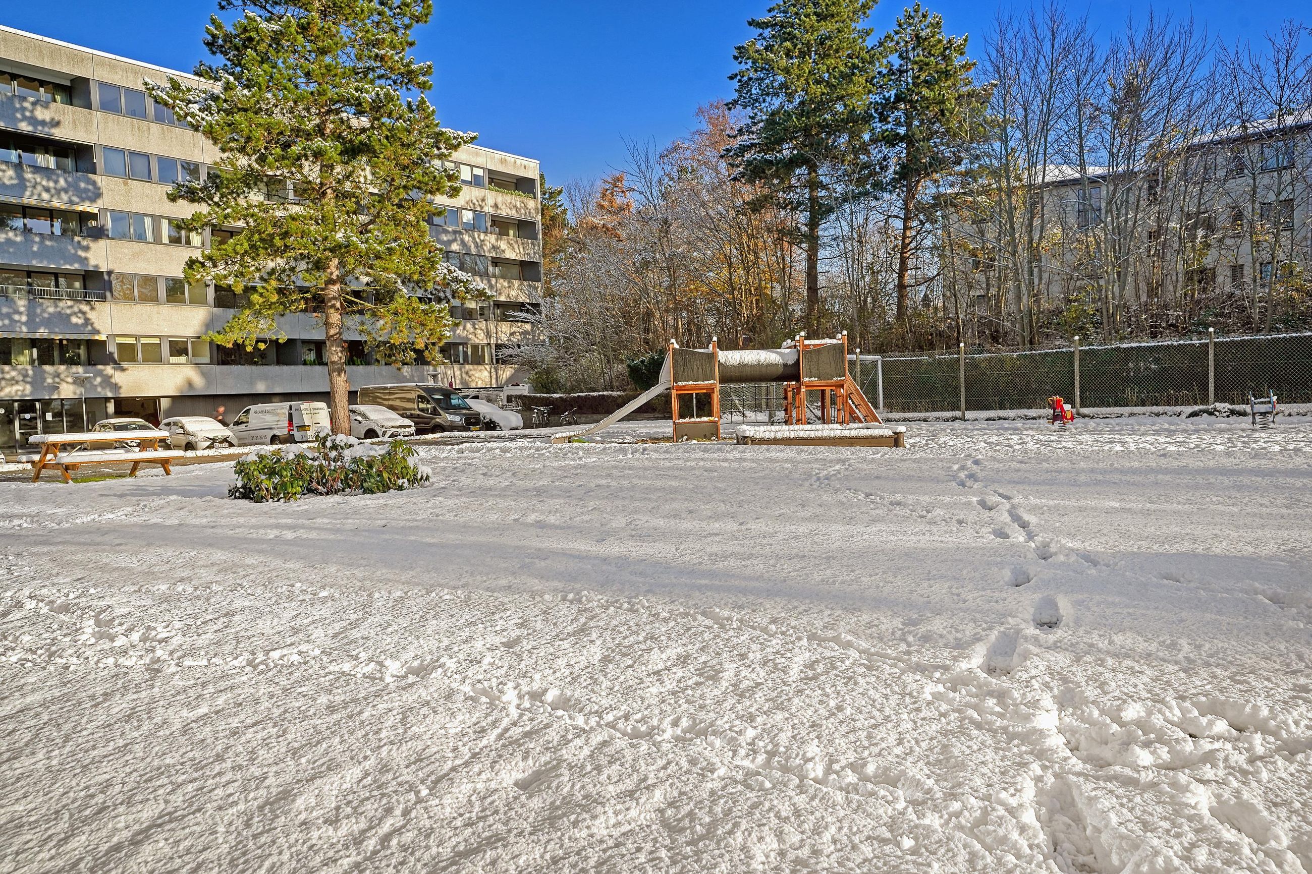 Bebyggelsen har store fællesarealer, parkeringspladser samt fællesvaskeri og brugsret til eget kælderrum.