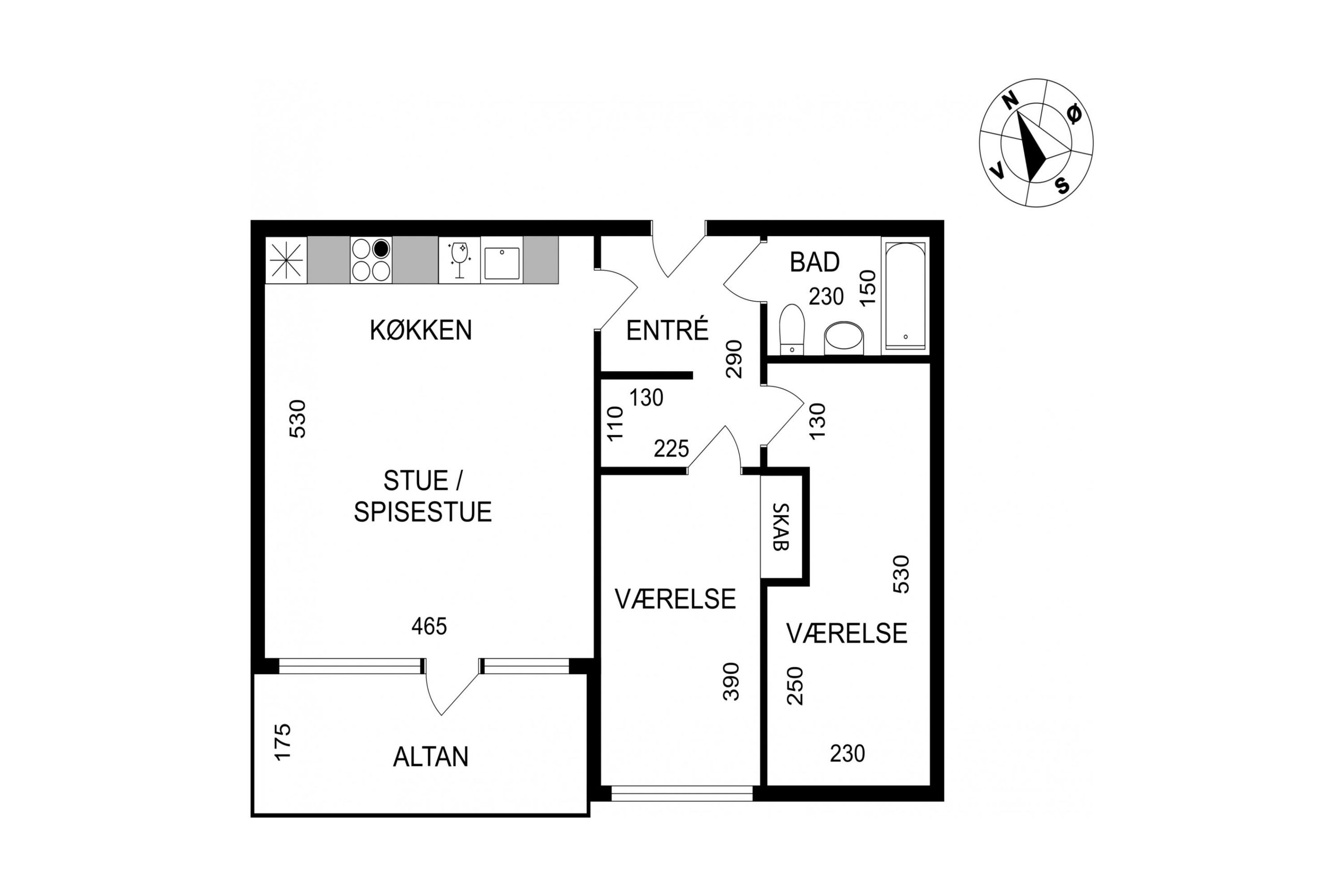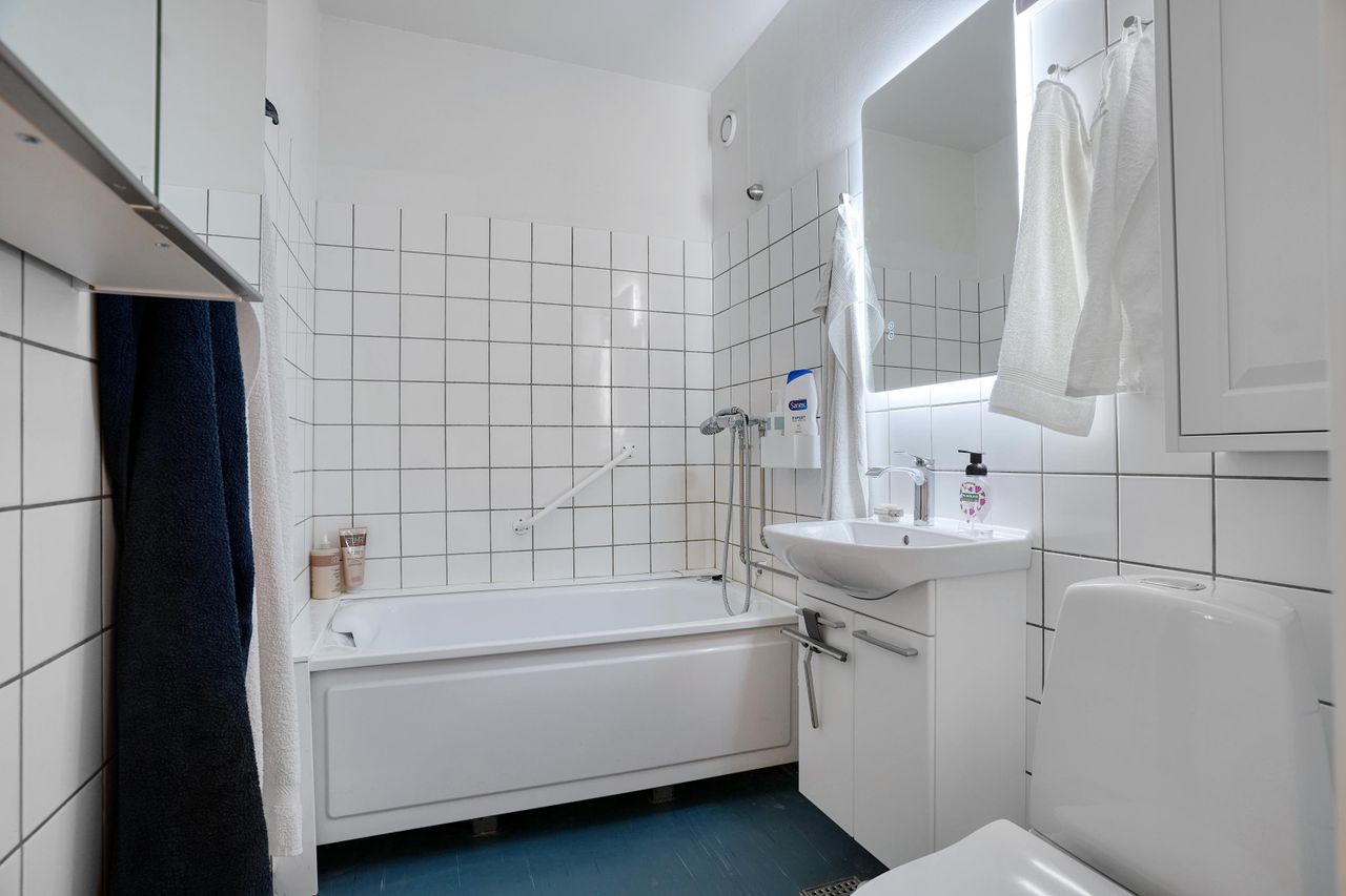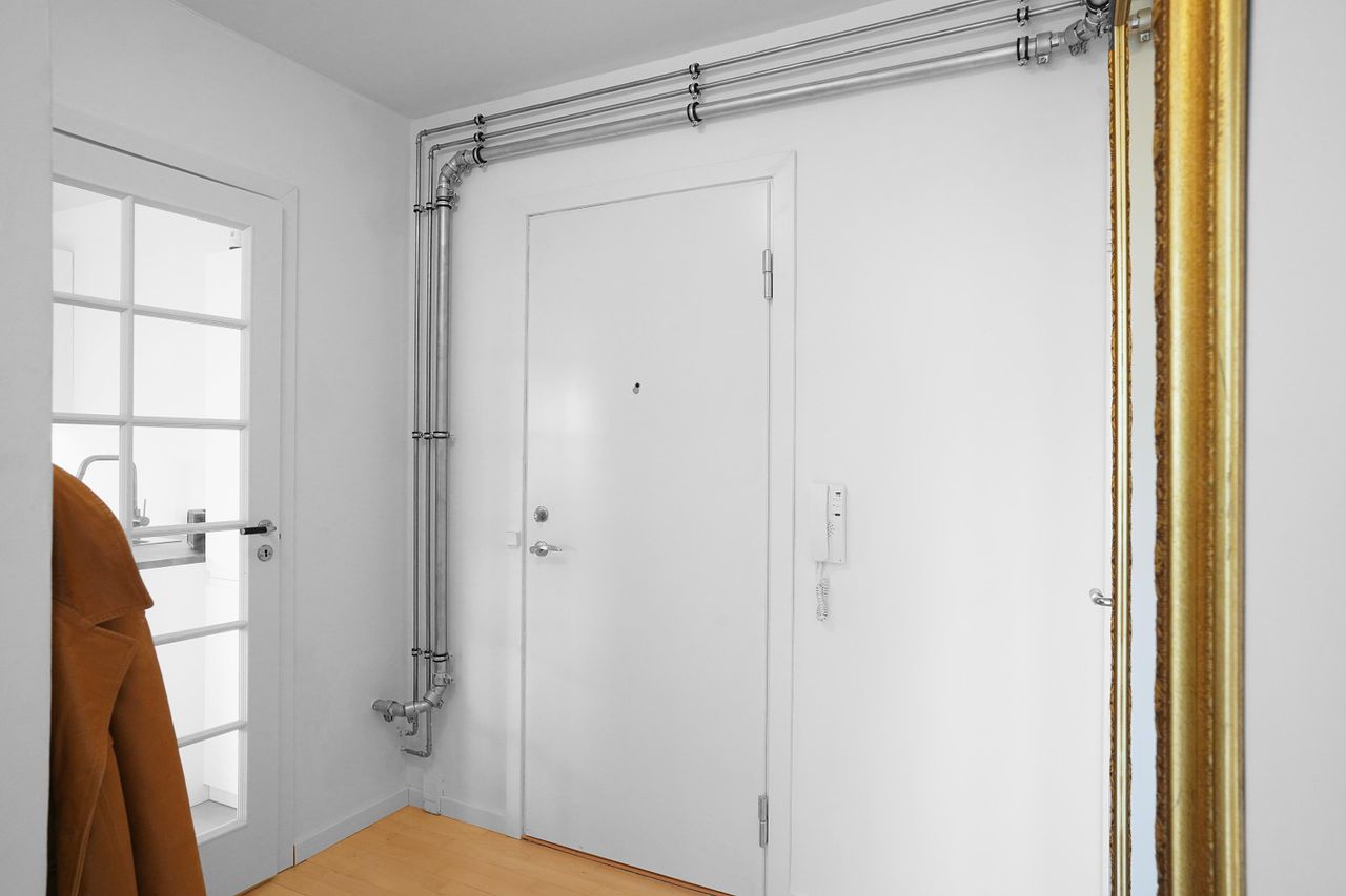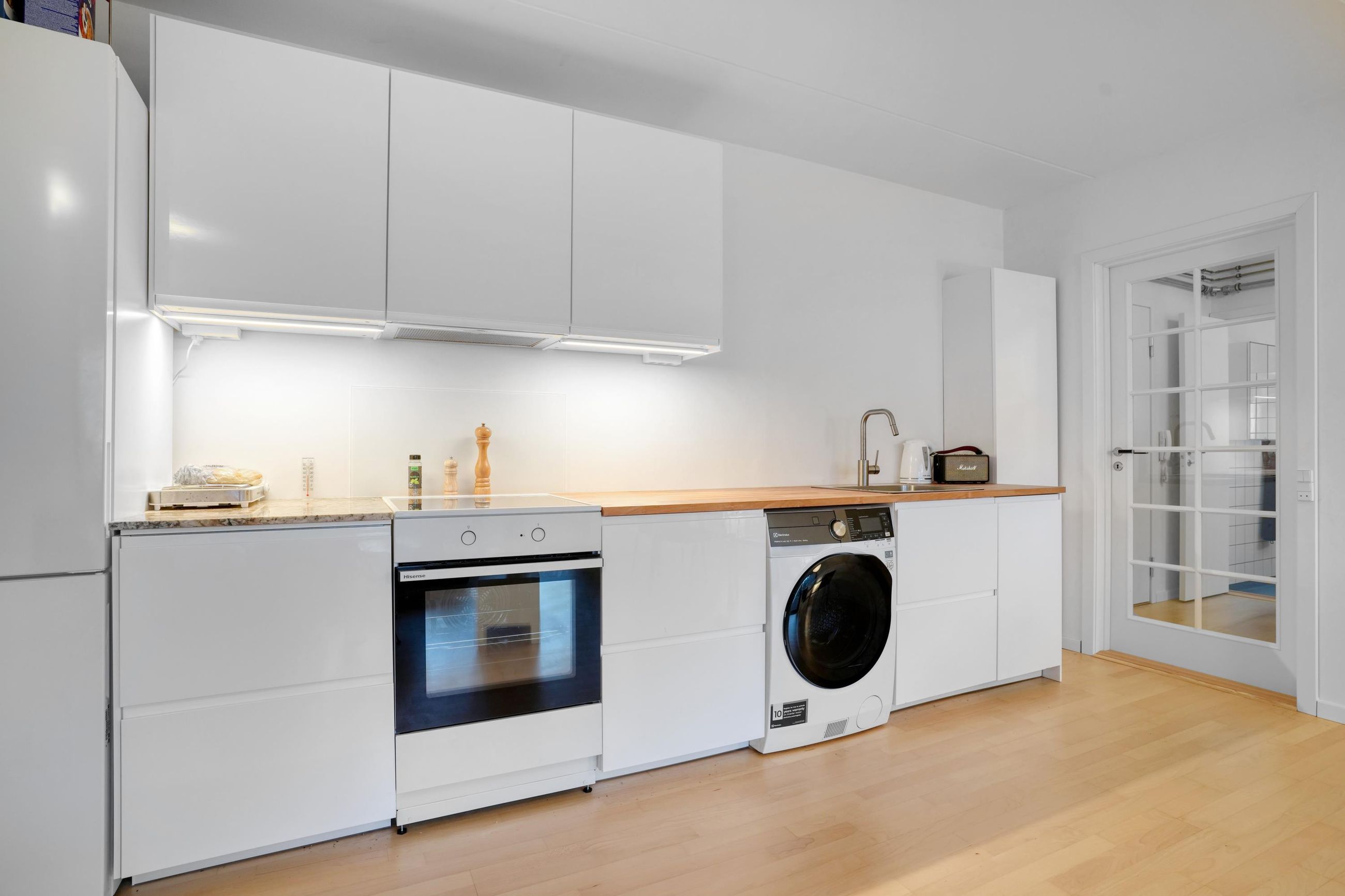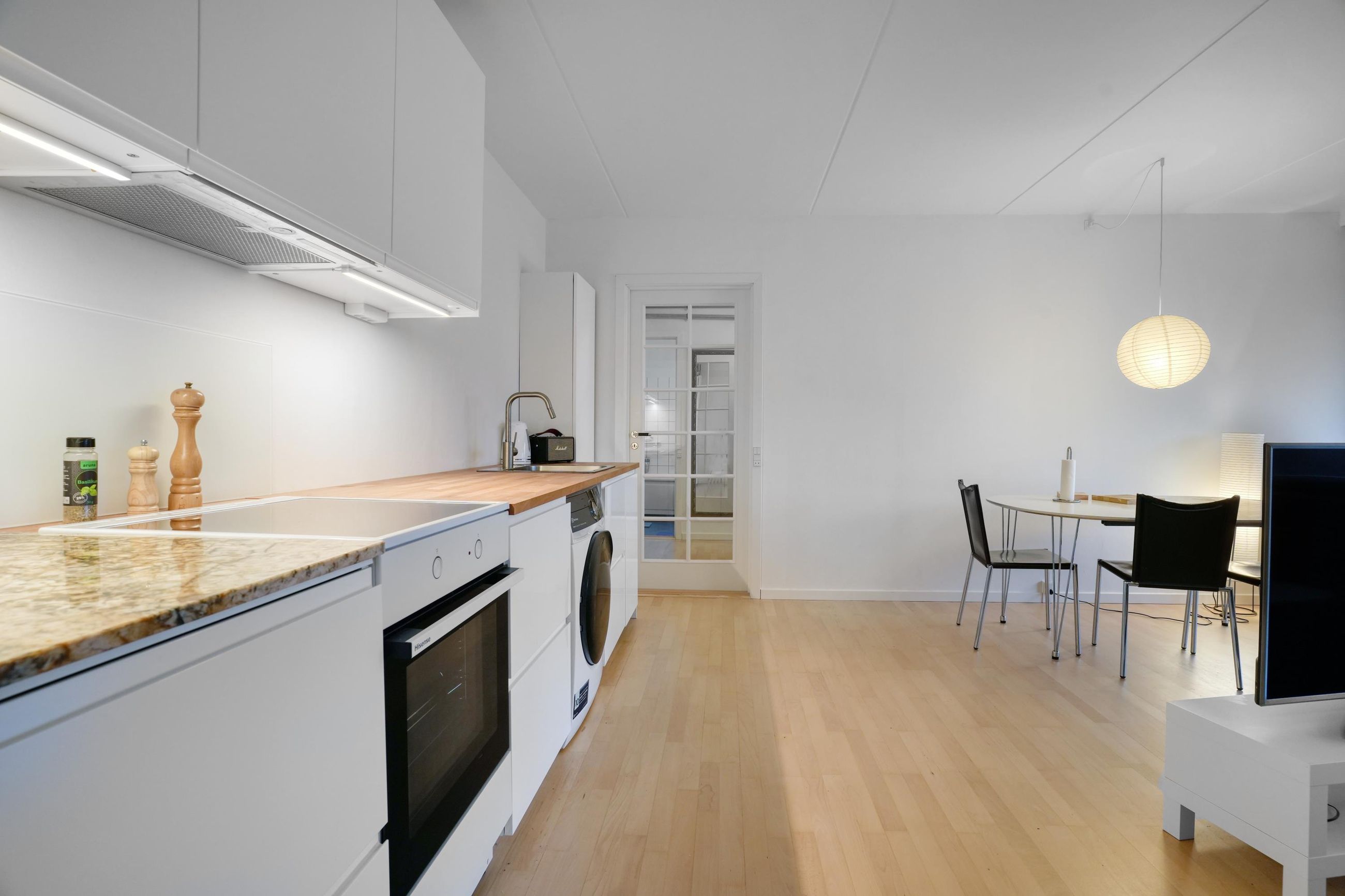 Man træder ind i en dejlig lys, New-York style entre med adgang til alle rum og glasdør til lejlighedens hjerte: Det unikke, store køkken/alrum med sollys, udsigt og skøn stor altan med markise. Der er valgt blande de bedste (klasse A) hårde hvidevarer, special skåret granit i orange-gnistret farve, der matcher den oliebehandlede, massive bøgetræs bordplade og bøgetræsparketgulvet. Fordi altan og stue er vestvendt, kan solskin nydes fra over middag til den går ned. Kombineret vask/tør er placeret i køkken i stedet for som vaskesøjle i badeværelse, hvilket giver plads til karbad muligt i det veludstyrede badeværelse.