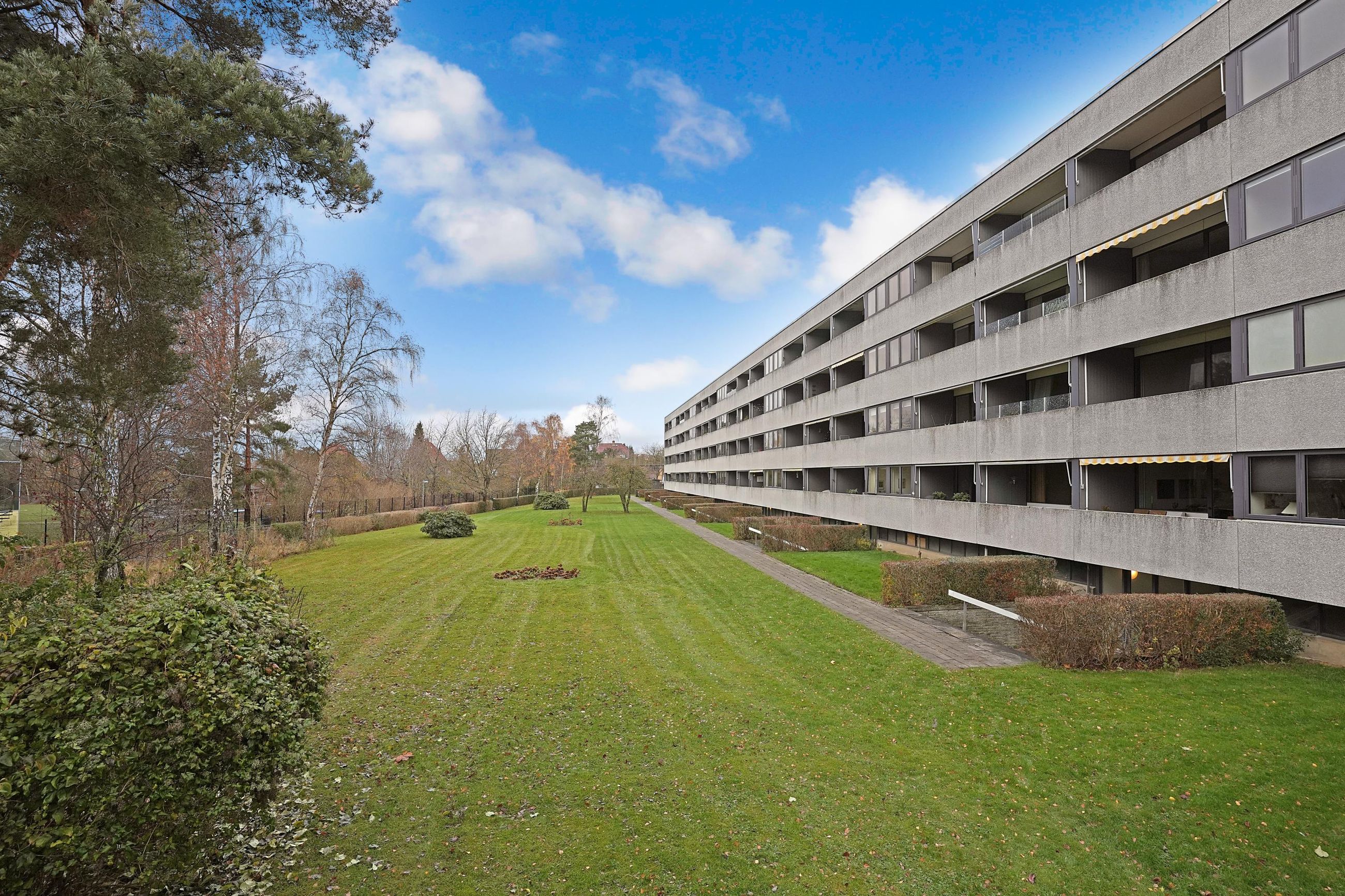 Bebyggelsen Hørsholm Park har store parkeringsarealer, fællesrum, kælderrum samt fællesvaskeri.