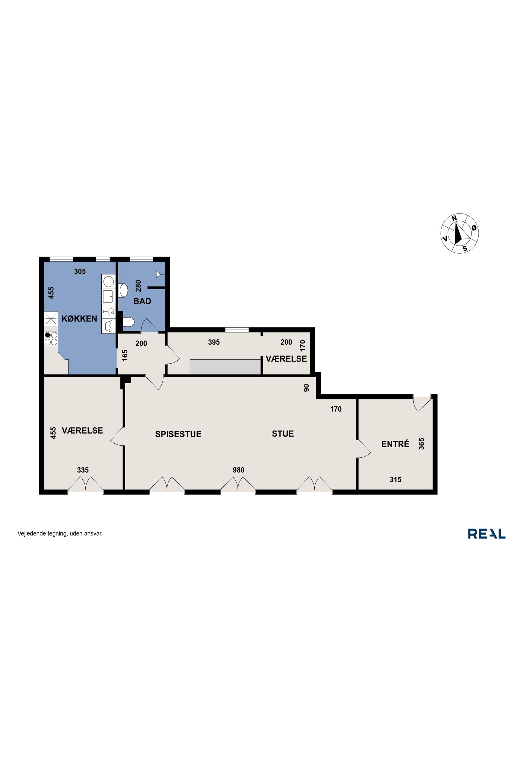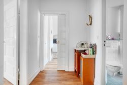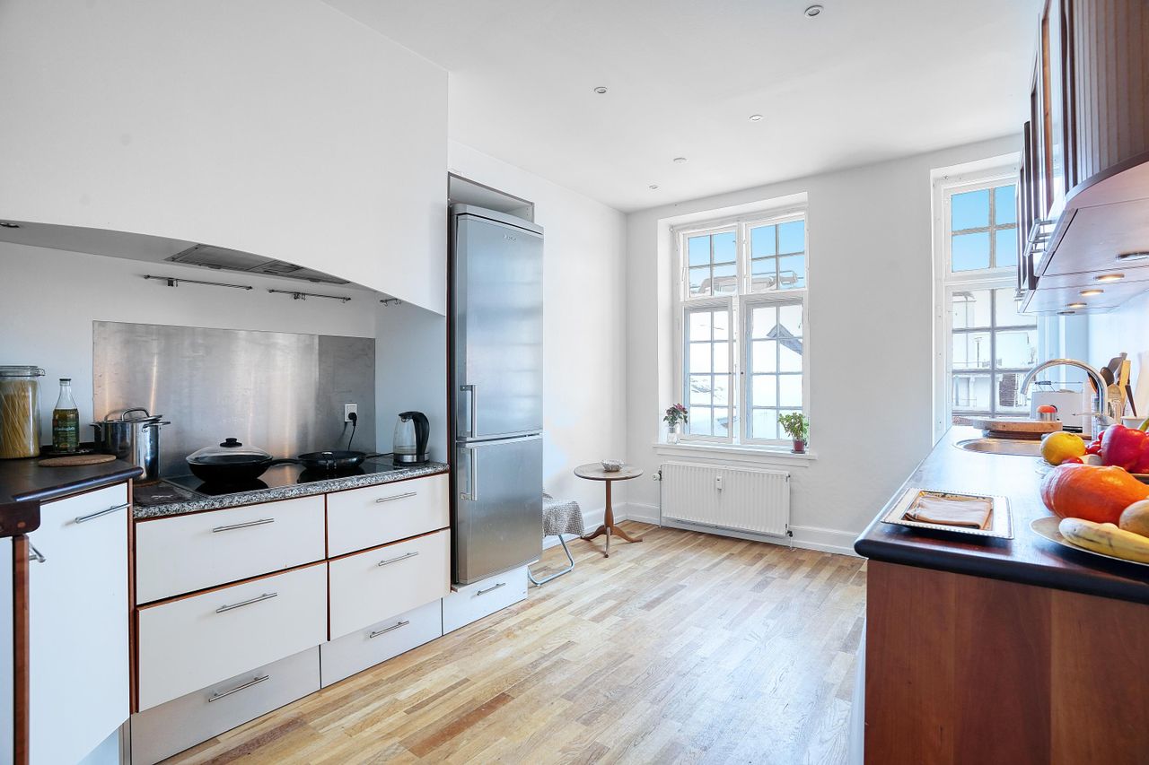 Lejligheden indeholder stor, hyggelig og lys forstue med fransk altan. Herfra kommer man direkte ind i den store stue med 3 franske altaner. Stuen har pga sin størrelse mange muligheder for indretning. Dejligt soveværelse også med fransk altan. Stort Svanekøkken med mulighed for spiseplads. Badeværelset som er istandsat i 2022 er lyst og med flot bruseniche. Desuden stort gangareal med masser af skabsplads og for enden et kammer, som i dag anvendes som arbejdsplads.