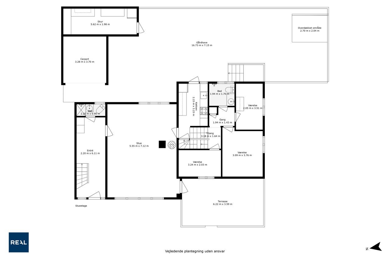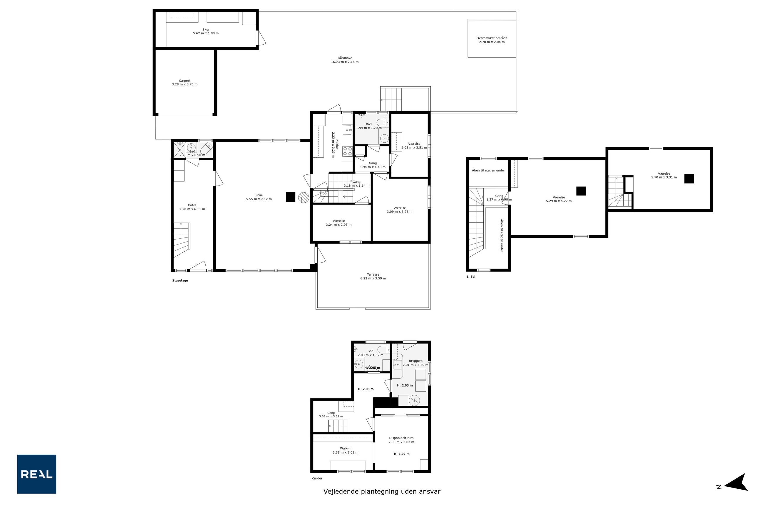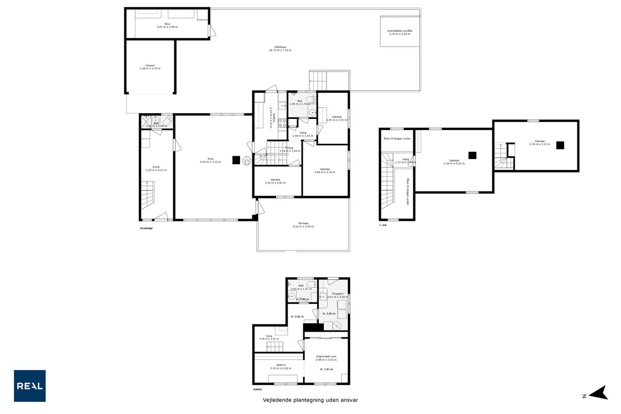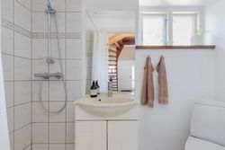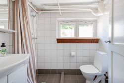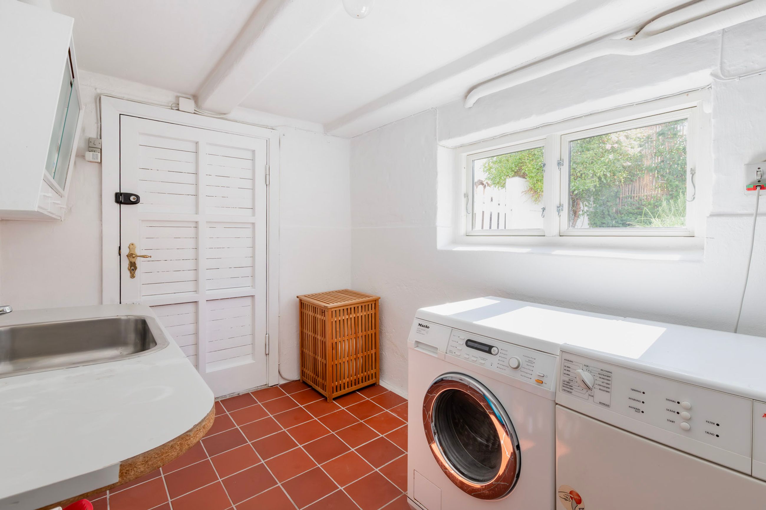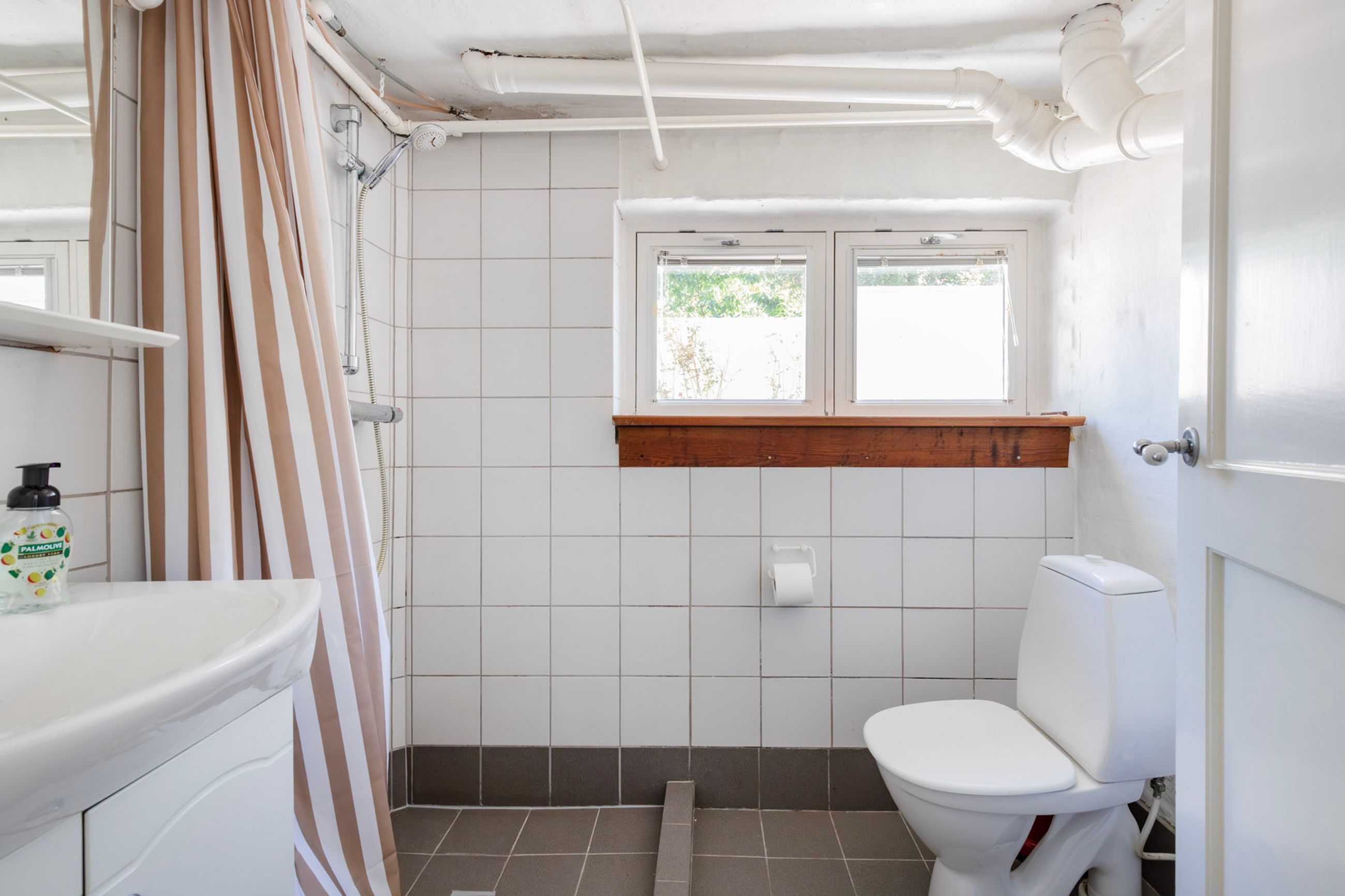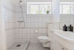 Huset byder på en rummelig og højloftet entré med et nydeligt badeværelse og trappe til et værelse. Herudover er adgang til ejendommens store og lyse stue med brændeovn og udgang til den store træterrasse og fine have. Den vender syd og vest og giver gode muligheder for solbadning og grillaftener. I forbindelse med stuen finder I køkkenet, hvor der ligeledes er udgang til en terrasse. Det er den hyggelige østvendte med masser af morgensol og udsigt til grønne haver. Det er også i denne ende af huset I finder endnu et badeværelse samt adgang til 4 gode værelser. I kan også tage trappen ned i den særdeles brugbare kælder med gode rum, vaskekælder, masser af opbevaringsplads samt endnu et badeværelse. Alle badeværelser har gulvvarme.
