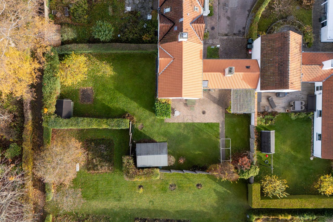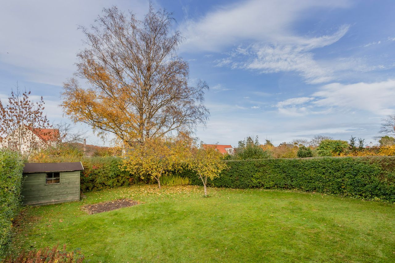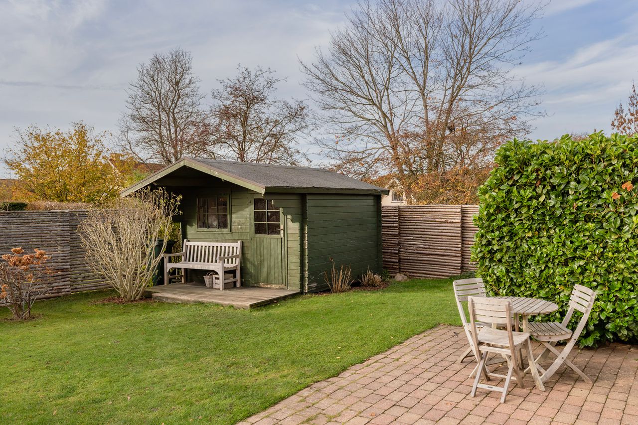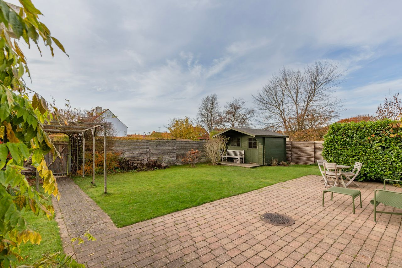 Haven falder I pladask for. Den ligger ugeneret mod syd og vest med overdækket terrasse, hvor I om sommeren kan tænde op i grillen og se solen gå ned bag træerne i Geelskov. I haven er der et skur/anneks til haveredskaber foruden den charmerende beplantning med æbletræer, hortensia, koreakornel, hibiscus og blåregnen der blomstrer smukt om sommeren. Hvis ikke haven giver nok plads at boltre sig på, så er der havelåge lige ud til et hyggeligt fællesareal og til områdets hyggelige stisystemer.