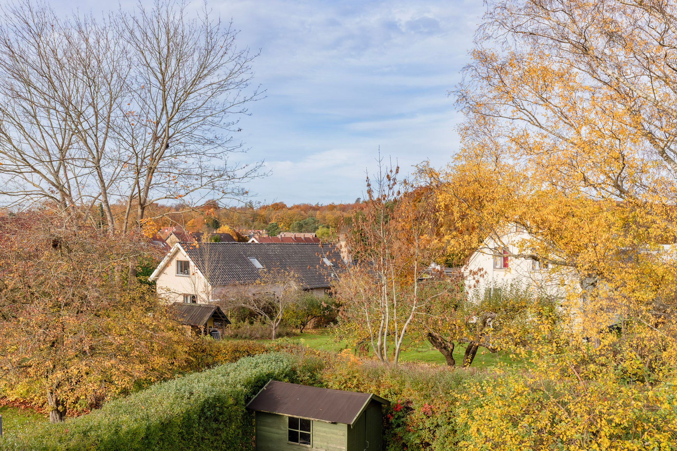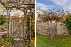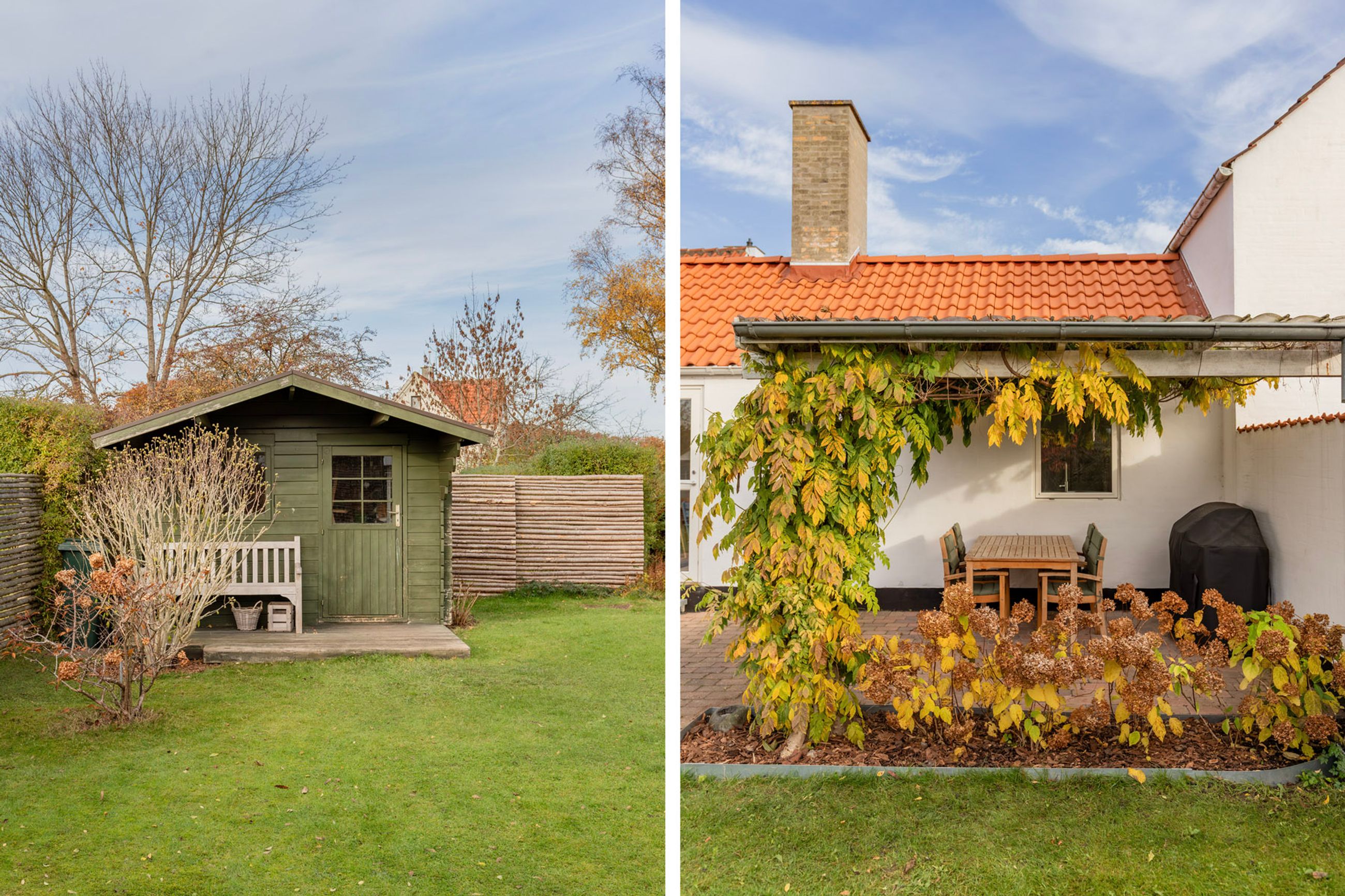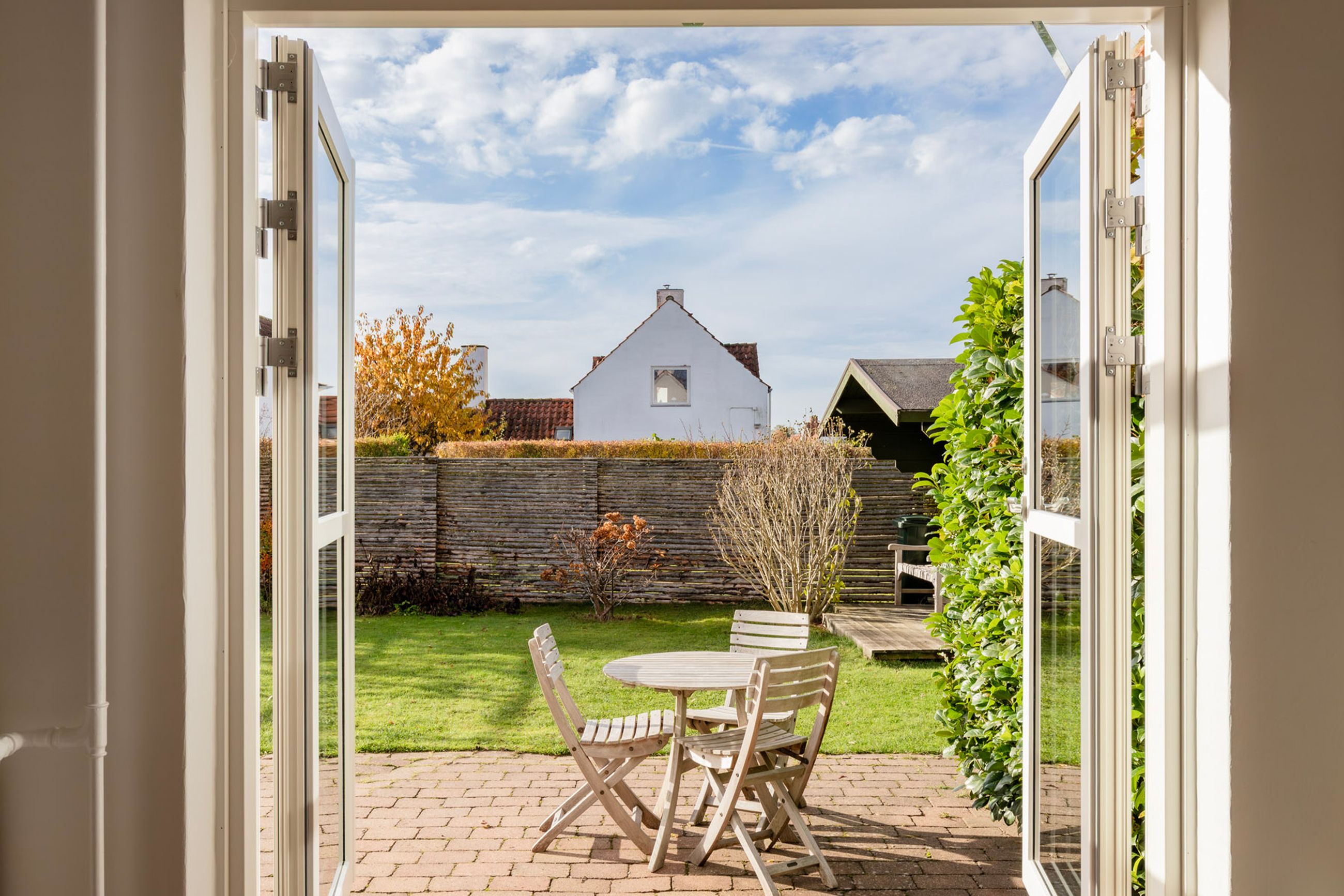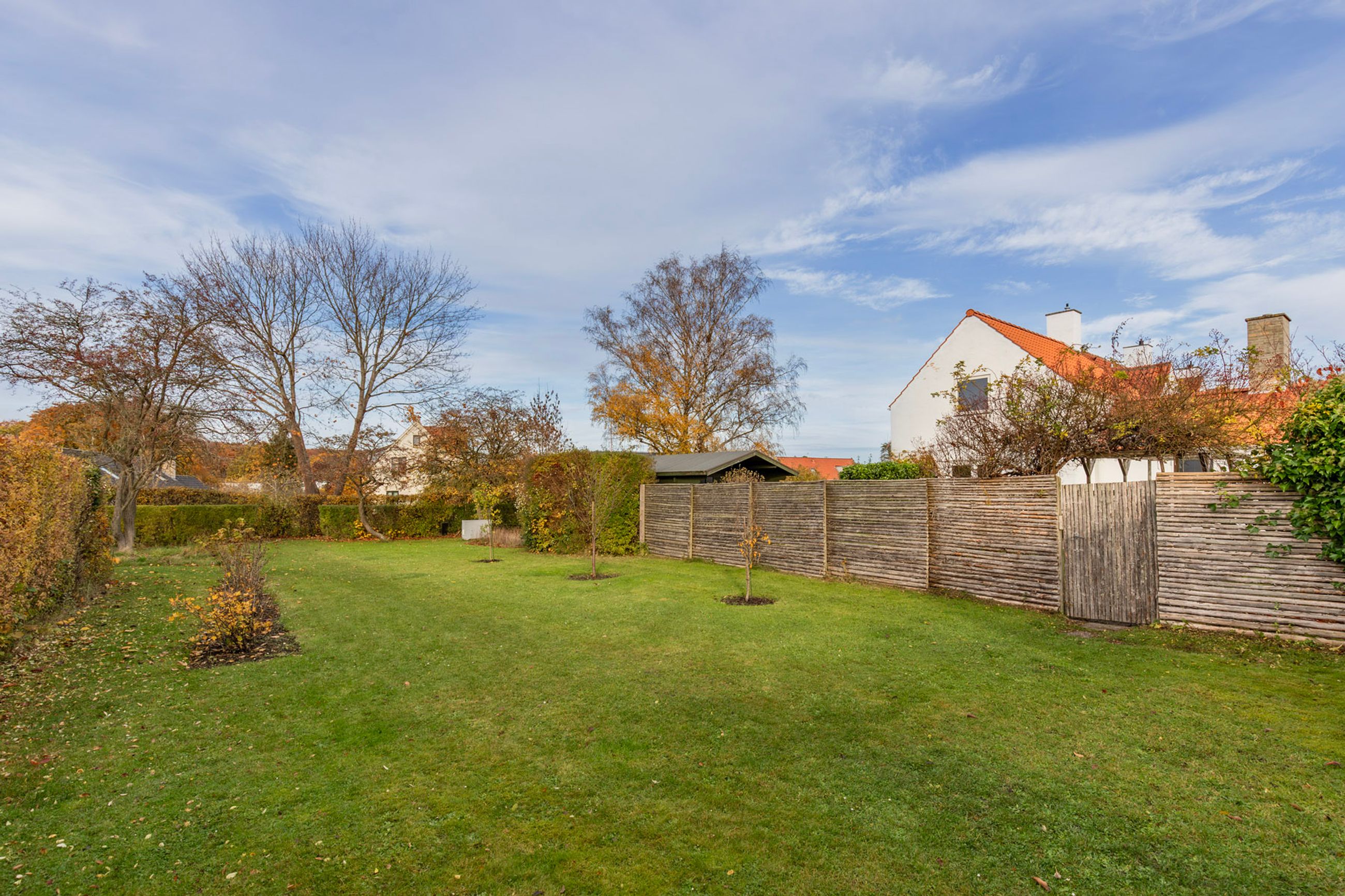 Haven falder I pladask for. Den ligger ugeneret mod syd og vest med overdækket terrasse, hvor I om sommeren kan tænde op i grillen og se solen gå ned bag træerne i Geelskov. I haven er der et skur/anneks til haveredskaber foruden den charmerende beplantning med æbletræer, hortensia, koreakornel, hibiscus og blåregnen der blomstrer smukt om sommeren. Hvis ikke haven giver nok plads at boltre sig på, så er der havelåge lige ud til et hyggeligt fællesareal og til områdets hyggelige stisystemer.
