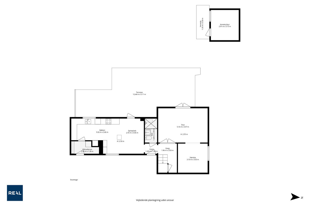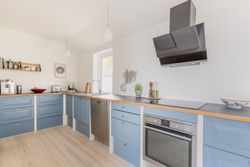 Ejendommen byder på to indgange. En hovedindgang med plads til sko og overtøj samt en indgang til et praktisk bryggers med plads til vaskemaskine, barnevogn og andre småting. Dejligt lyst køkken-alrum med gulvvarme og udgang til den hyggelige terrasse og haven. Nuværende ejer har moderniseret køkkenet med bl.a. ny bordplade og opdaterede fronter, så det fremstår indbydende og i god stand. Badeværelset er nydeligt med pæne fliser, bruseniche og ovenlysvindue. Herudover byder stueplan på en rummelig stue med plads til både sofa og et ekstra spisebord, hvis ikke man synes der er plads nok i køkkenet. Stuen hænger sammen med et værelse der kan benyttes som man ønsker det. Det kan både være en del af stuen, men kan også sagtens være et separat værelse. Fra stuen er der udgang til den store charmerende have der både vender mod syd og vest. Der er masser af sol og luft til at udfolde sig.
