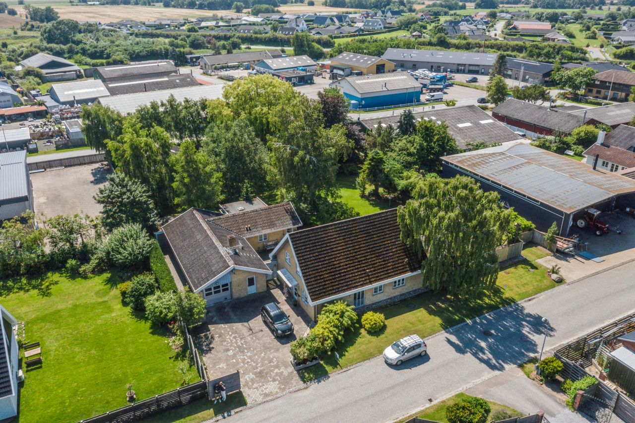 OMRÅDET:Beliggende på en af de rolige veje centralt i Gillelejes industrikvarter. Har får man gå/Cykelafstand til: transport, et stort udvalg af fritidsaktiviteter, skole, Biograf, et væld af supermarkeder, shopping, Den dejlige havn, havet og sidst men ikke mindst 3 helt ubeskriveligt smukke gå/cykelruter - Gilbergstien, Fyrstien, Kanalstien. Et lokalmiljø hvor man virkelig kommer hinanden ved! EJENDOMMEN:Den samlede ejendom består af en stor og sund muret villa på i alt 180 kvm. i 1½plan. En muret erhvervsbygning på 145 kvm. med bl.a. et stort værksted med højt til loftet og støbt gulv samt en afdeling, som vil være oplagt til eks. liberalt erhverv. En 178 kvm stor erhvervsbygning/hal, hvor en del af den er frostfrit område.Udhus på 40 kvm. Rigtig gode parkeringsforhold.Bygningerne ligger på en stor og frodig grund - tidl. 2 matrikler - rundt om en fantastisk dejlig have med flotte store træer og ugeneret terrasse hygge og solsteder. INDRETNINGEN:Villaen indeholder: Stor entre med meget skabsplads og klinkegulv. 2 store værelser med skabe. Stort badeværelse med muret bruseniche, bord med vask og skabe, vaskesøjle samt flot klinkegulv med varme. Kontor med skabe. Hyggeligt køkken/alrum med gedigne køkken elementer i træ og god spiseplads i alrummet. Adgang til skøn velisoleret udestue, hvorfra der er udgang til den dejlige terrasse samt den skønne have. Stor entre/gang med god trappe op til 1. sal, som har en meget stor opholdsstue samt endnu et værelse med skabe og et badeværelse med bruseniche. GENEREL STAND:Dette er en velholdt og velpasset ejendom med rigtig mange muligheder, hvis man gerne vil bo ved siden af sit erhverv. Det ligger centralt, men det føles absolut ikke sådan. Kom selv og oplev det!