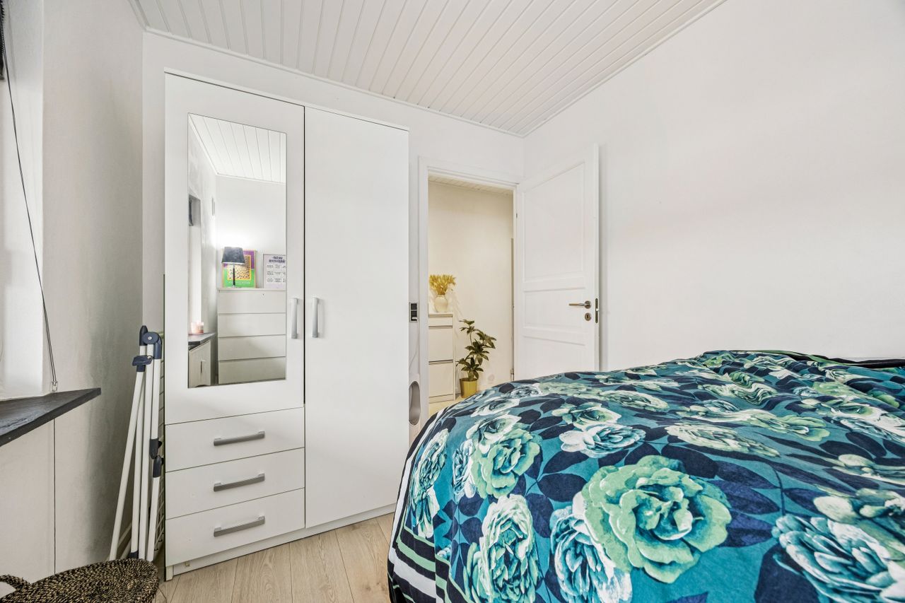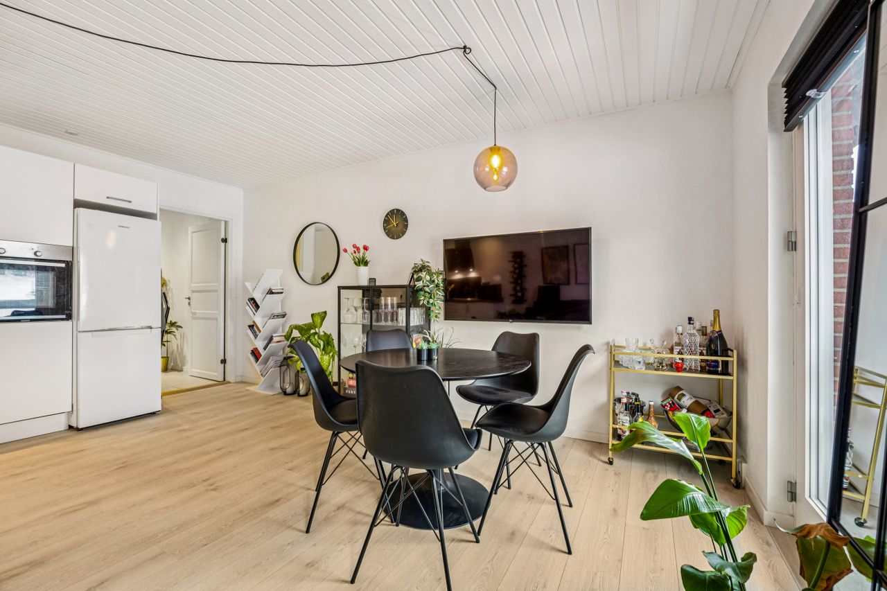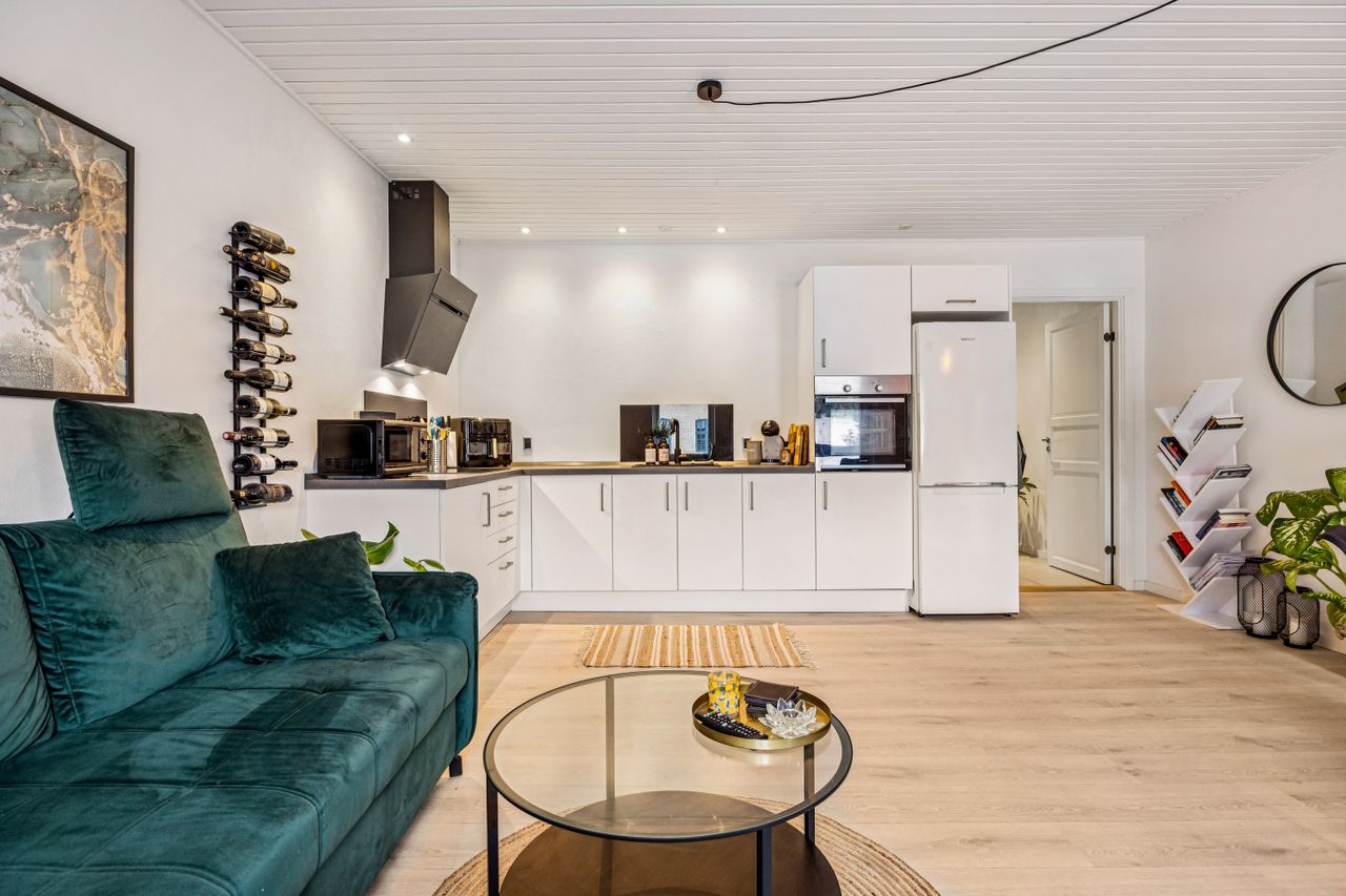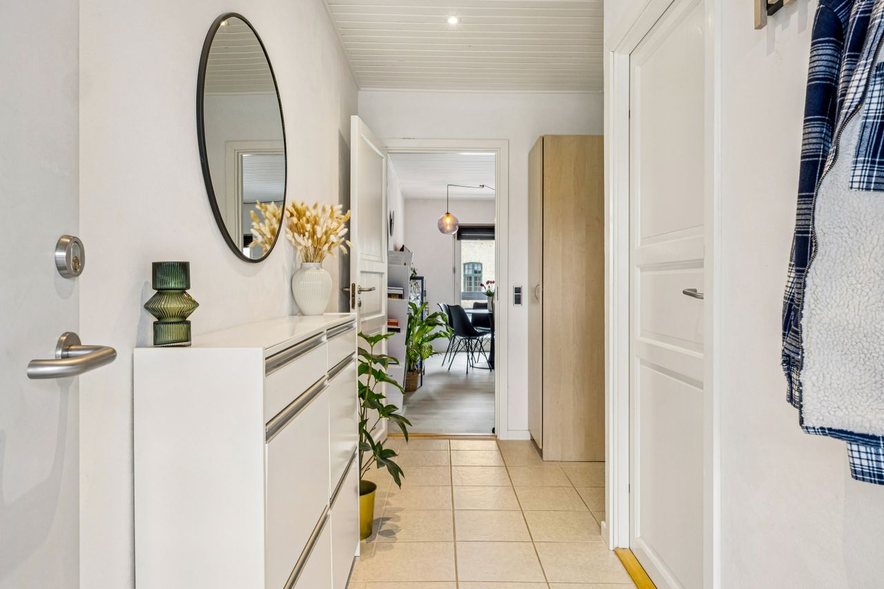 Lejligheden byder på en rummelig entré med god plads til overtøj, et stilrent badeværelse i tidssikre materialer samt et dejligt soveværelse med fin indretning og naturligt lysindfald. Det store opholdsrum kombinerer køkken og stue i ét – perfekt til både hverdagsliv og hyggelige aftener. De store vinduespartier giver et flot lys og skaber en åben og luftig fornemmelse.