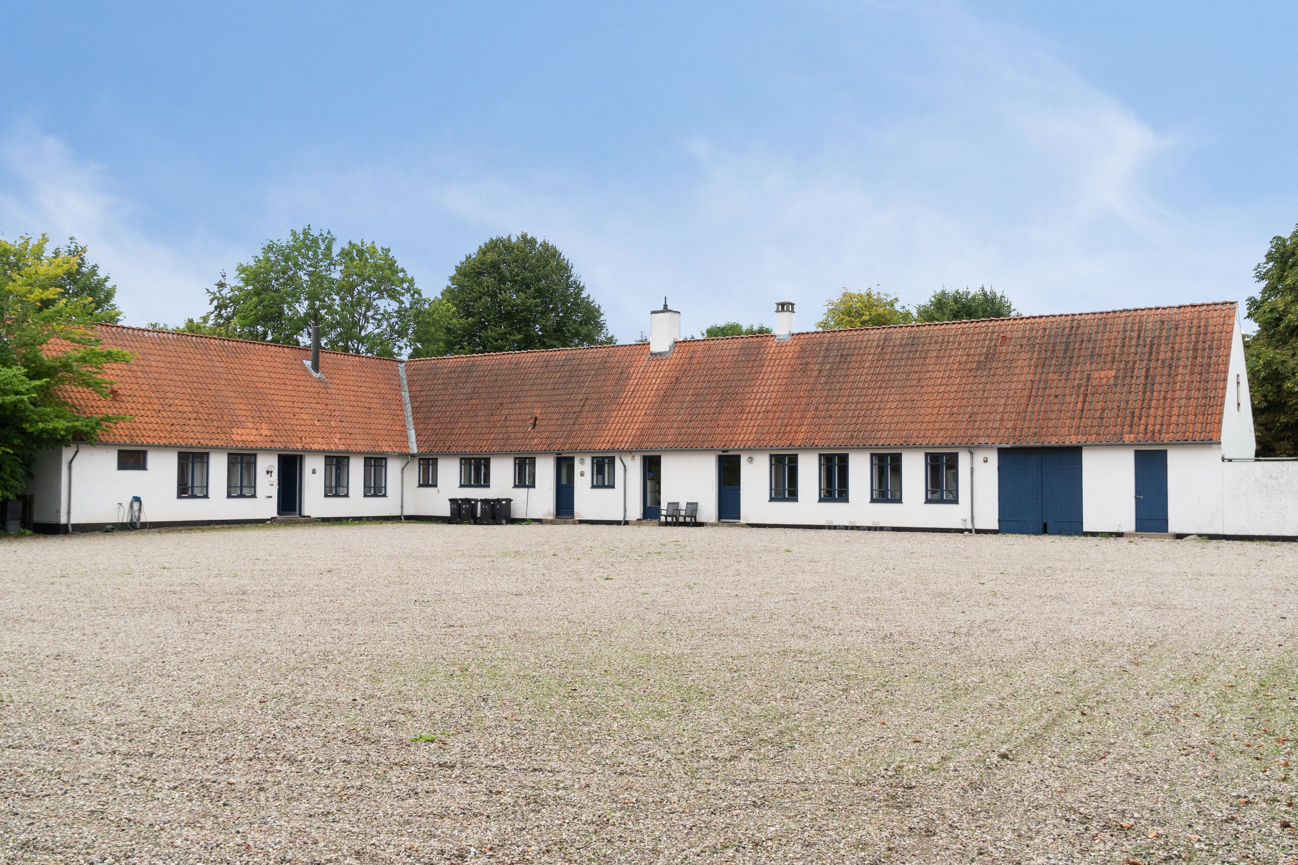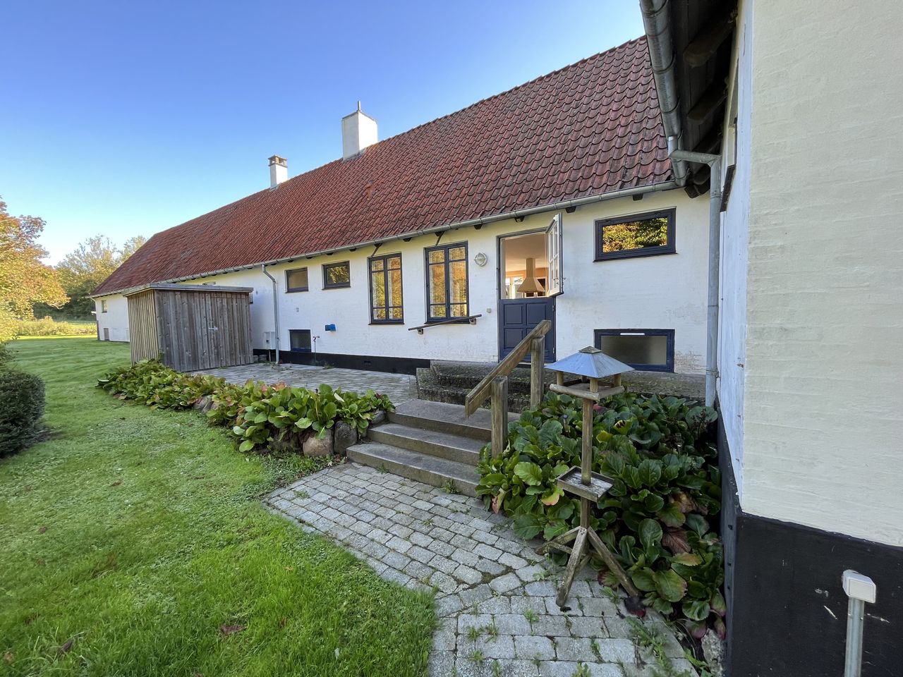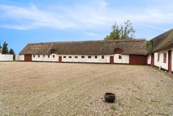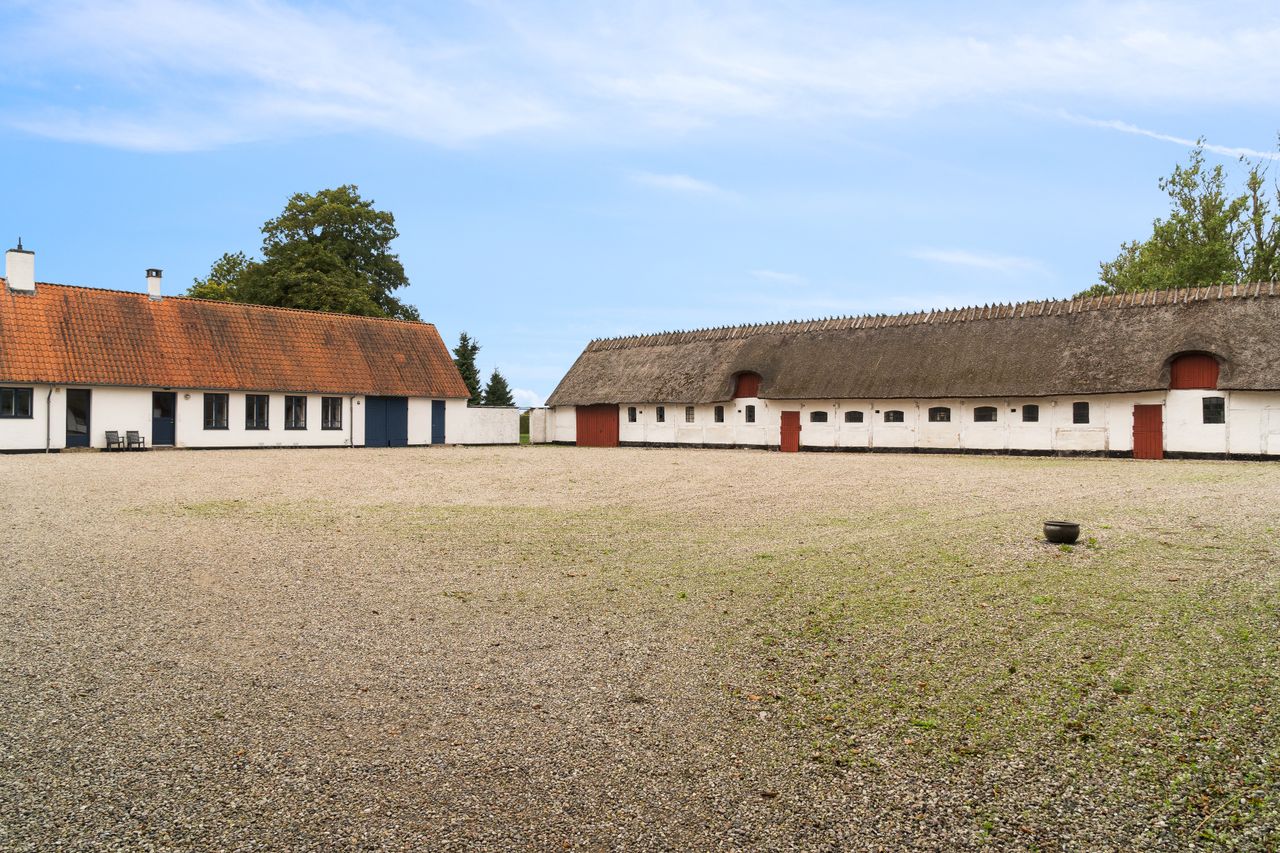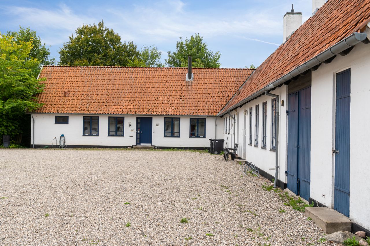 Hovedhuset imponerer med sine to længer og første sal, hvor flotte detaljer, højt til loftet og sildebensparketgulv giver en følelse af elegance og historie. Den smukke, hvide facade med rødt tag og mørkeblå detaljer gør huset særdeles indbydende udefra, og den store, grusbelagte gårdsplads indbyder til festlige stunder og samvær.