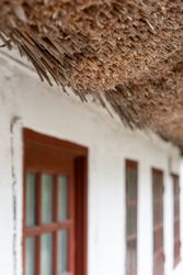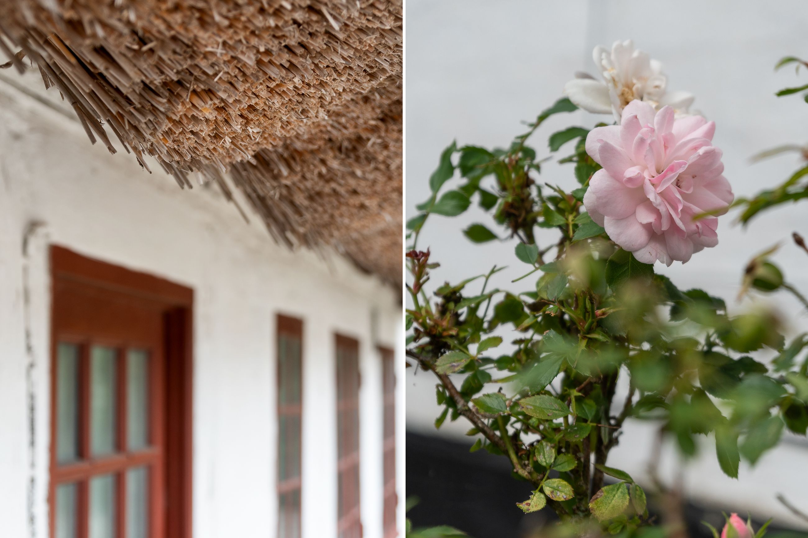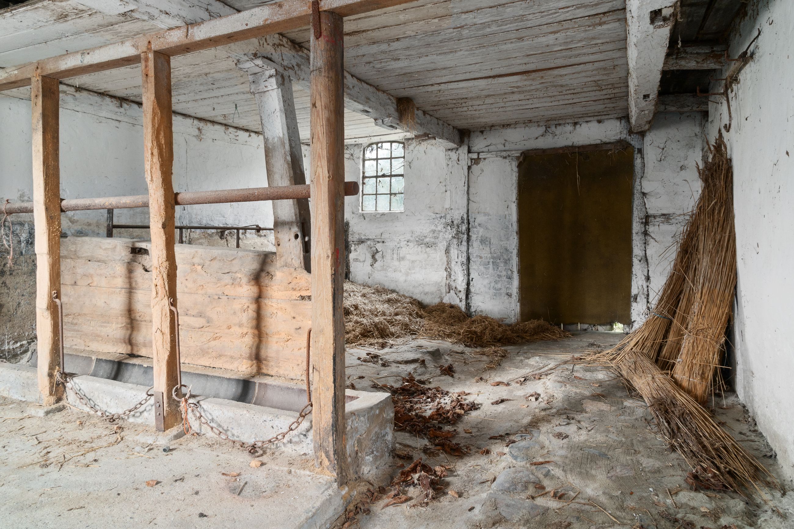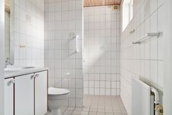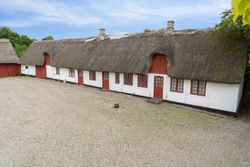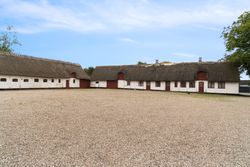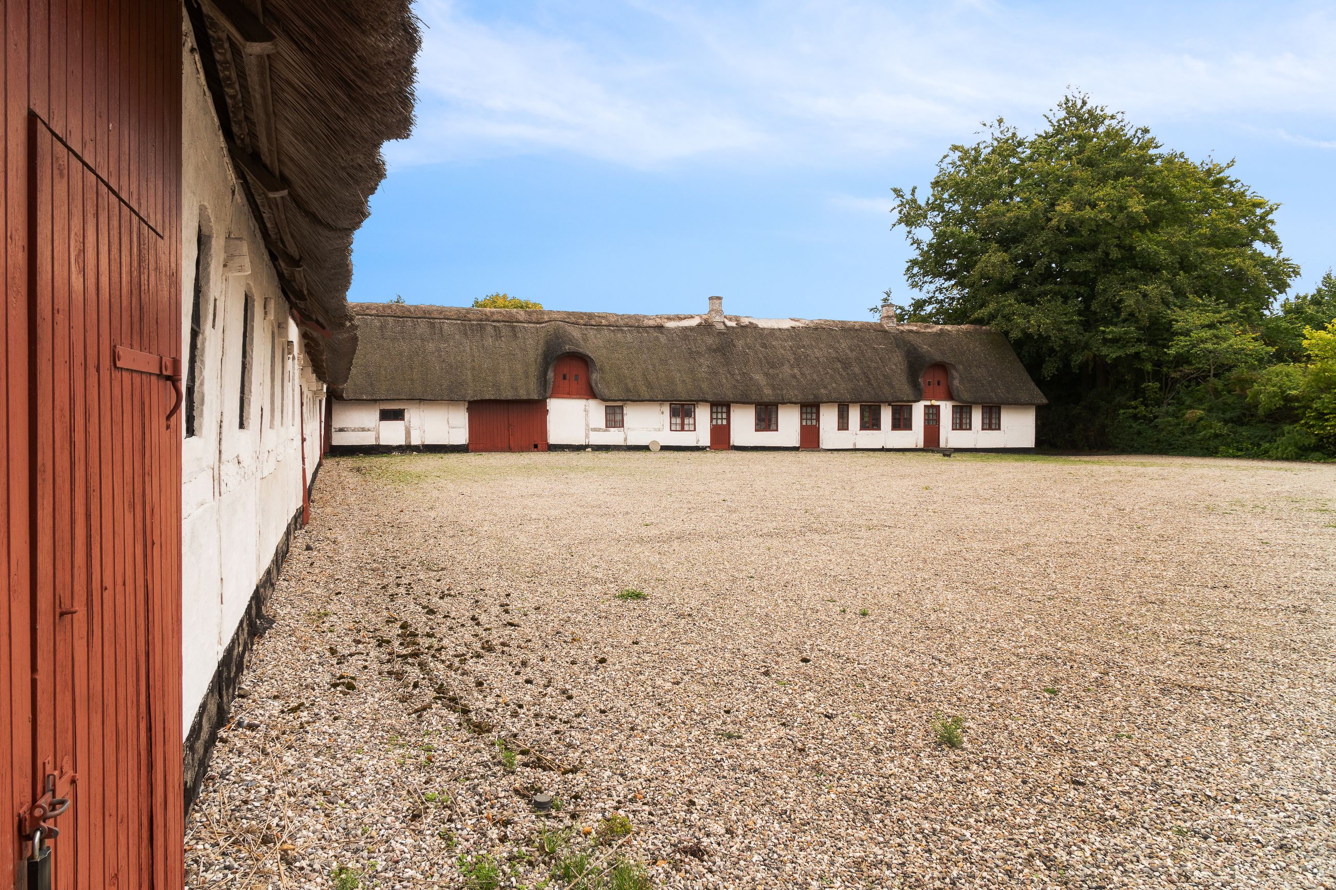 Hovedhuset imponerer med sine to længer og første sal, hvor flotte detaljer, højt til loftet og sildebensparketgulv giver en følelse af elegance og historie. Den smukke, hvide facade med rødt tag og mørkeblå detaljer gør huset særdeles indbydende udefra, og den store, grusbelagte gårdsplads indbyder til festlige stunder og samvær.