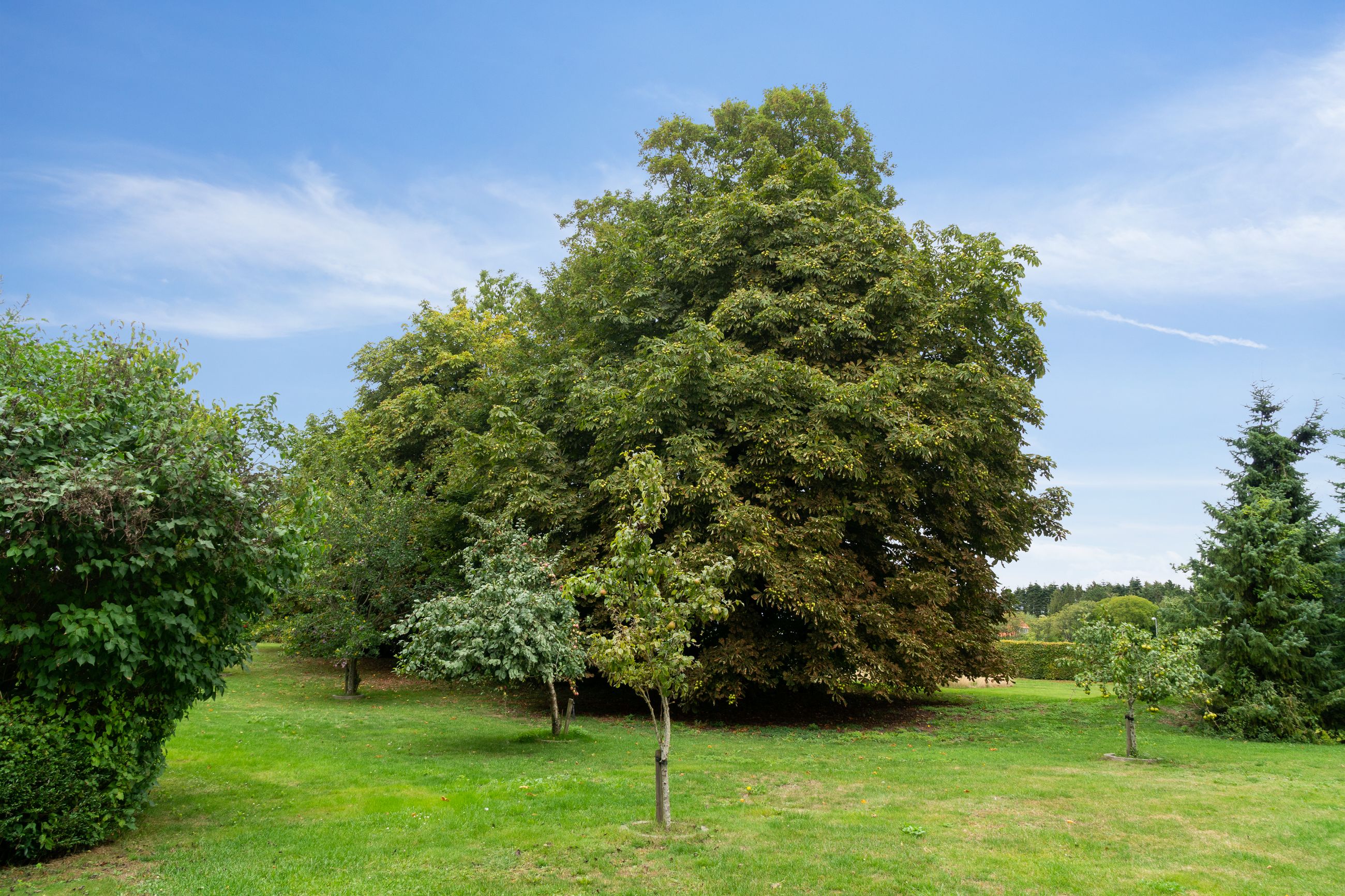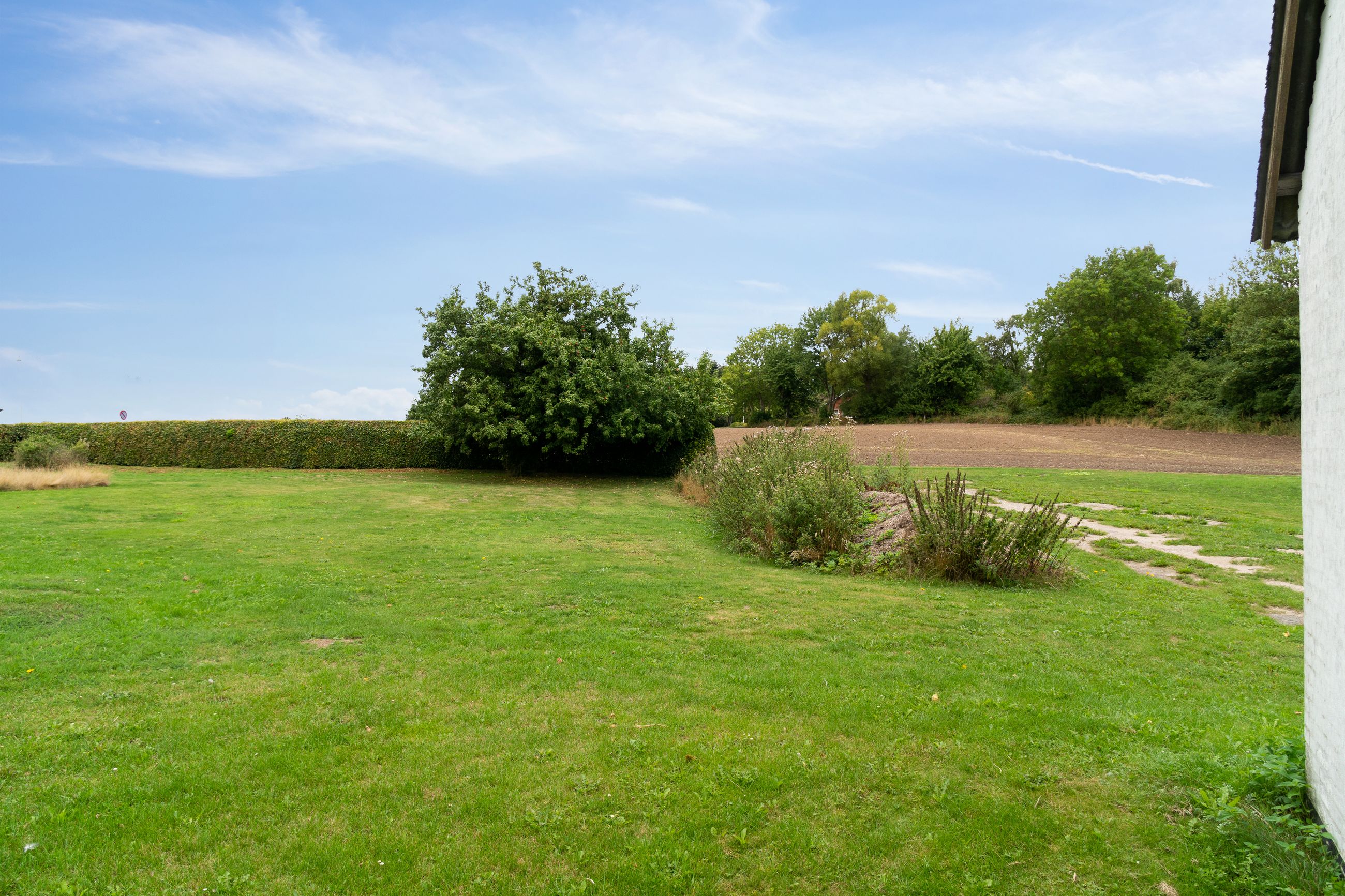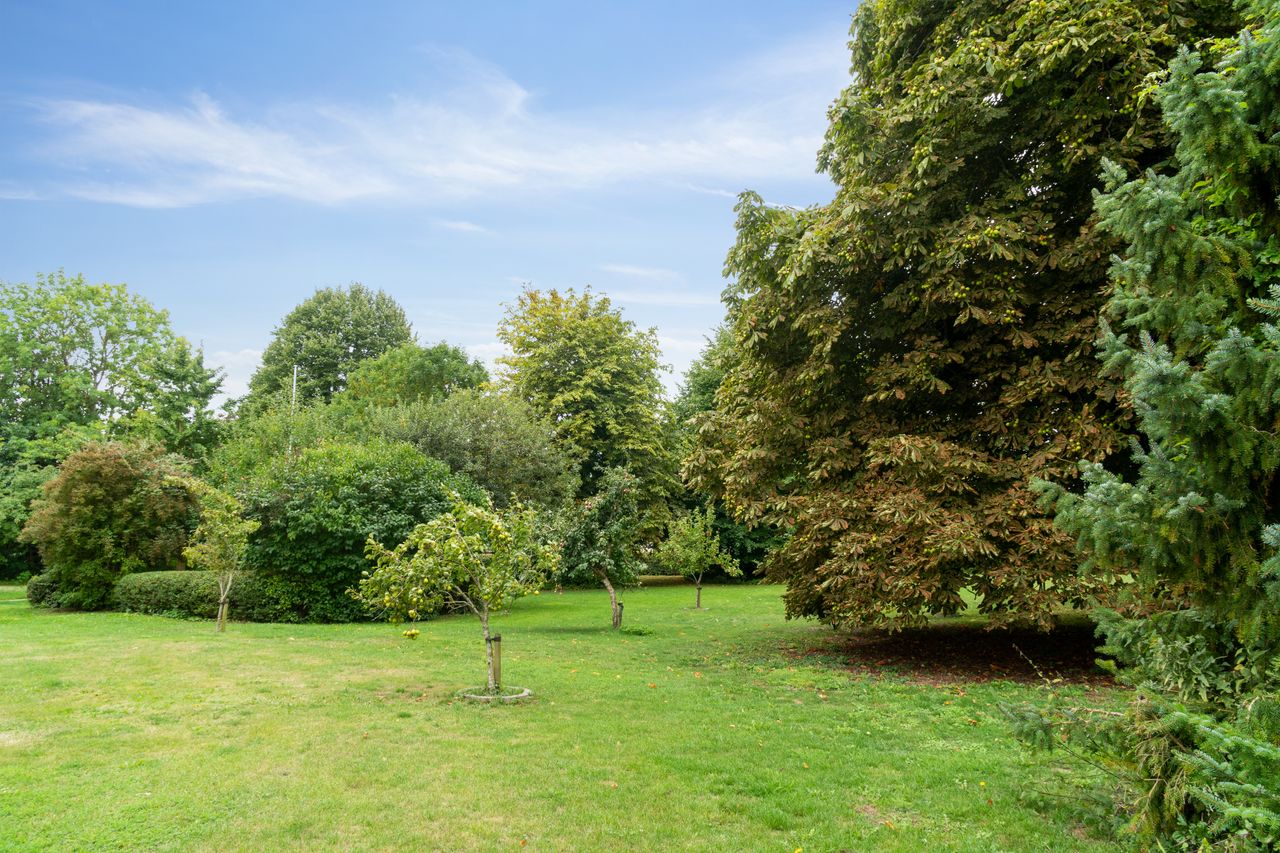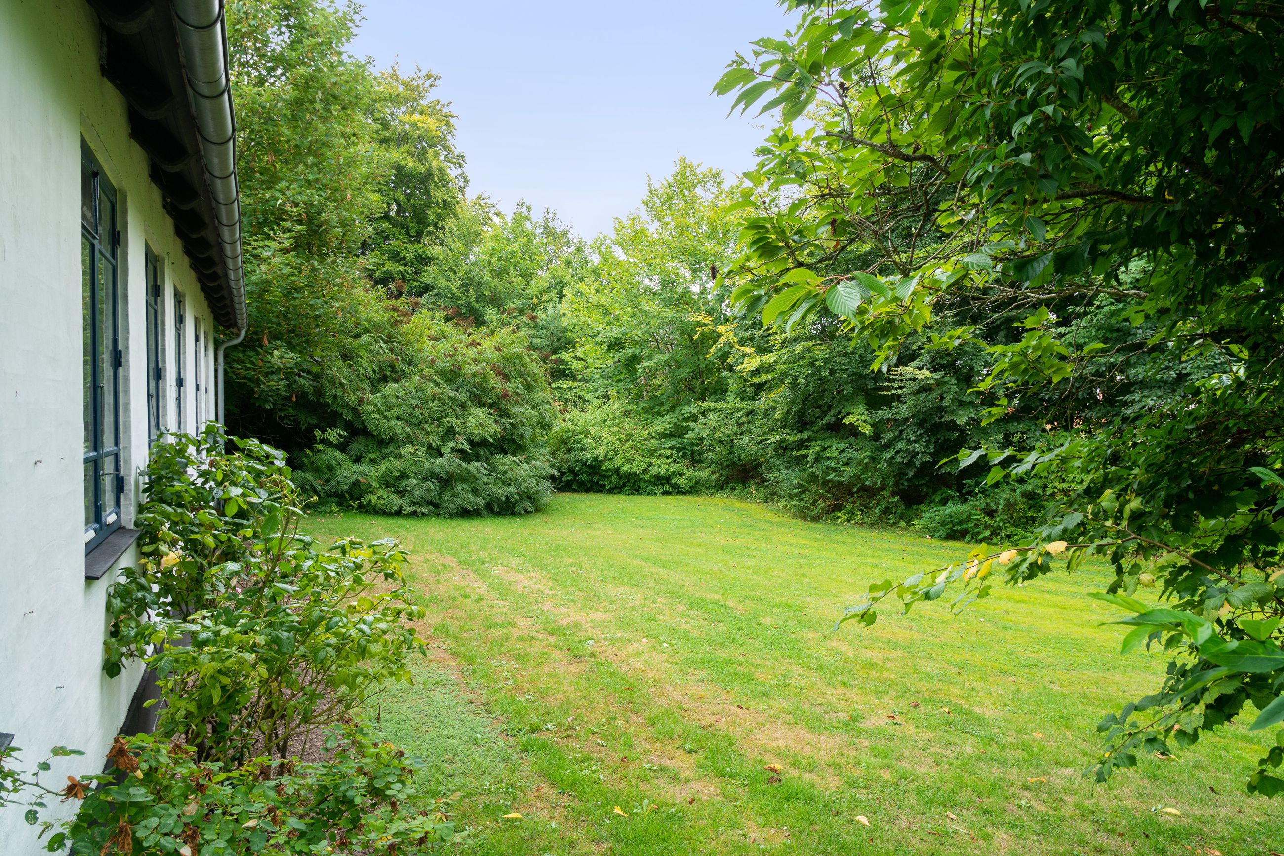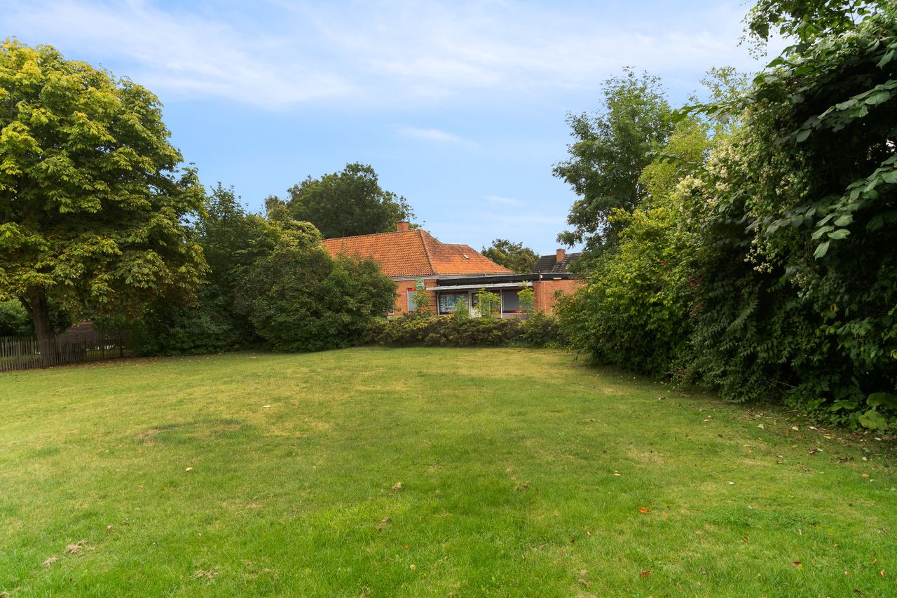 Grunden strækker sig over ca. 1 hektar og er anlagt som en smuk, parklignende have med åbne græsplæner, flotte træer og blomstrende bede. Udenfor er der masser af muligheder for at udleve drømmen om hestehold, et stort værksted, eller måske et atelier i de charmerende længer, som har stråtag og giver stedet en romantisk og idyllisk atmosfære.