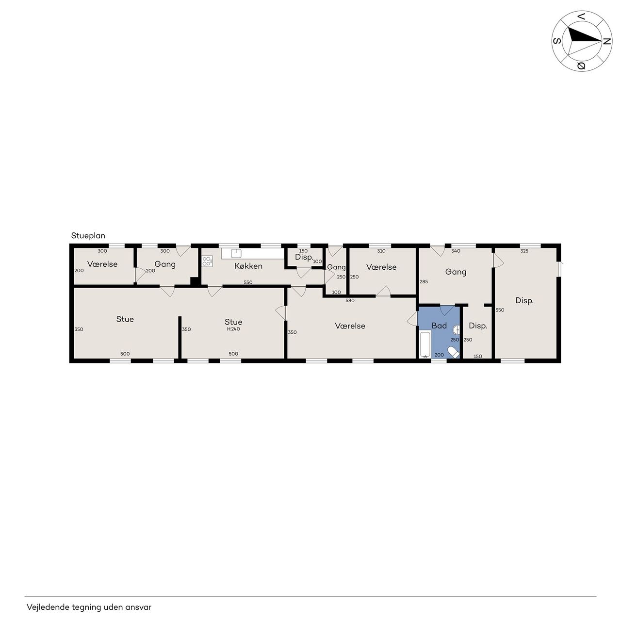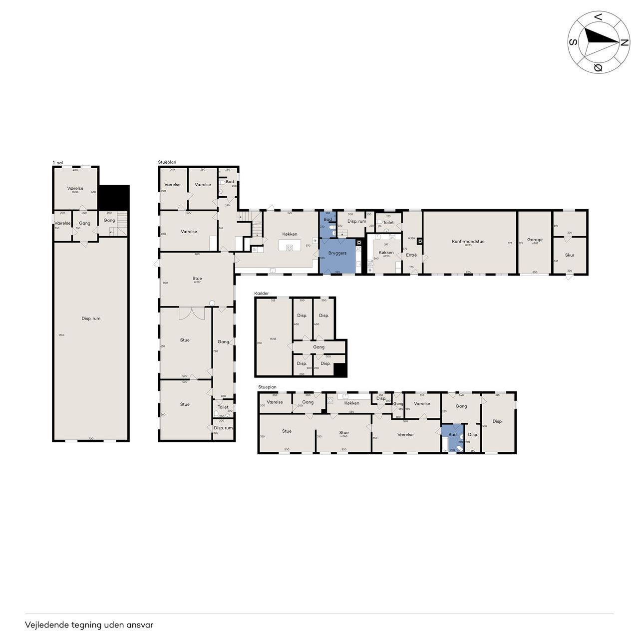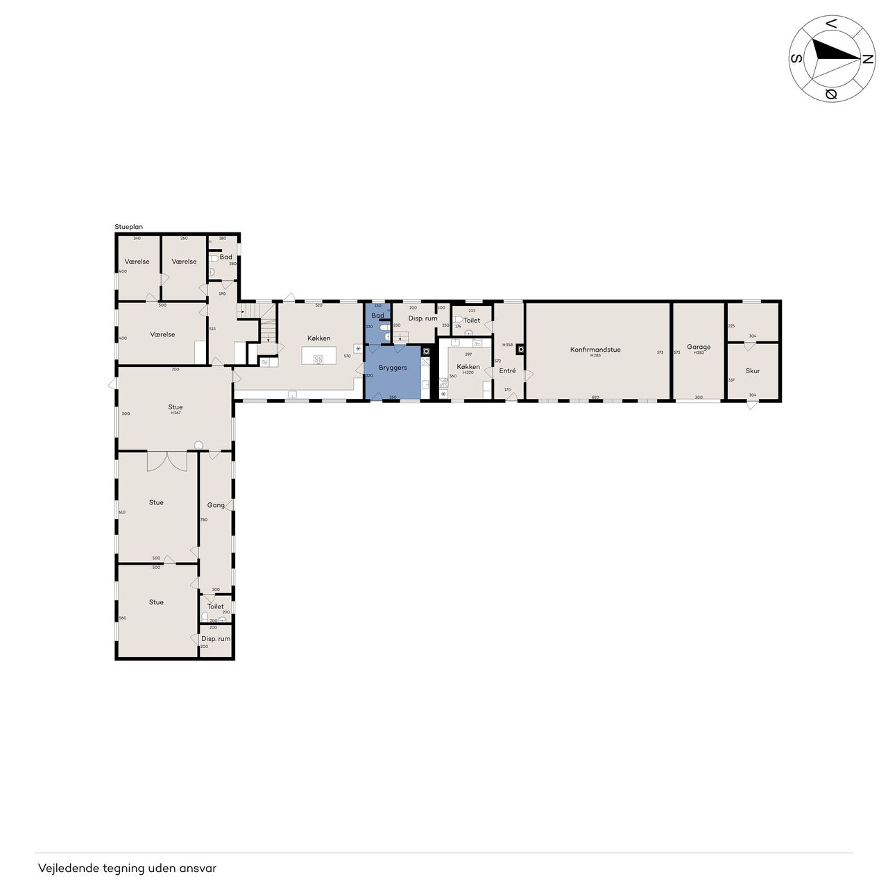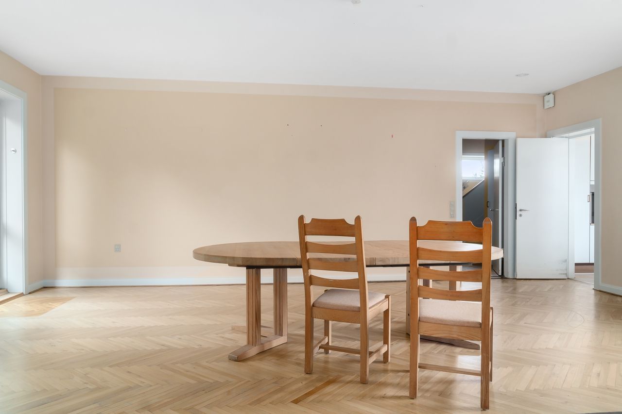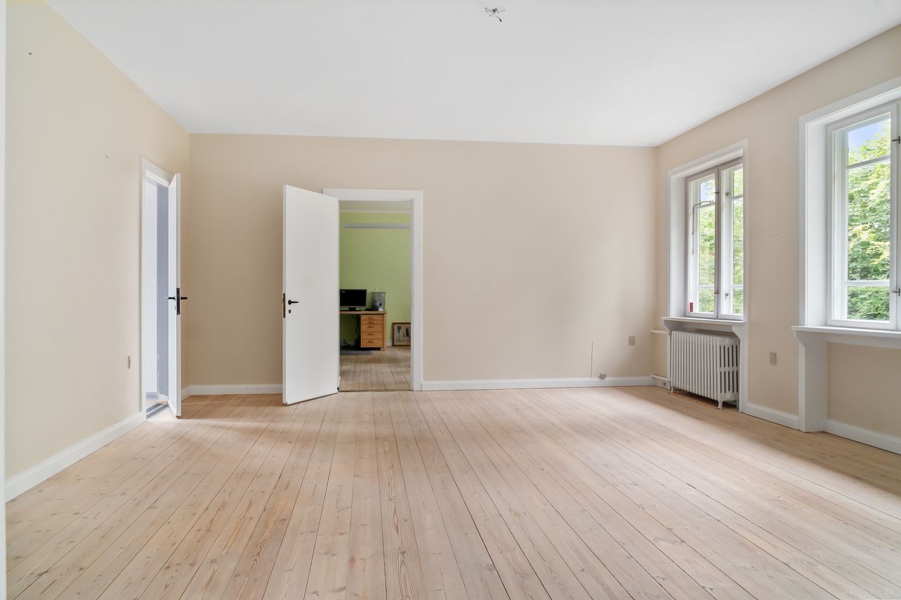 Indenfor er der masser af plads til både familieliv og gæstebud. De tre stuer en suite og det rummelige køkken-alrum giver de perfekte rammer til selskaber og sammenkomster. Fem værelser, to badeværelser og et gæstetoilet sørger for praktisk funktionalitet. Der er desuden flere disponible rum, et bryggers og et stort rum på første sal, som kan indrettes efter jeres behov.