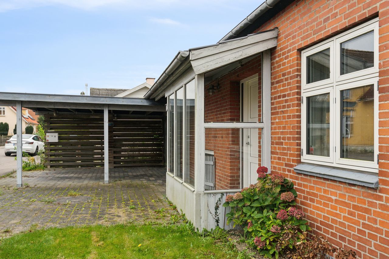 Udenfor venter en solrig have, vendt mod syd, der er nem at holde og giver jer masser af tid til afslapning. Foran huset er der carport til bilen.