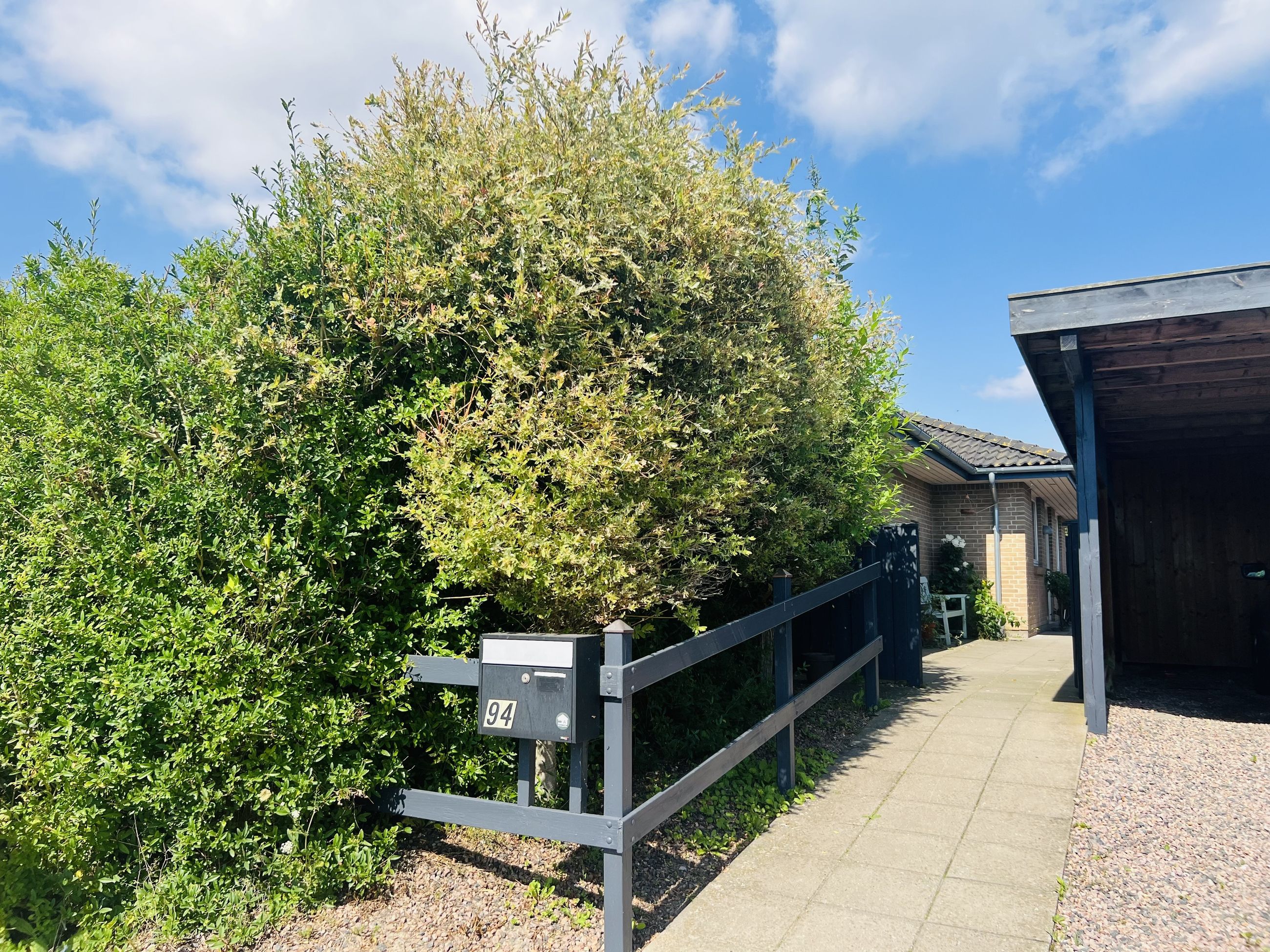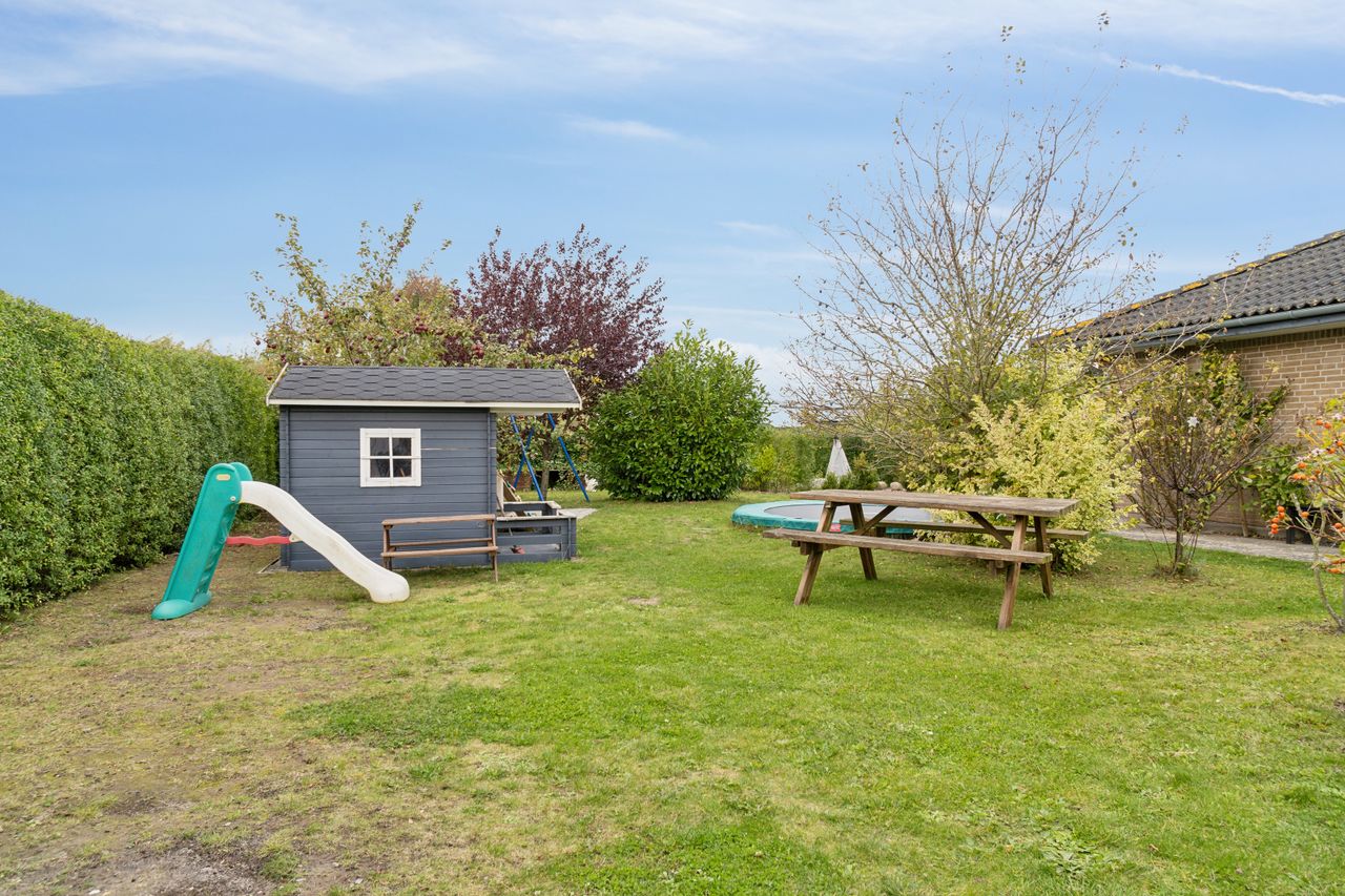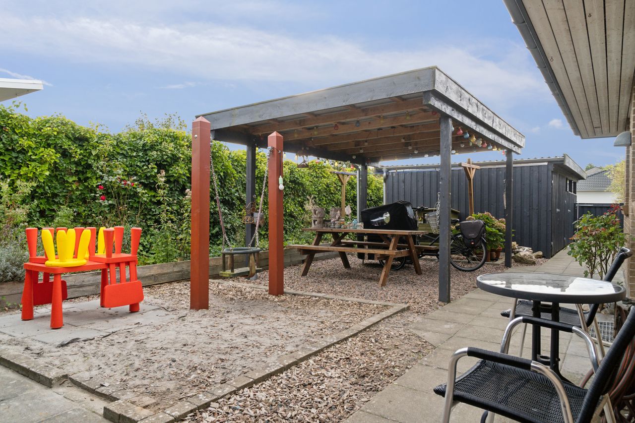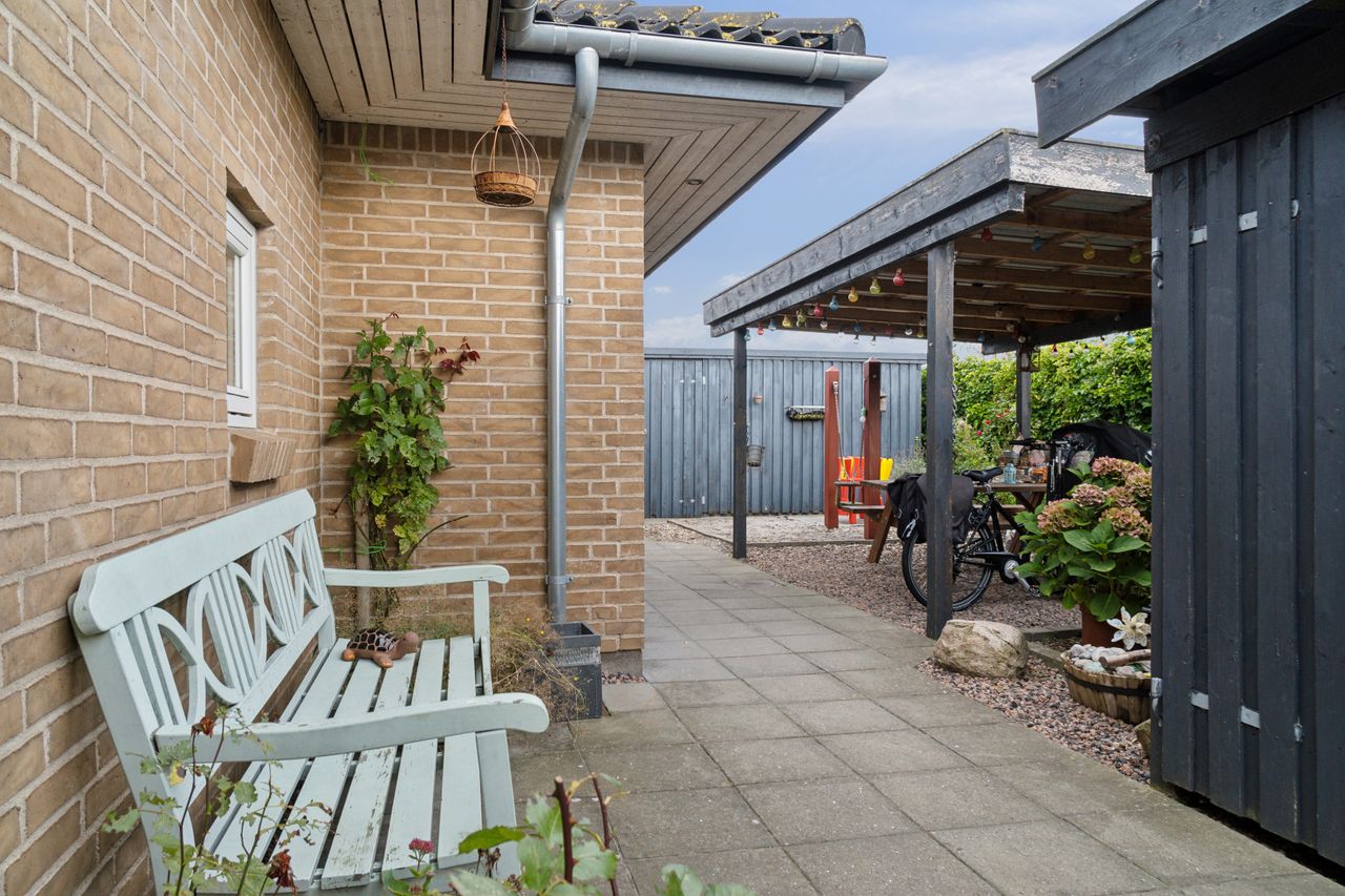Den hyggelige have er anlagt med plæne, blomsterbuske og to ugenerede fliseterrasser, der vender mod syd og vest. Forrest på grunden er der en overdækning, et skur og en carport med indbygget redskabsrum.