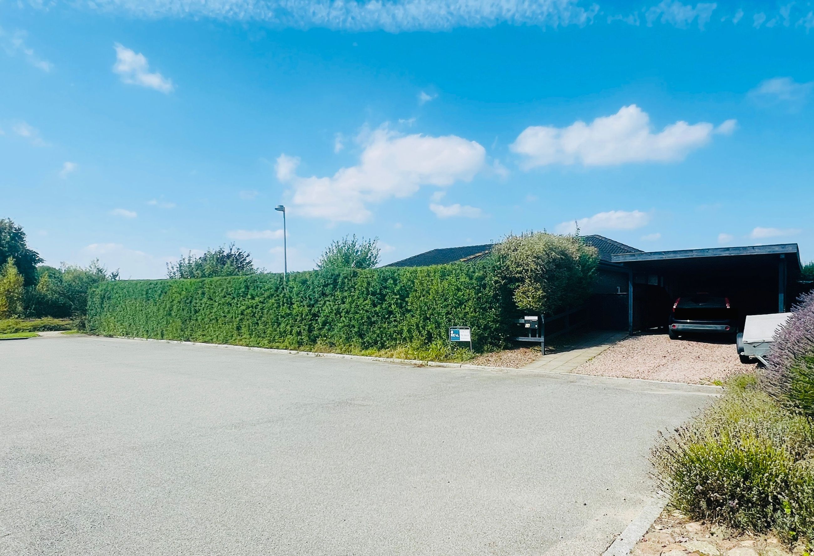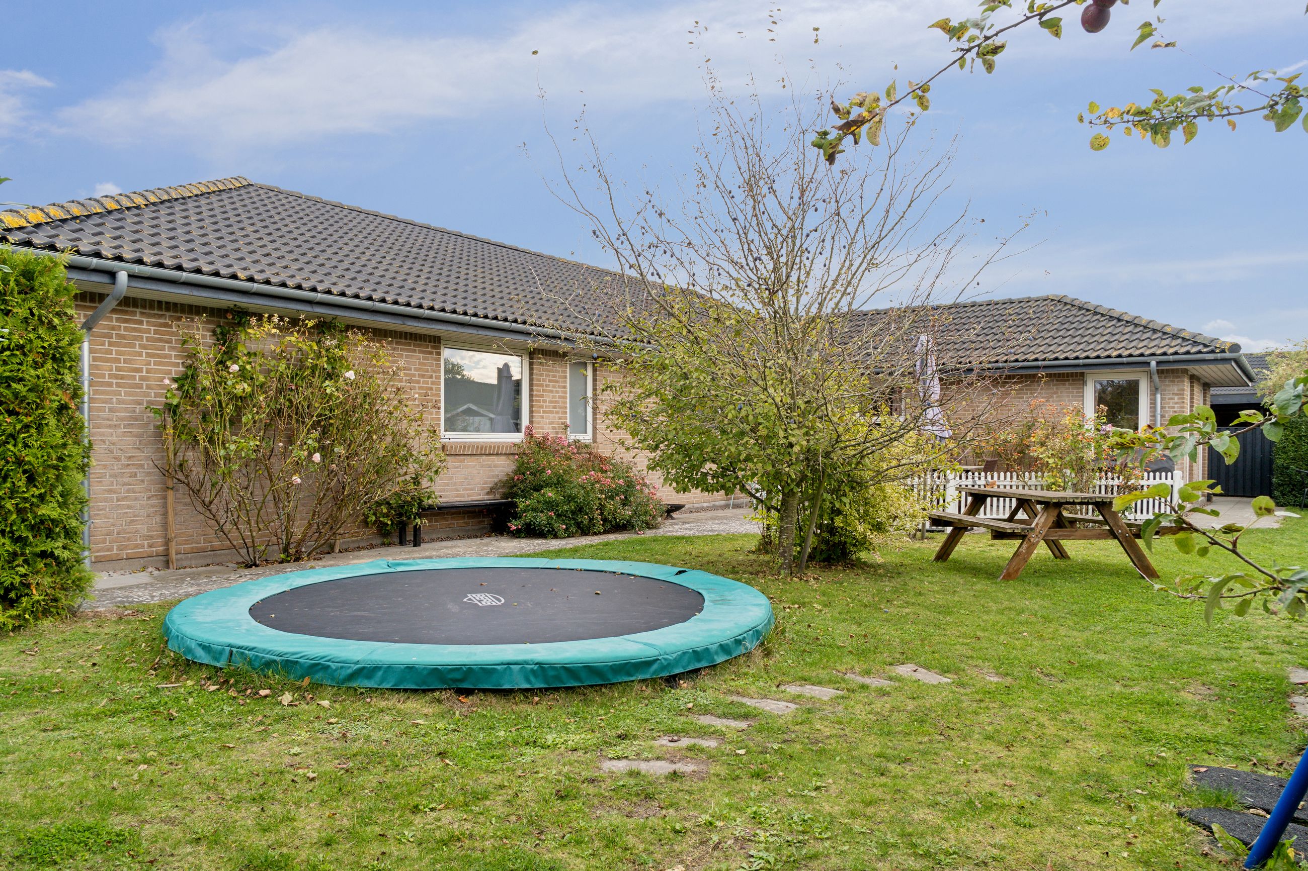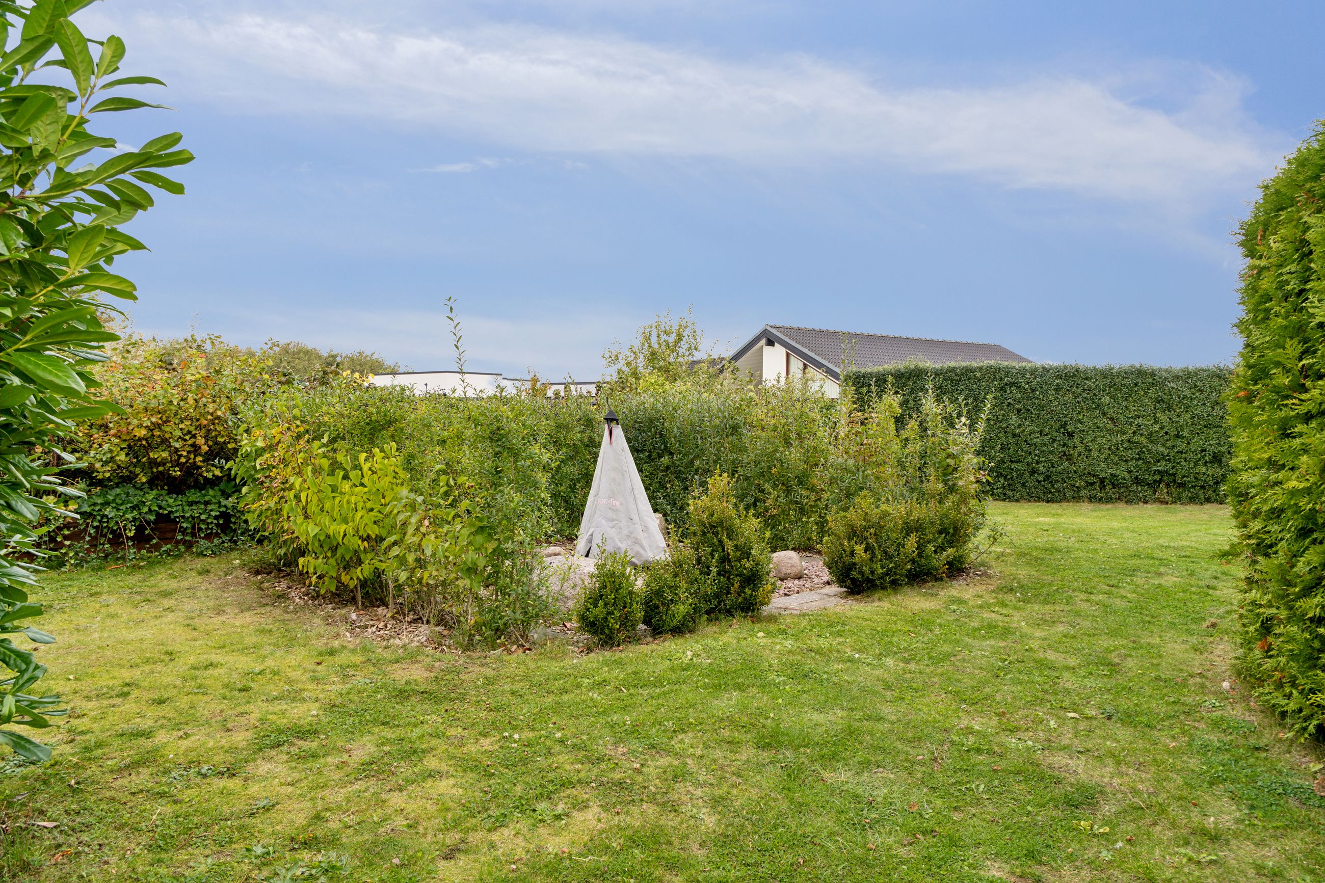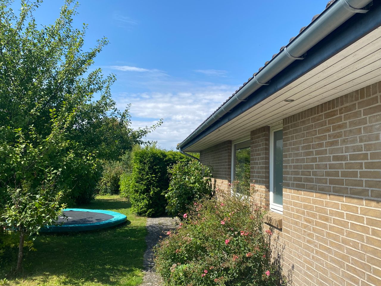 Den hyggelige have er anlagt med plæne, blomsterbuske og to ugenerede fliseterrasser, der vender mod syd og vest. Forrest på grunden er der en overdækning, et skur og en carport med indbygget redskabsrum.