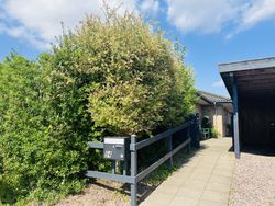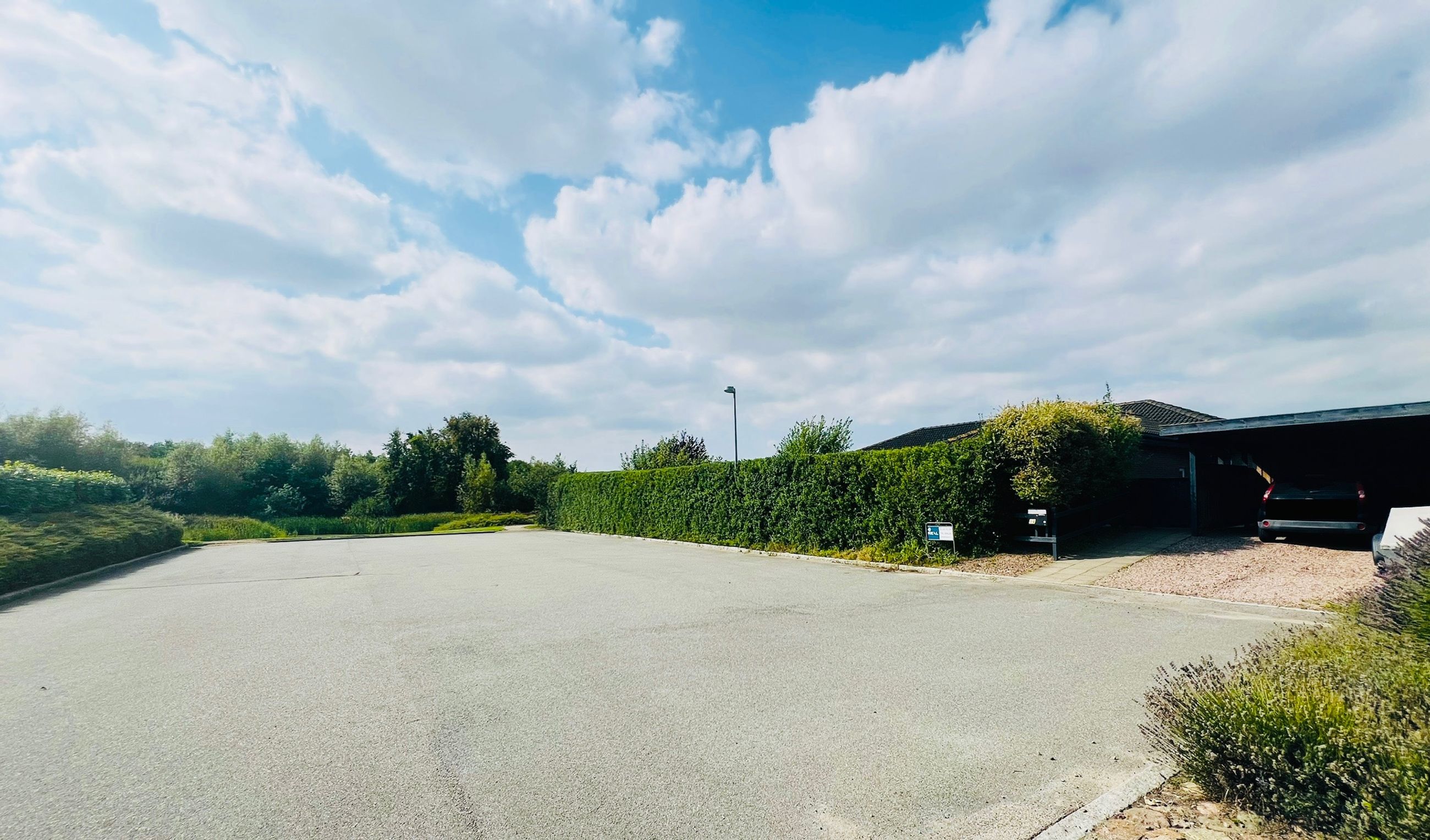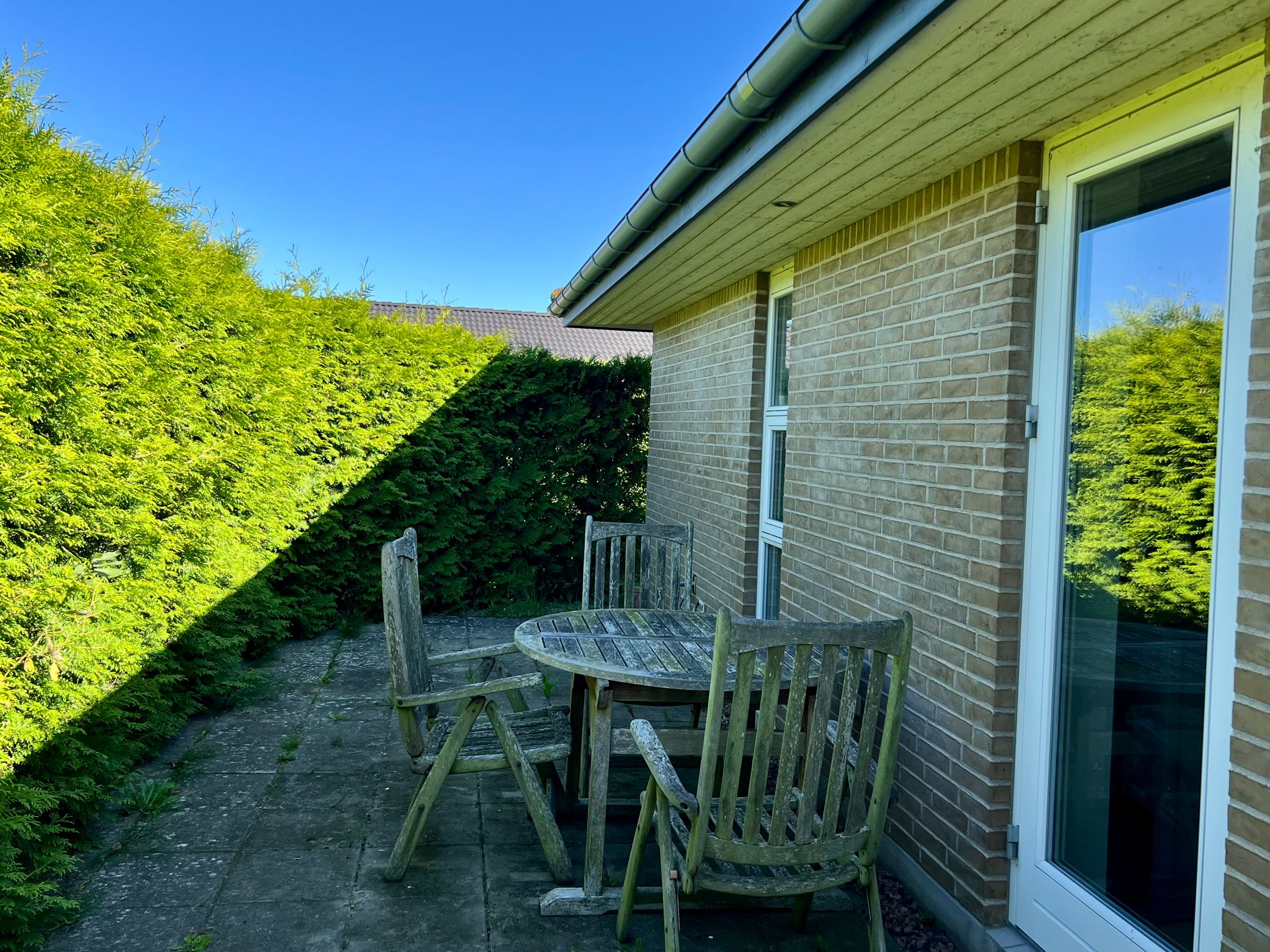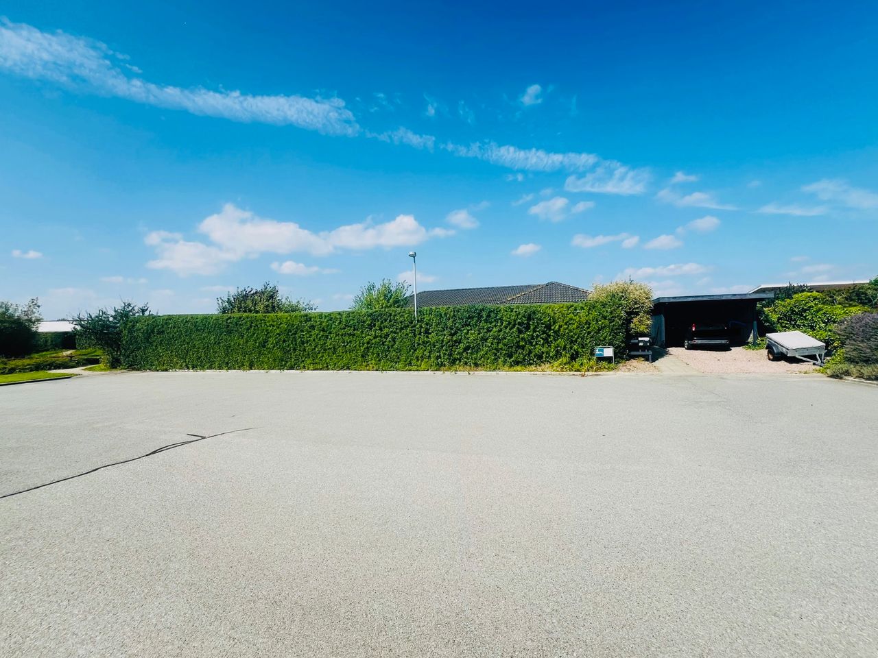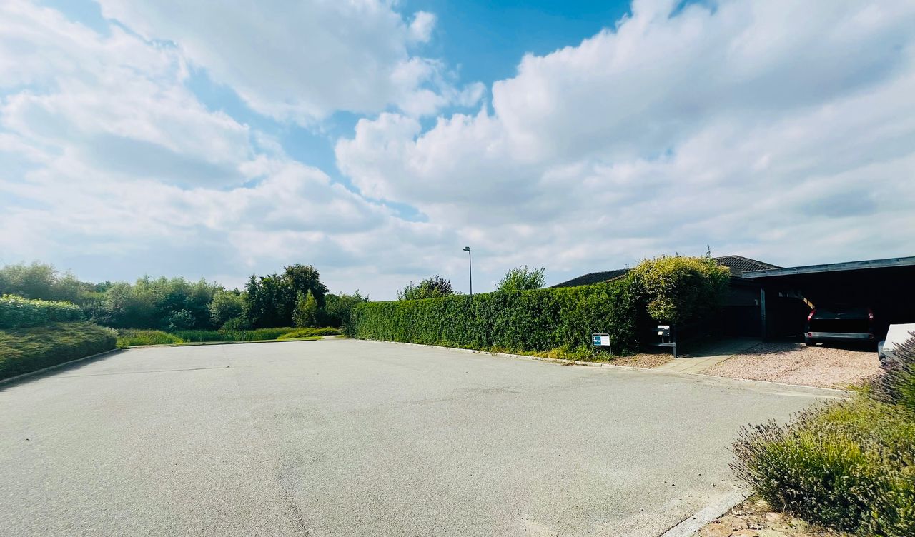 Den hyggelige have er anlagt med plæne, blomsterbuske og to ugenerede fliseterrasser, der vender mod syd og vest. Forrest på grunden er der en overdækning, et skur og en carport med indbygget redskabsrum.