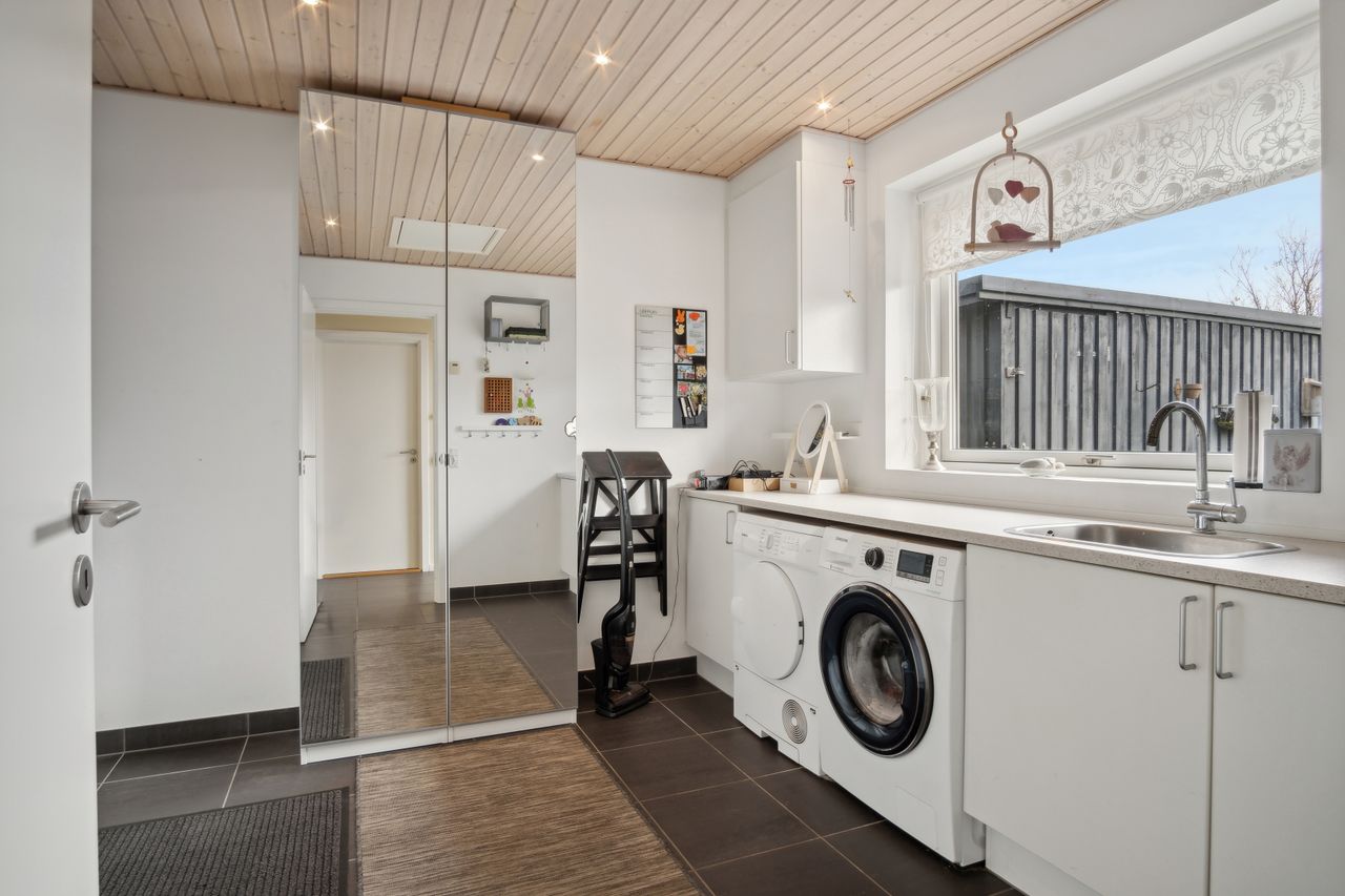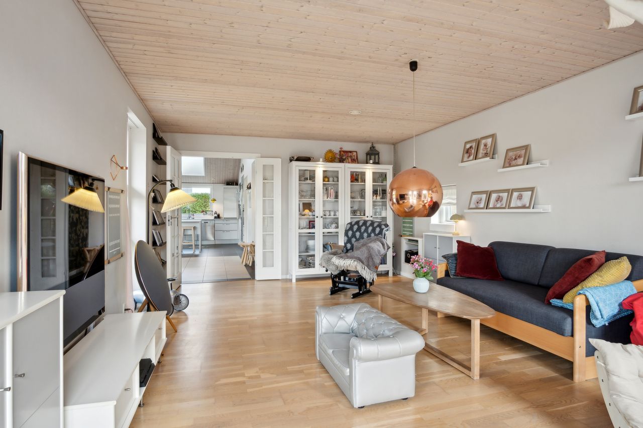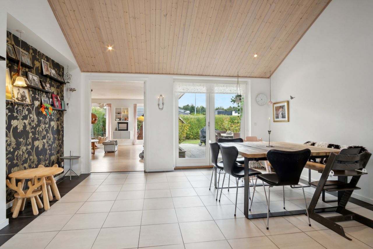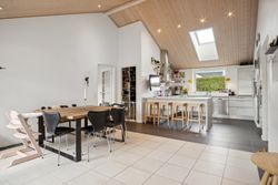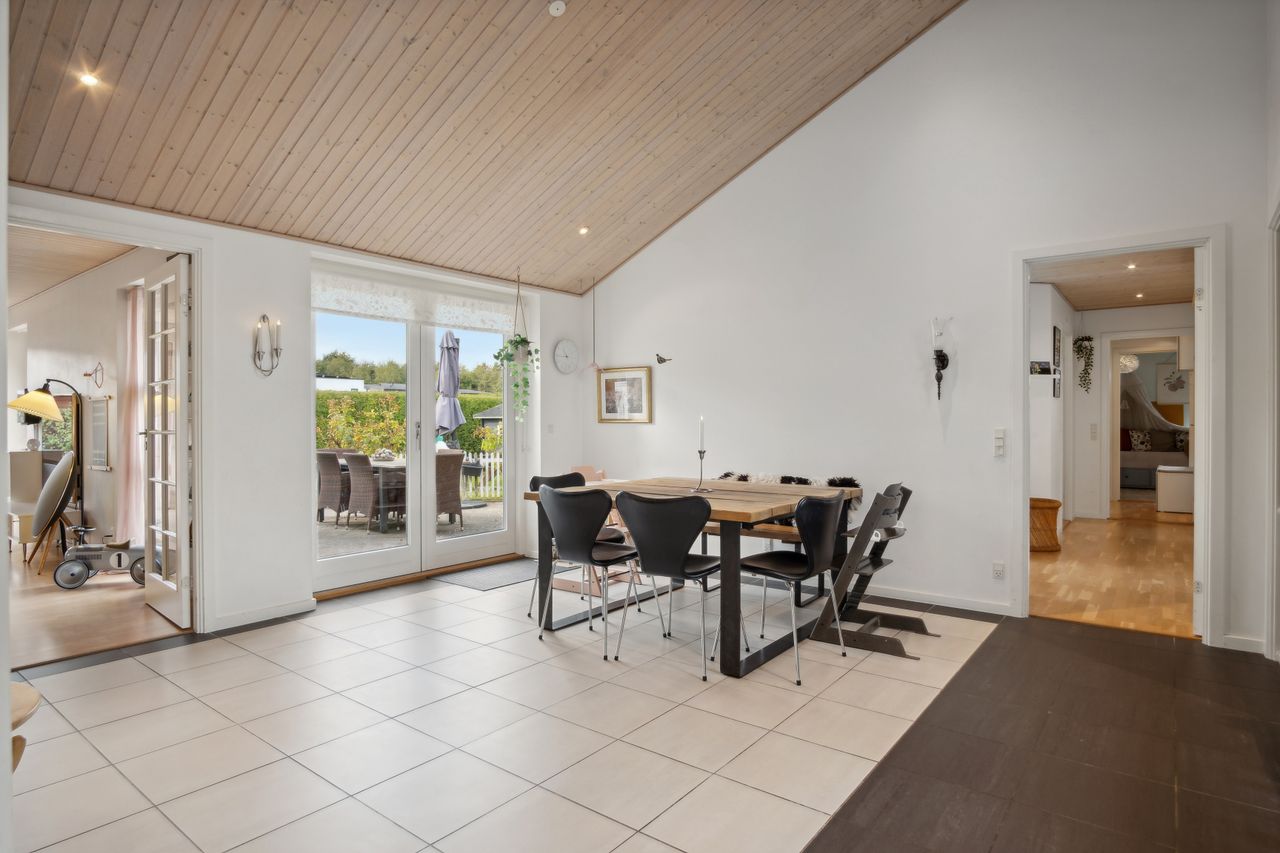 Foruden de mange værelser kan I se frem til et højloftet køkken-alrum, der har loft til kip og ovenlys. Det åbne køkken er holdt i hvidt og har integreret spisedisk, og det praktiske viktualierum bidrager med yderligere opbevaringsplads.