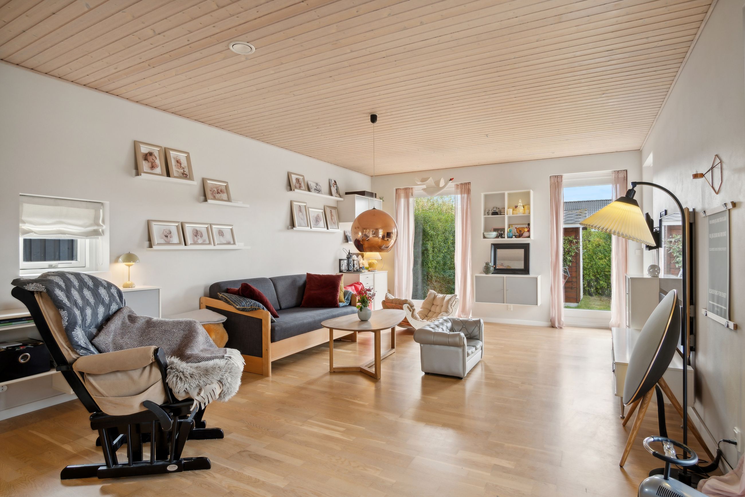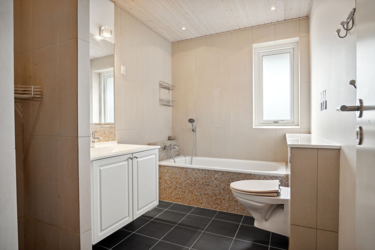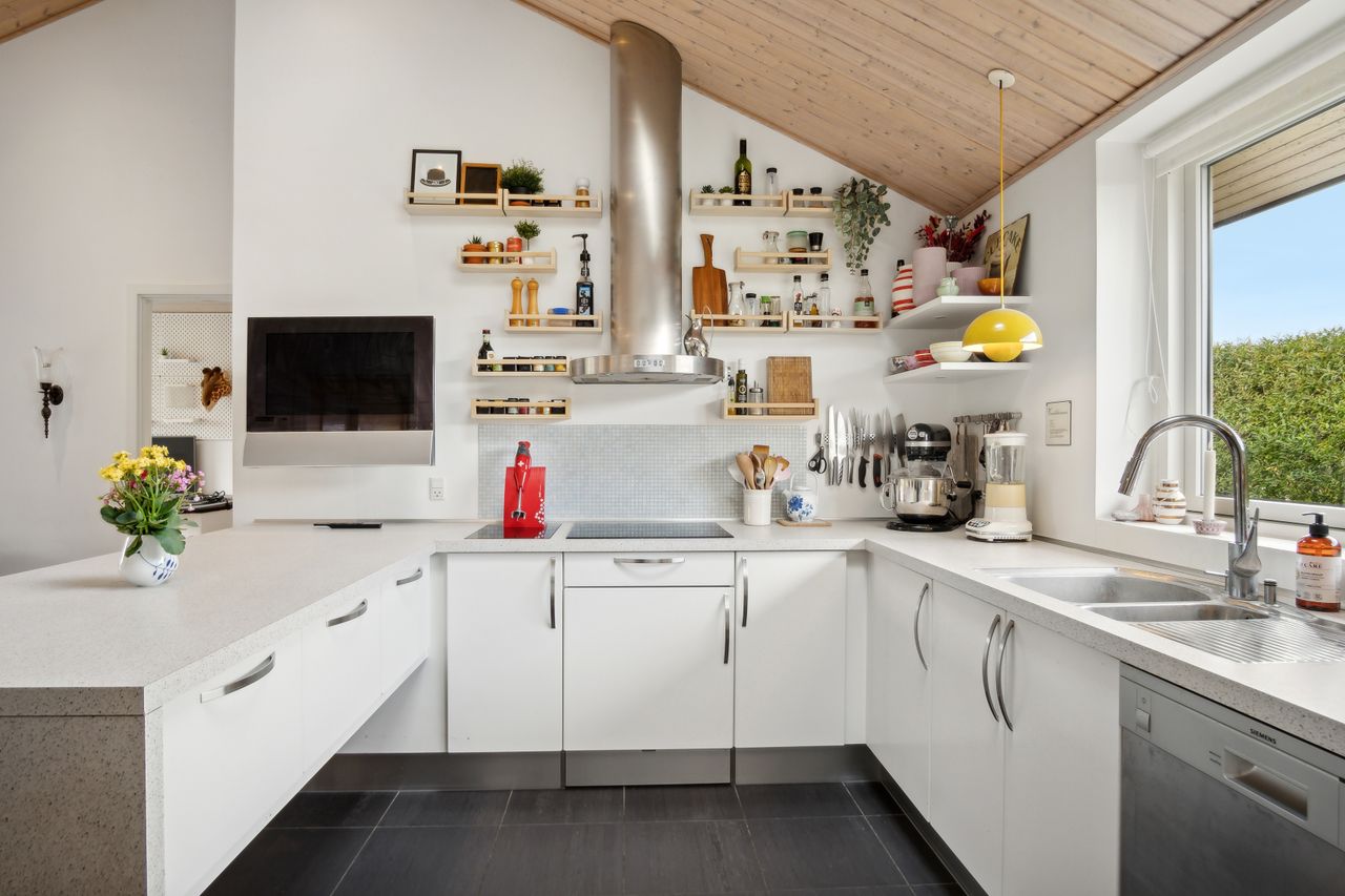 Foruden de mange værelser kan I se frem til et højloftet køkken-alrum, der har loft til kip og ovenlys. Det åbne køkken er holdt i hvidt og har integreret spisedisk, og det praktiske viktualierum bidrager med yderligere opbevaringsplads.