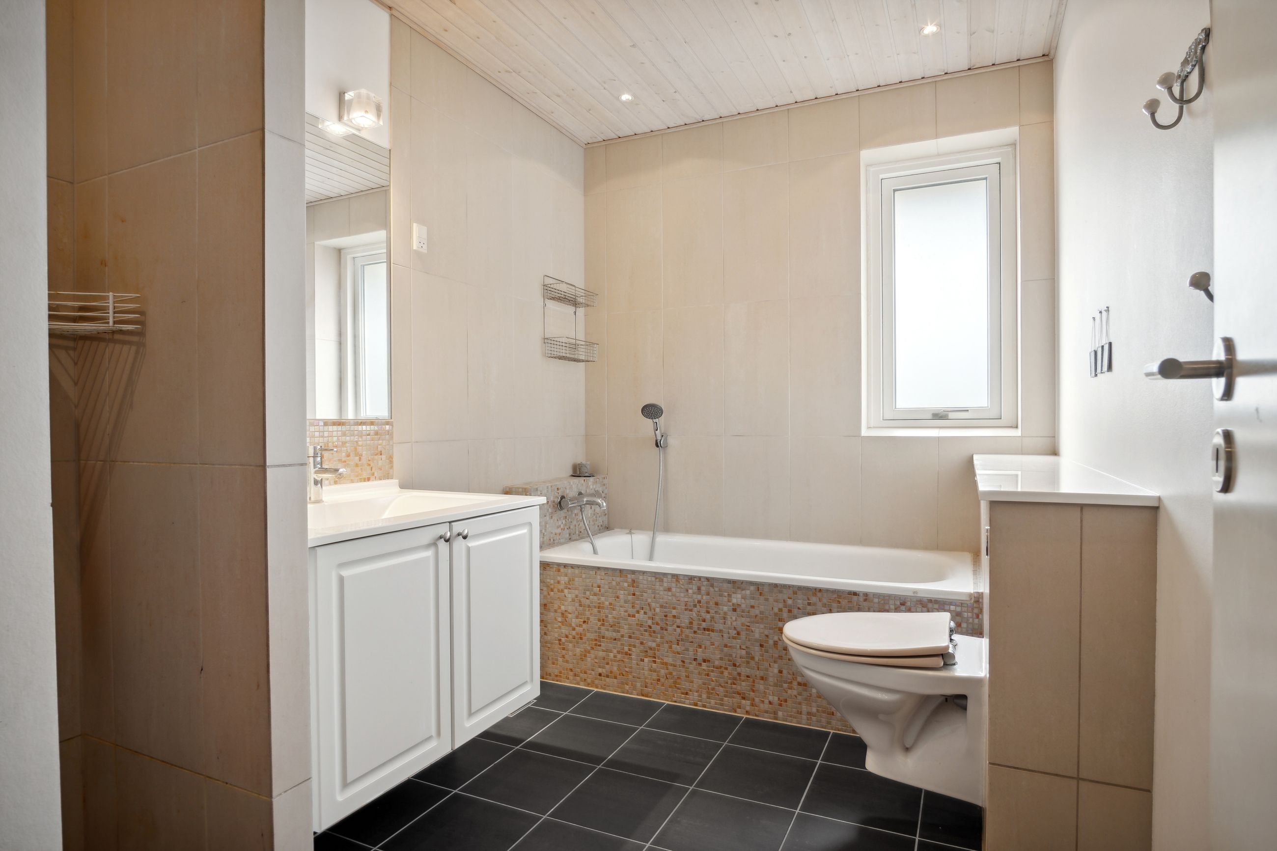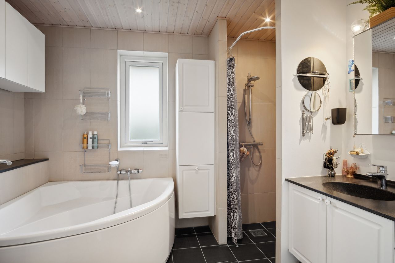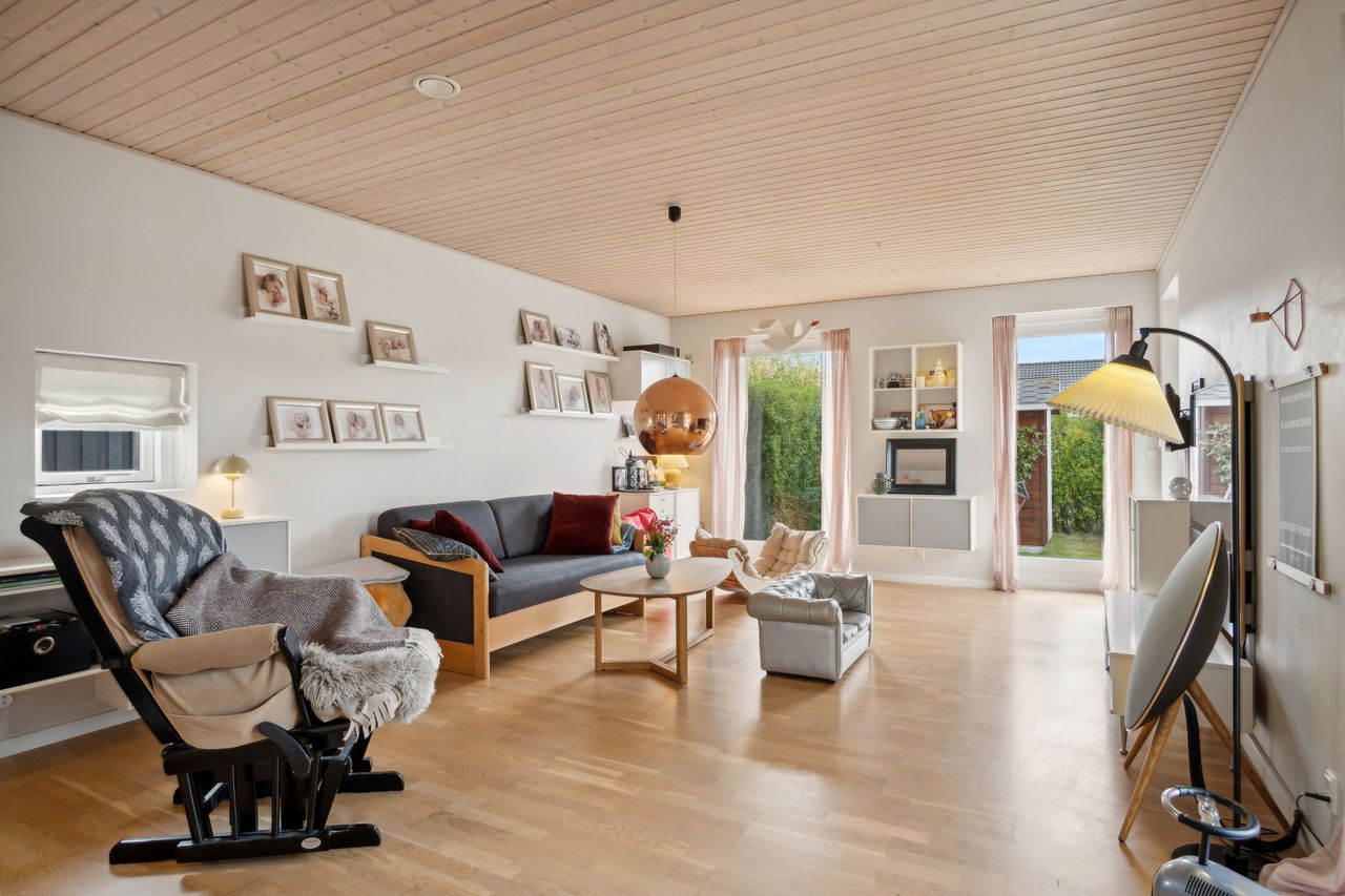 Såvel køkken-alrummet som den tilstødende opholdsstue får et behageligt eftermiddagslys, og begge afdelinger har udgang til haven. Det førnævnte forældresoveværelse har ligeledes terrassedør samt tilhørende walk-in-closet. Både forældrebadeværelset og husets ekstra badeværelse er i øvrigt udført med badekar og muret bruseniche.