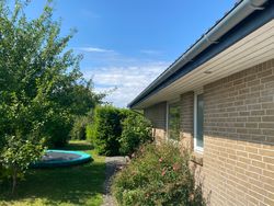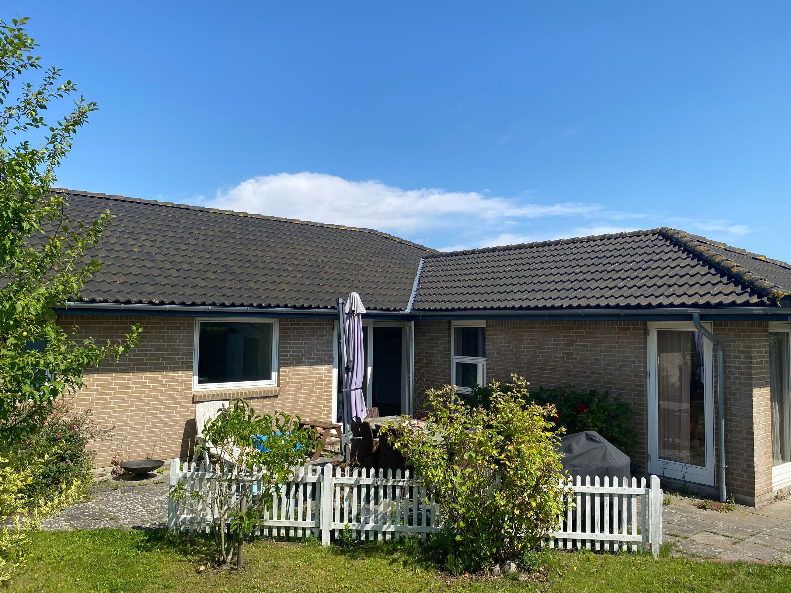 Villaen fremtræder med pæn murstensfacade og hvide vinduesrammer samt klassisk valmtag i mørke betontagsten. Inden døre er farvevalget diskret og inventaret tidssvarende, og hele hjemmet er samvittighedsfuldt vedligeholdt.