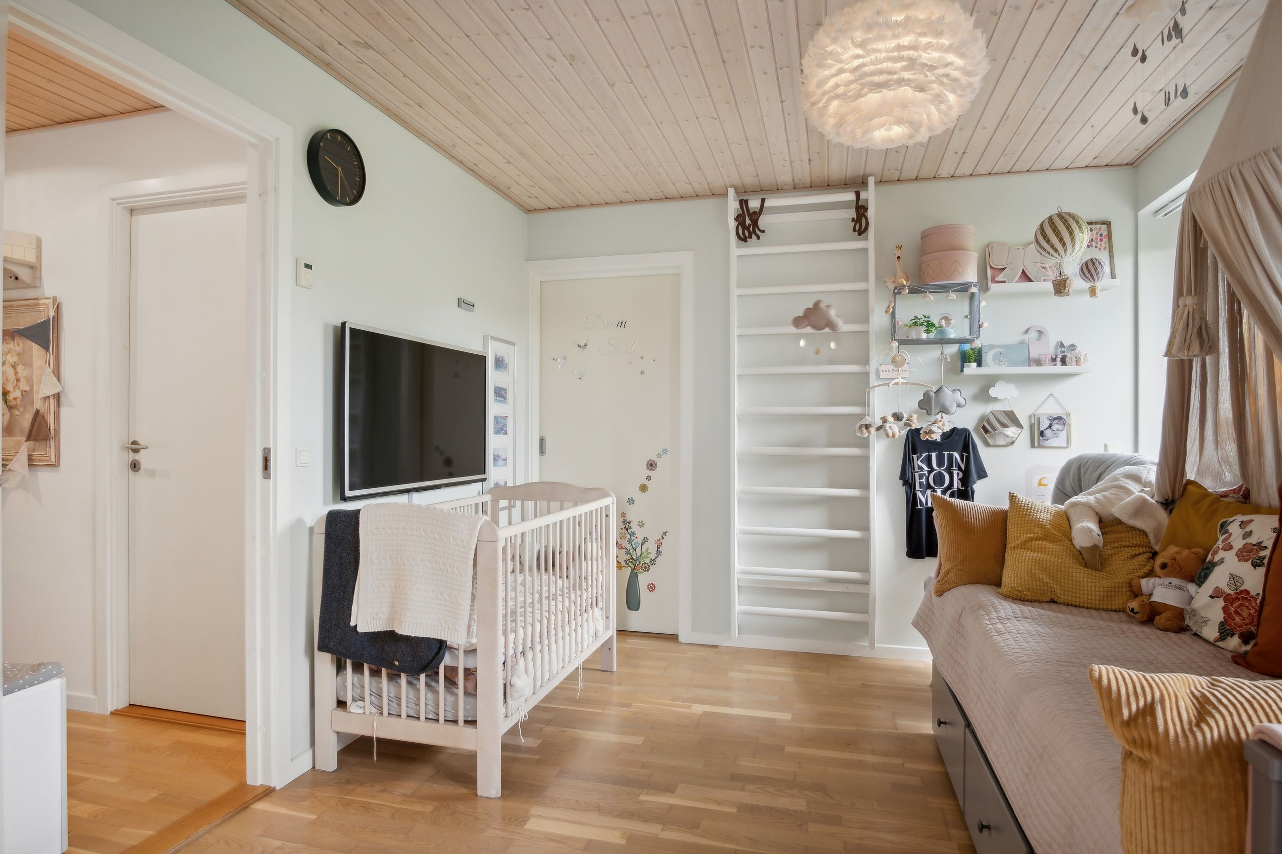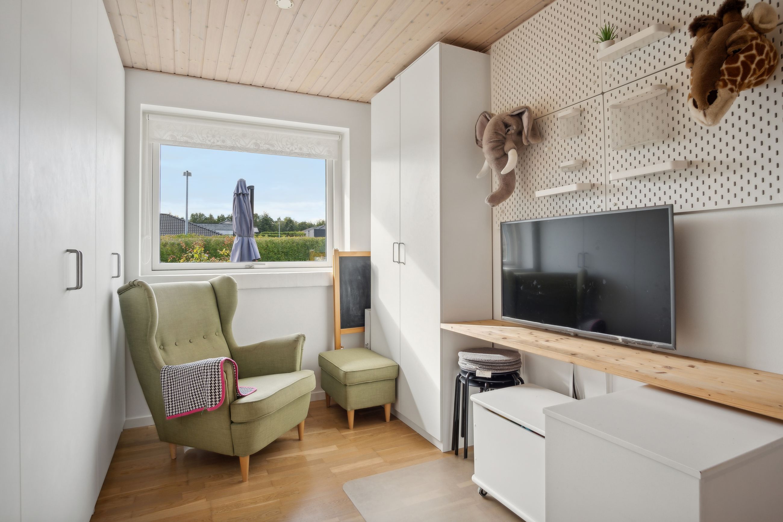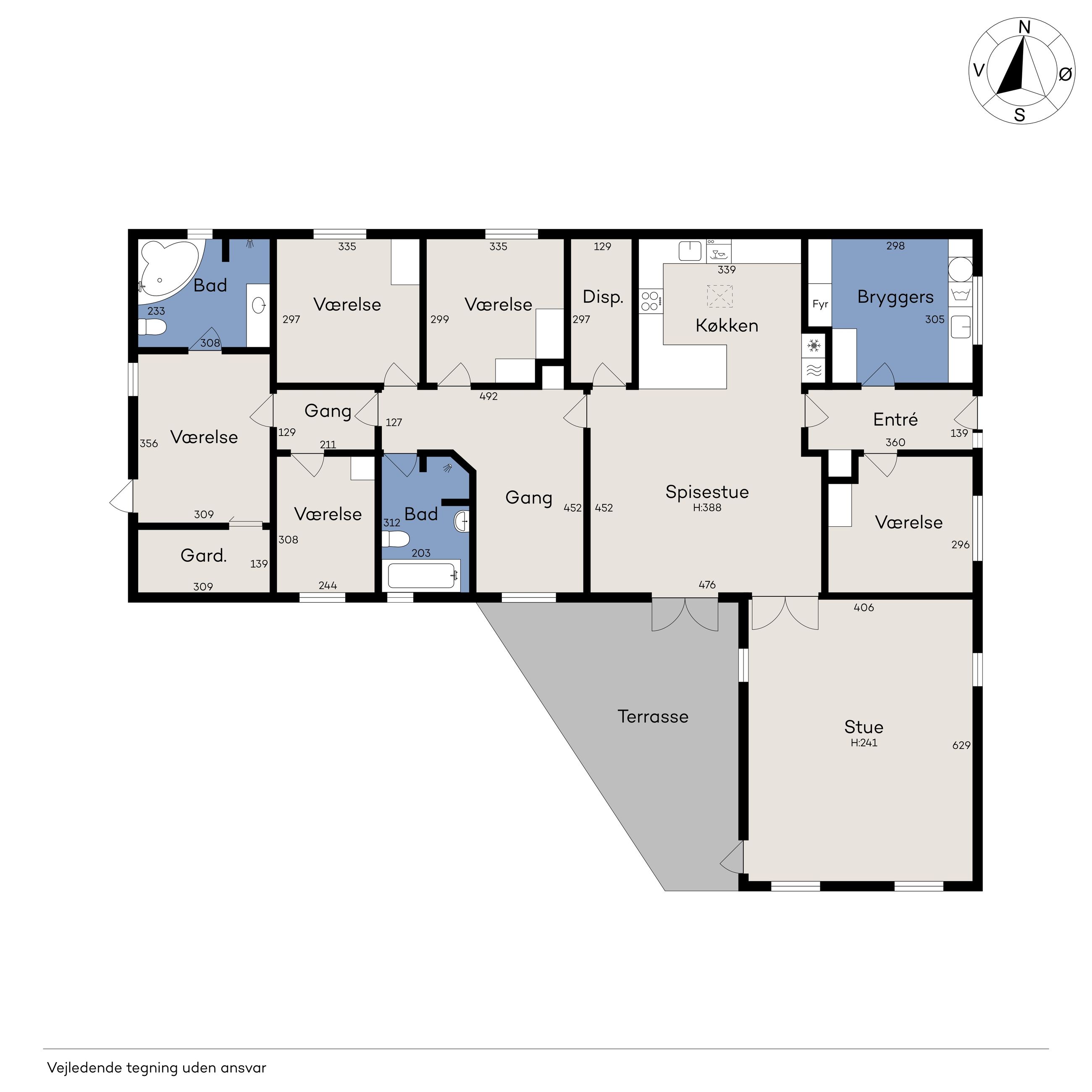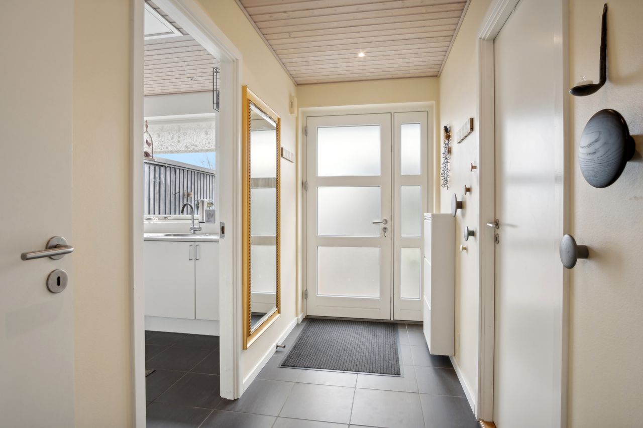 De resterende fire værelser har faste skabe, og det ene af disse værelser ligger separat. I denne del af boligen findes også et funktionelt bryggers og entréen.