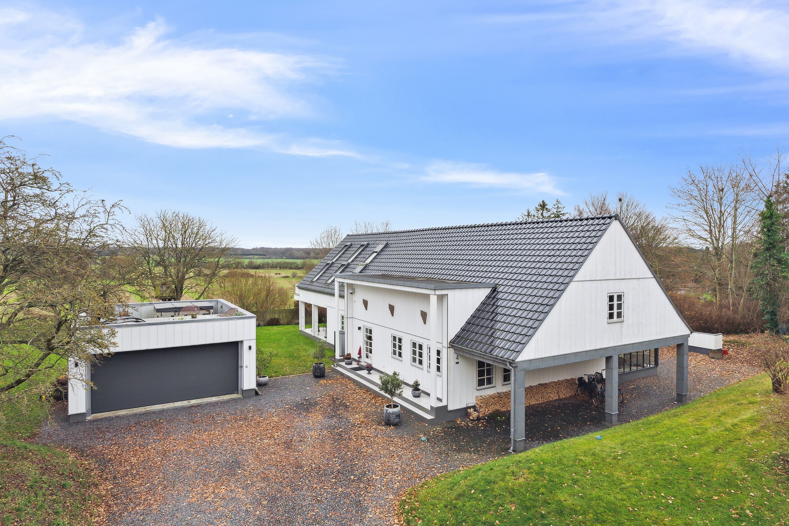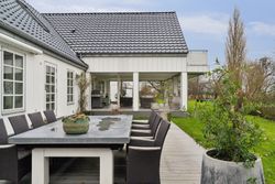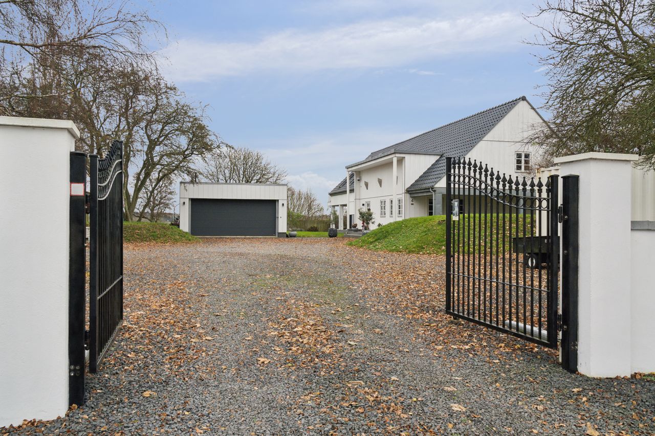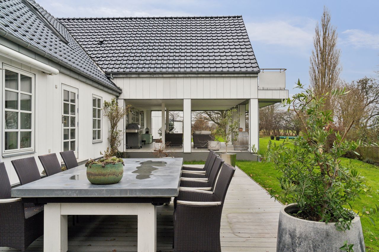 Grunden på over 3.200 kvadratmeter byder på flere terrasser og velplejede grønne områder, der indbyder til afslapning og samvær. Den overdækkede terrasse giver mulighed for at nyde udsigten året rundt, mens garagebygningen med tagterrasse tilføjer endnu en dimension af komfort.