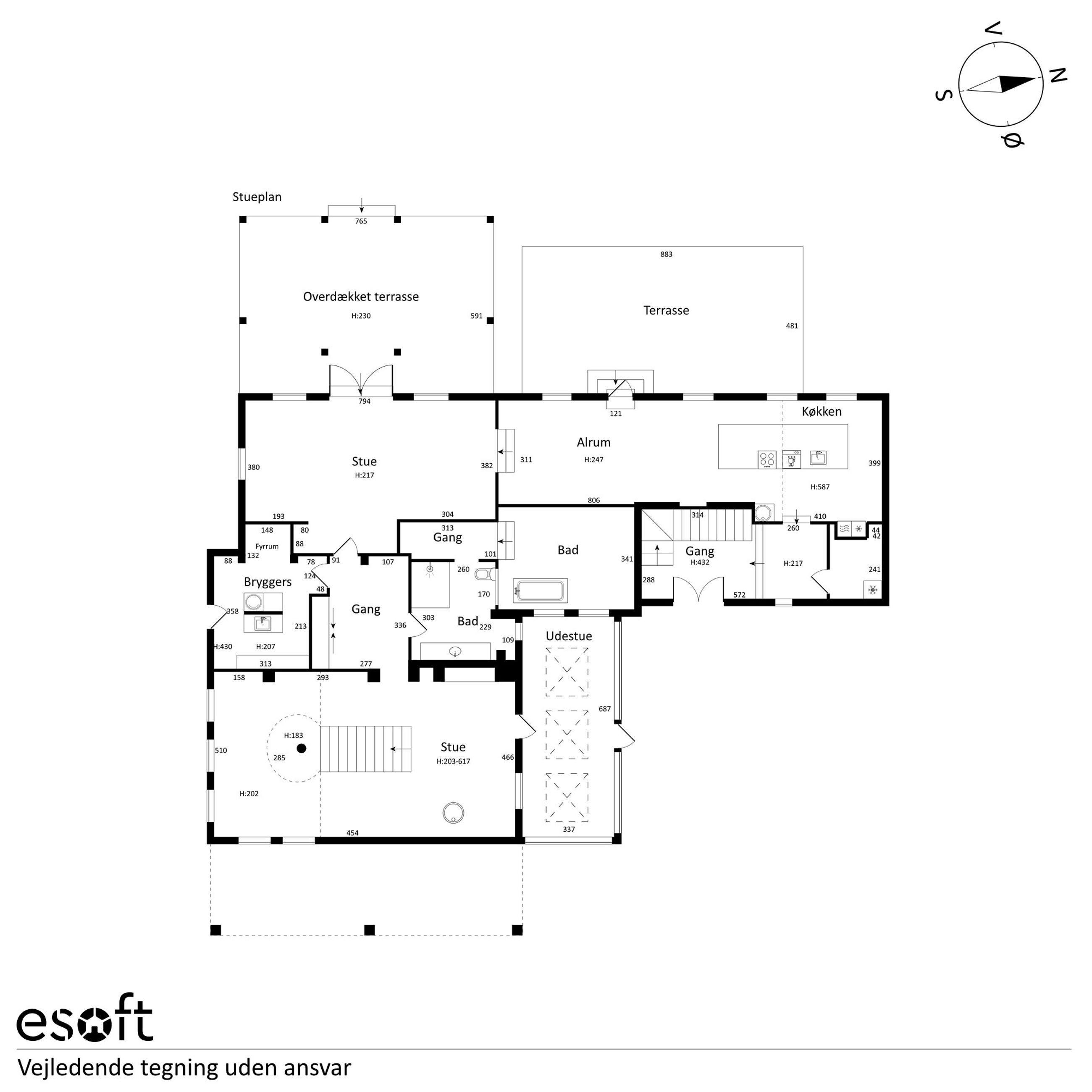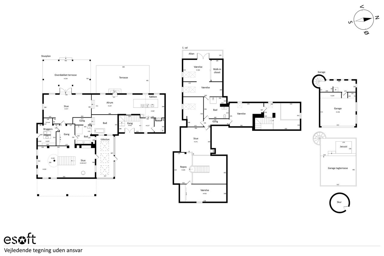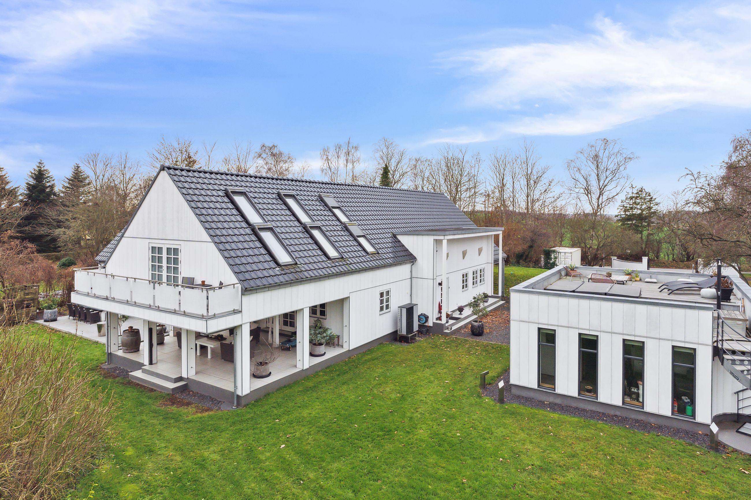 Grunden på over 3.200 kvadratmeter byder på flere terrasser og velplejede grønne områder, der indbyder til afslapning og samvær. Den overdækkede terrasse giver mulighed for at nyde udsigten året rundt, mens garagebygningen med tagterrasse tilføjer endnu en dimension af komfort.