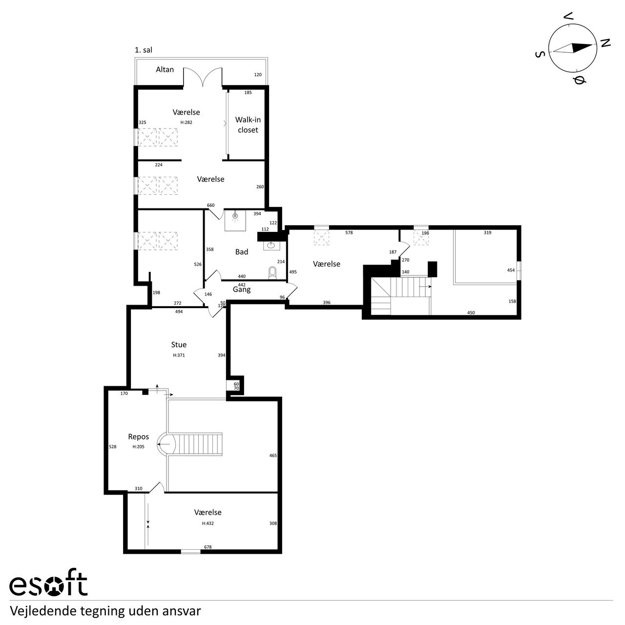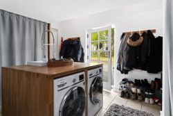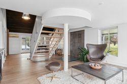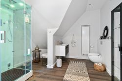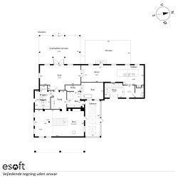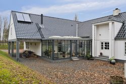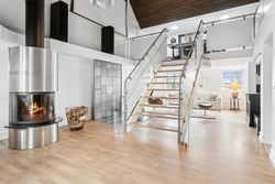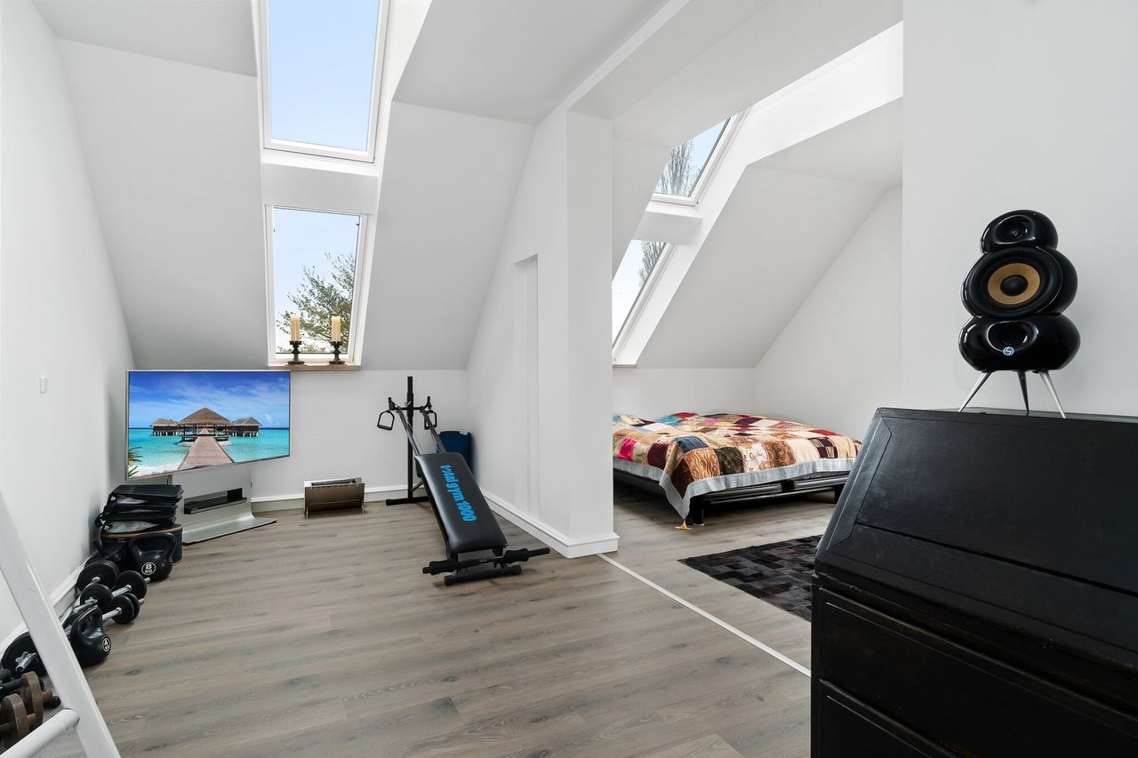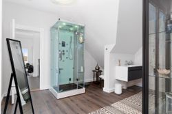 De 358 kvadratmeter bolig er fordelt på to etager med en elegant og funktionel planløsning. Her finder du blandt andet et moderne køkken med amerikansk valnød, rummelige værelser med walk-in-closet og et eksklusivt badeværelse med både brusekabine og badekar. Den integrerede udestue med sortrammede glaspartier og ovenlysvinduer giver boligen et ekstra strejf af luksus.