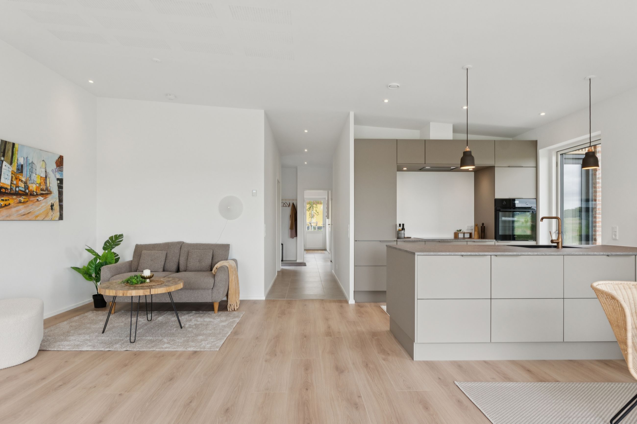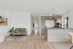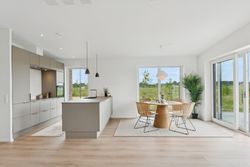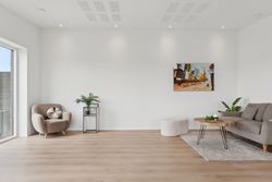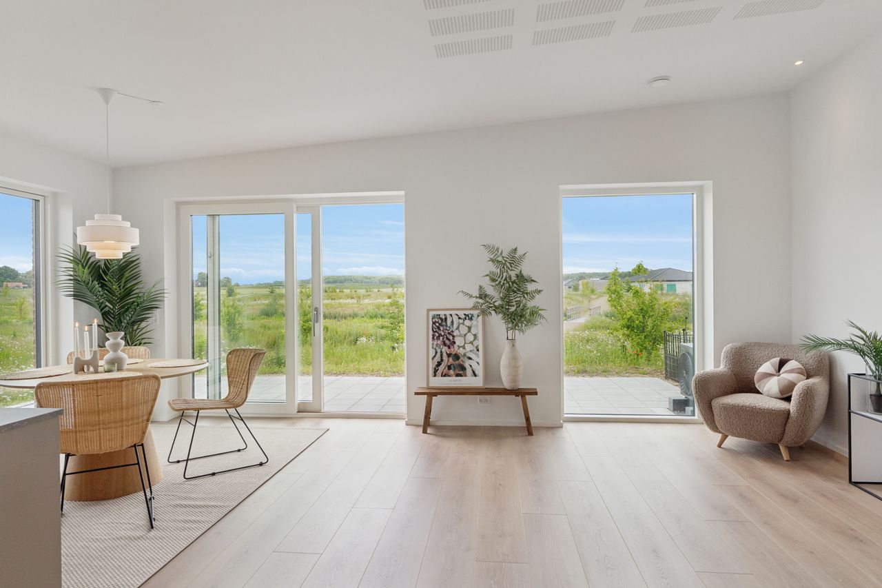 Leder I efter et gennemført hjem, som er lige til at flytte ind i? Så skal I uden tvivl se nærmere på dette nyopførte, halve dobbelthus fra 2025. Hjemmet er genialt indrettet og passer perfekt til den lille familie eller parret, som kan se frem til to værelser, et badeværelse, et bryggers og et sublimt opholdsmiljø med køkken-alrum og stue i ét. Hertil får I ligeledes skønne rammer udendørs med et solrigt terrassemiljø og en helt vidunderlig udsigt.