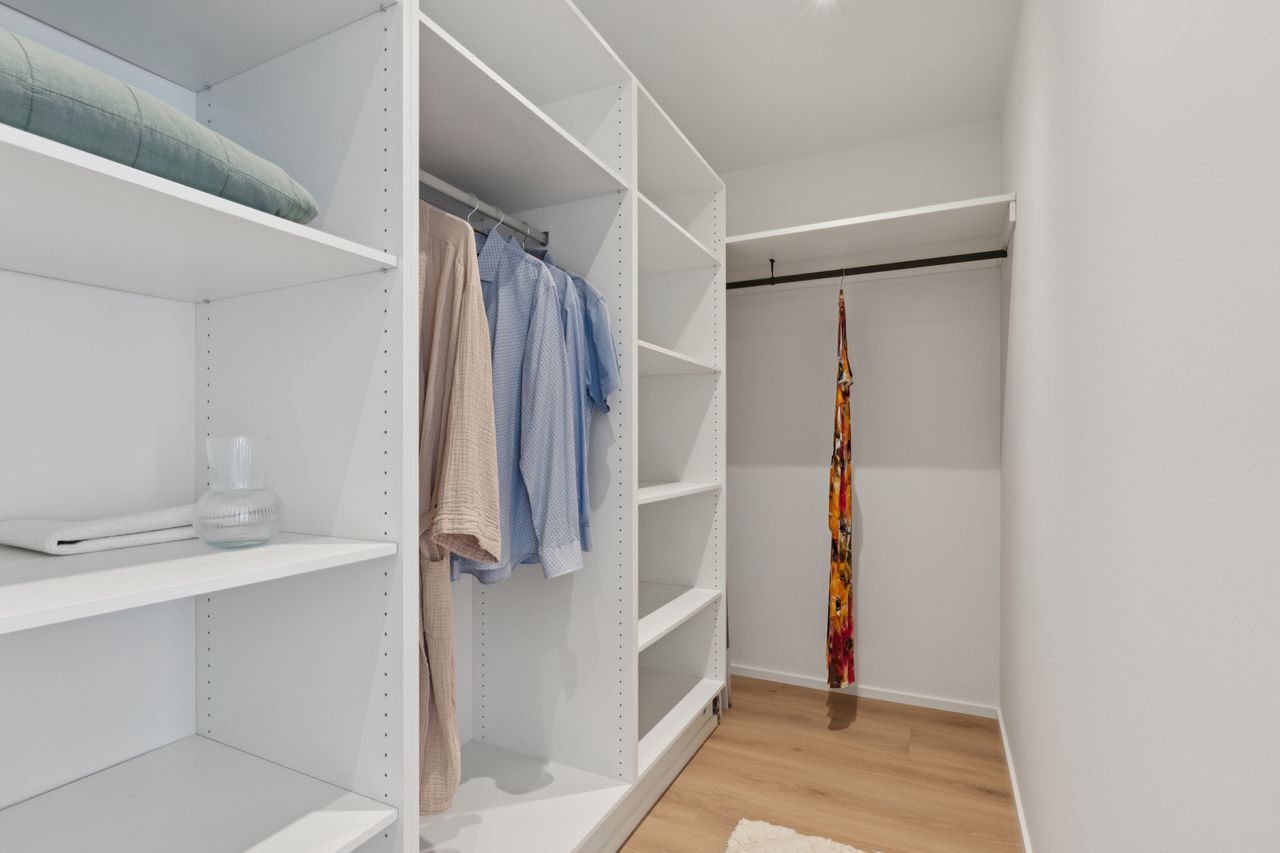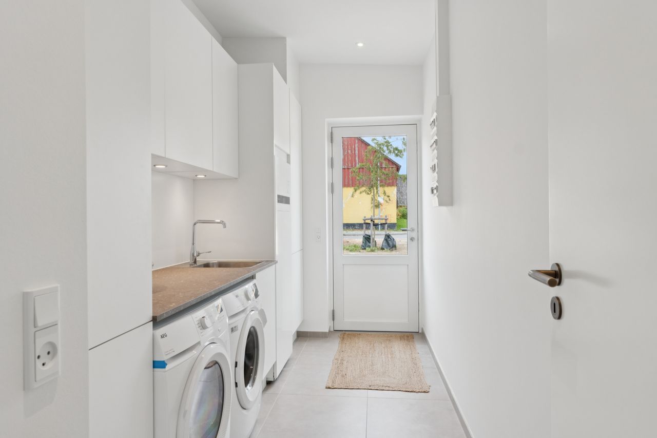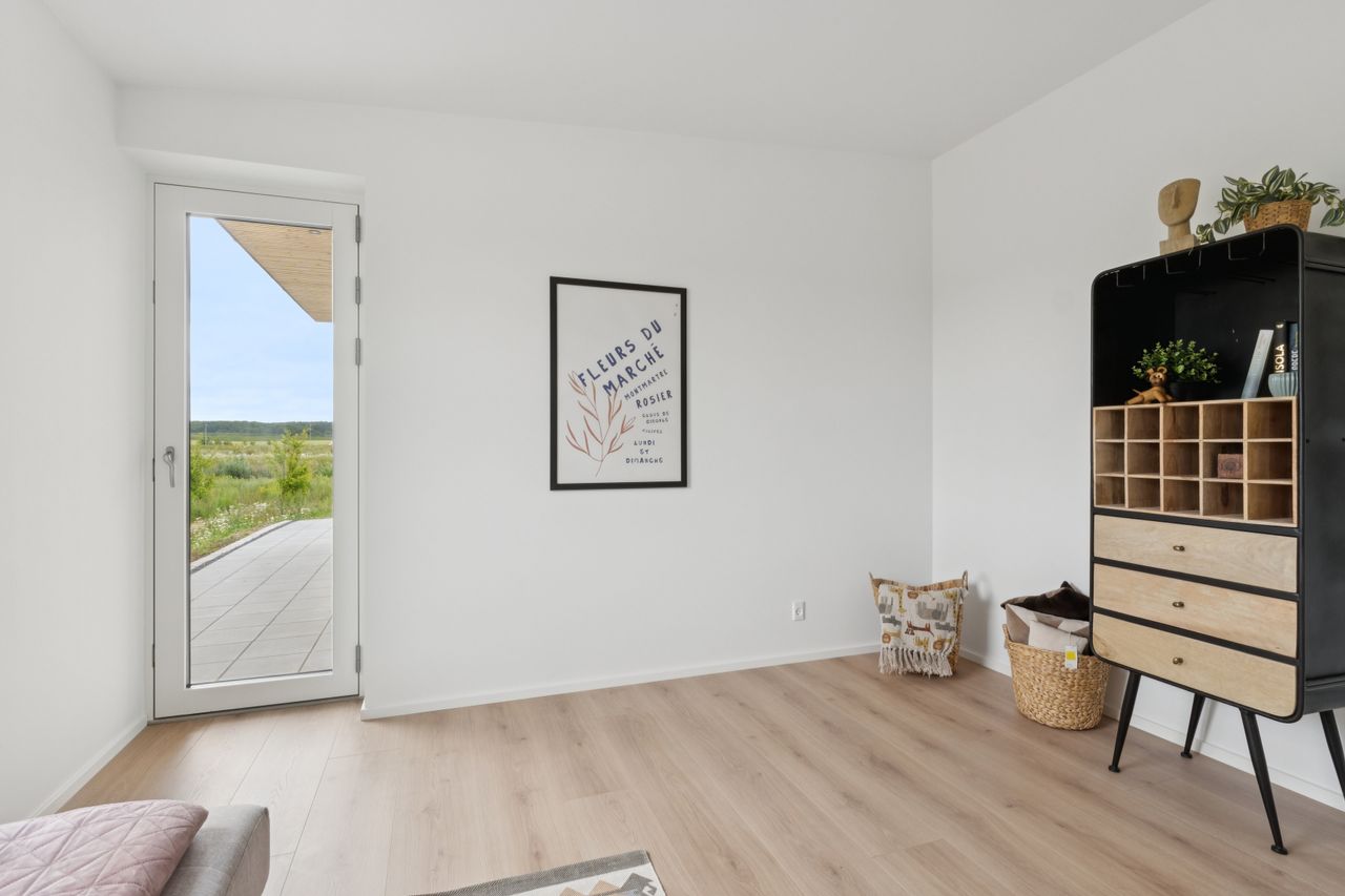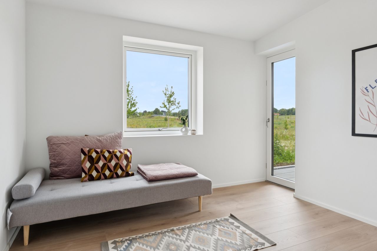 To værelser giver jer fine indretningsmuligheder, og det ene af dem er oplagt som soveværelse, da I her får eget walk-in-closet. Badeværelset ligger nær værelserne, og det er udført med flotte fliser, separat bruseafsnit og armaturer i messinglook, mens hjemmet afrundes af det praktiske bryggers.