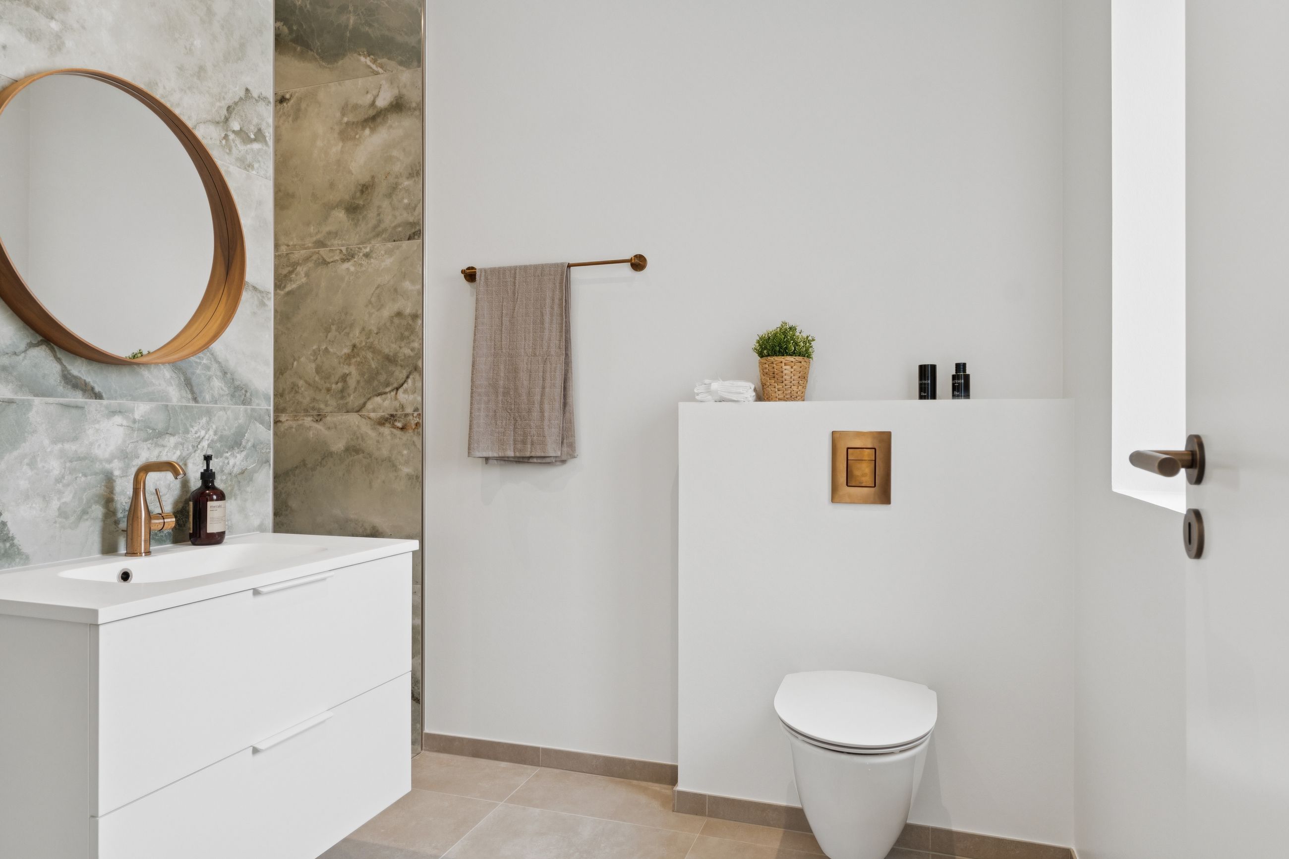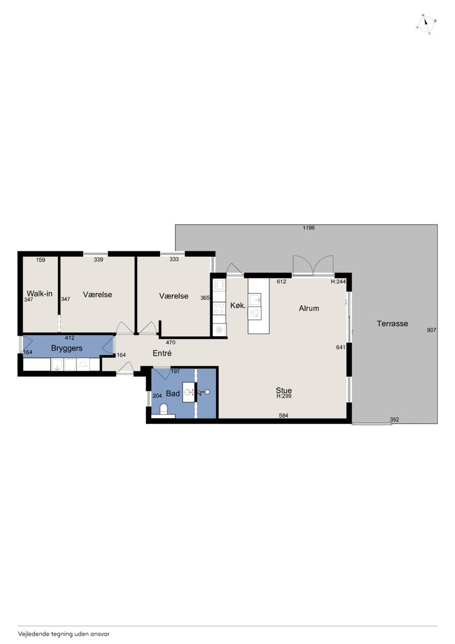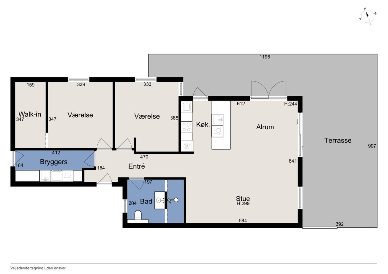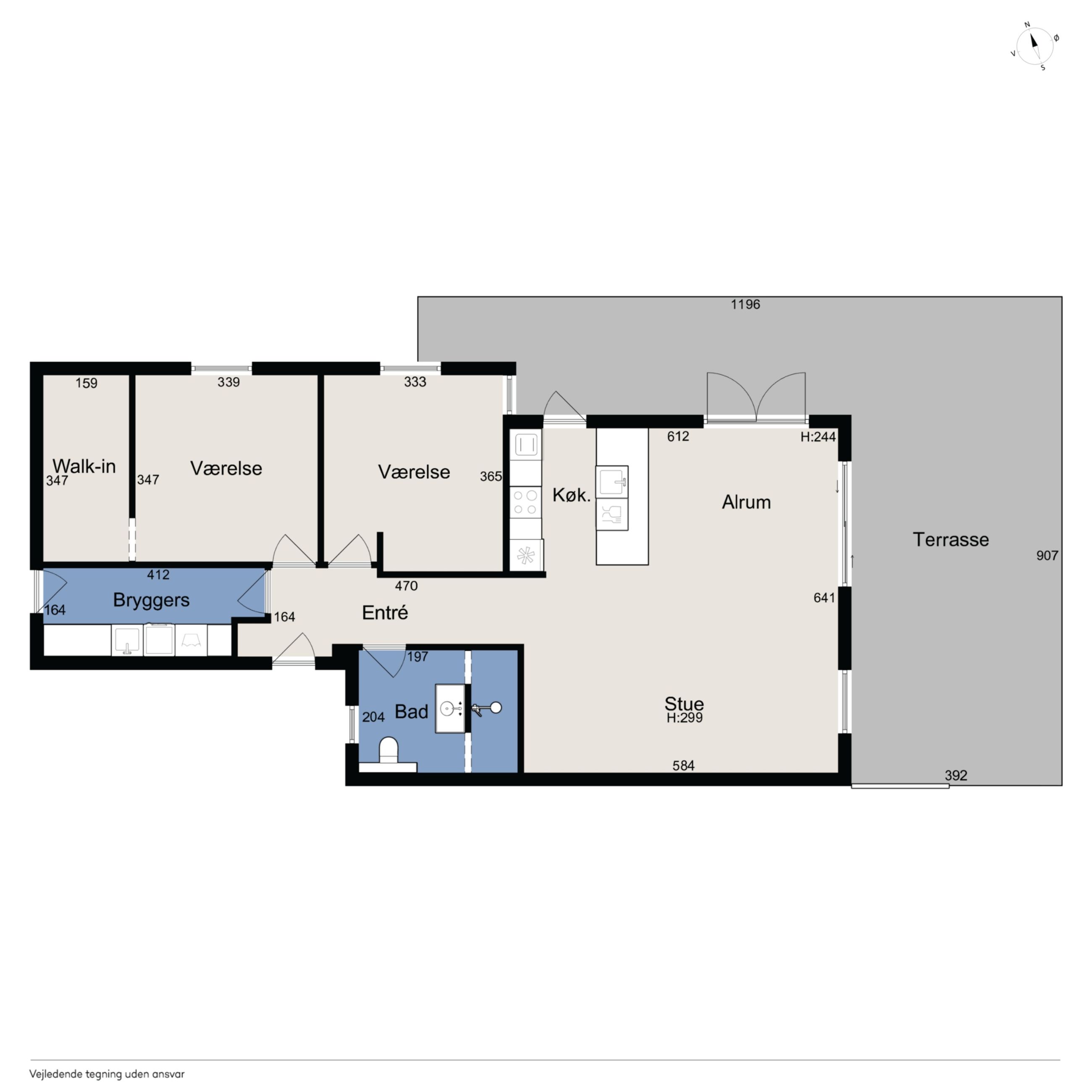 To værelser giver jer fine indretningsmuligheder, og det ene af dem er oplagt som soveværelse, da I her får eget walk-in-closet. Badeværelset ligger nær værelserne, og det er udført med flotte fliser, separat bruseafsnit og armaturer i messinglook, mens hjemmet afrundes af det praktiske bryggers.