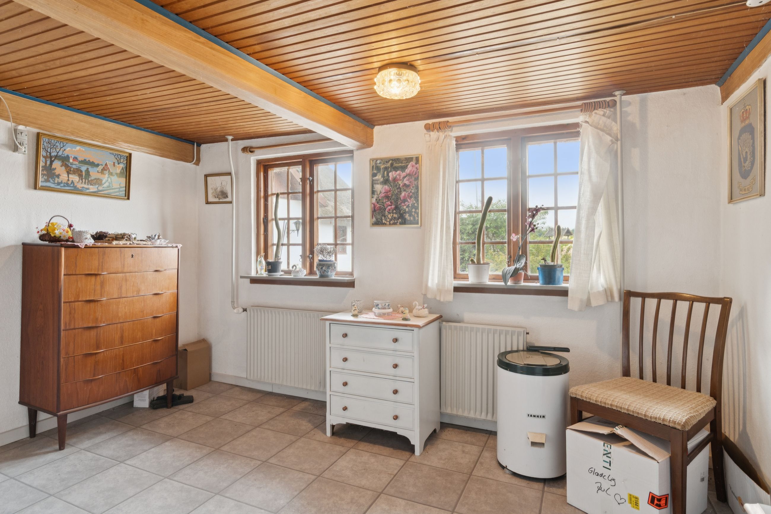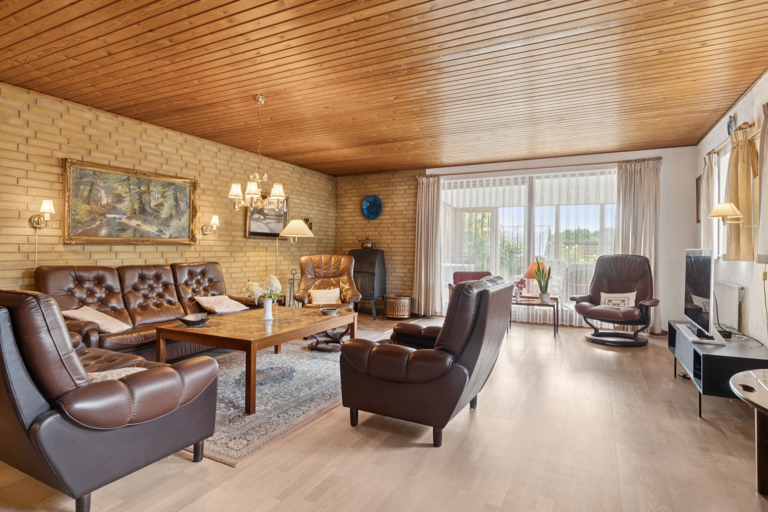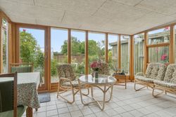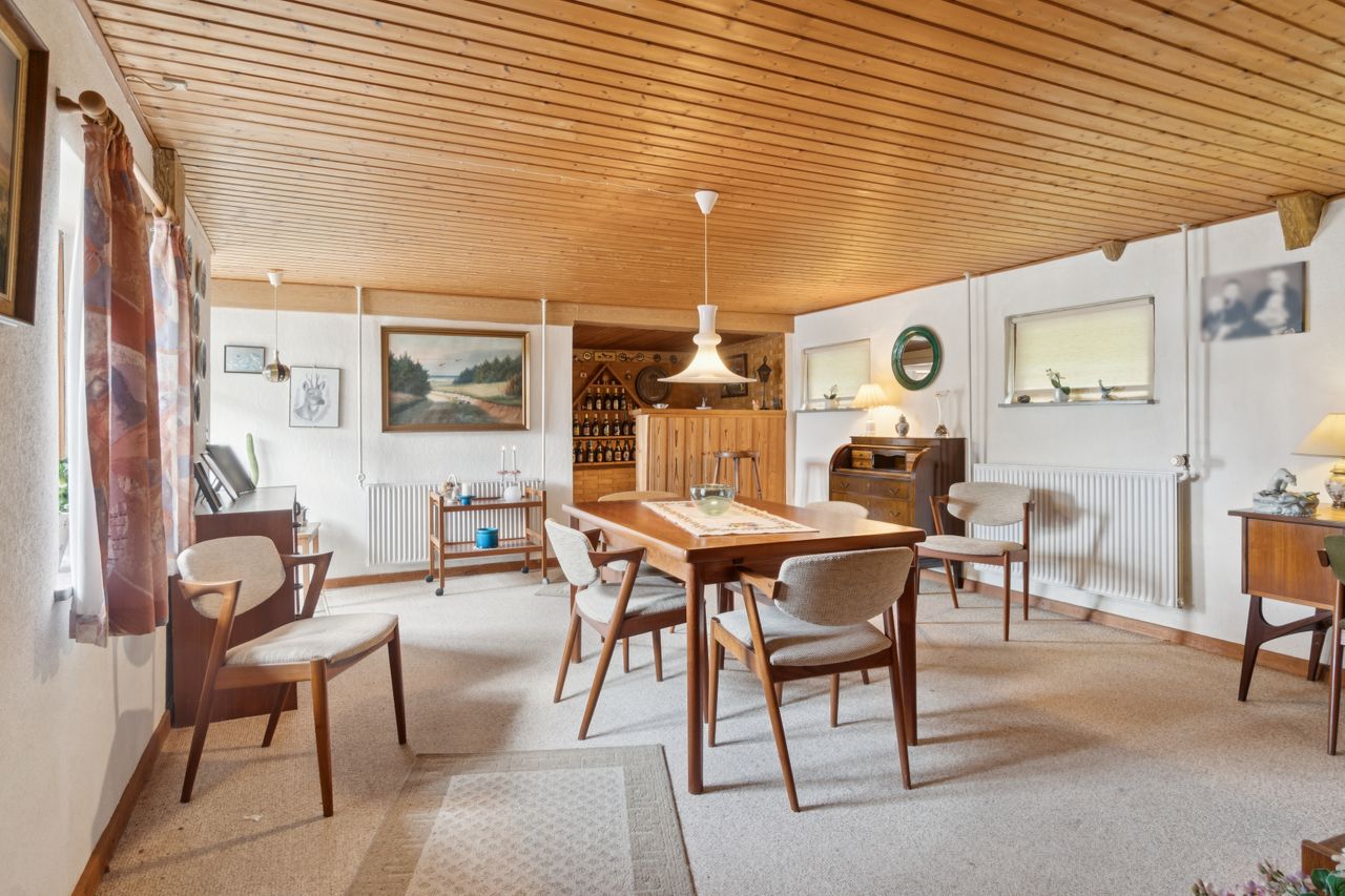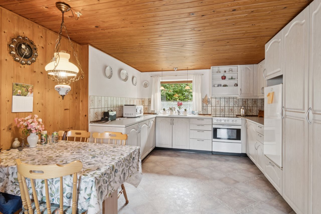 Indendørs byder hjemmet på masser af sjæl. Spisekøkkenet står i landlig stil med fyldningslåger og træbeklædte vægge og lofter. Her er det nemt at forestille sig morgenkaffen i ro og mag. Fra køkkenet kan I træde ind i en stor og indbydende stue, der desuden får selskab af en udestue med dør ud til terrassen.