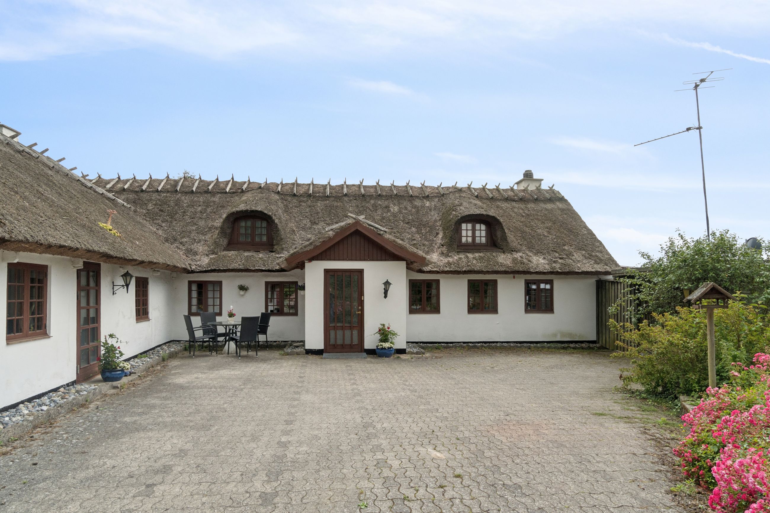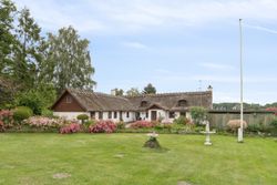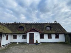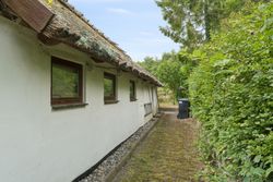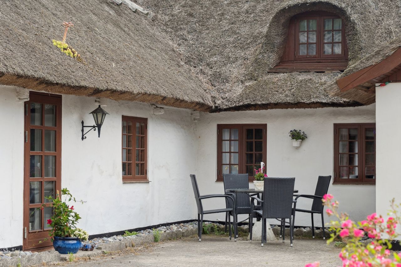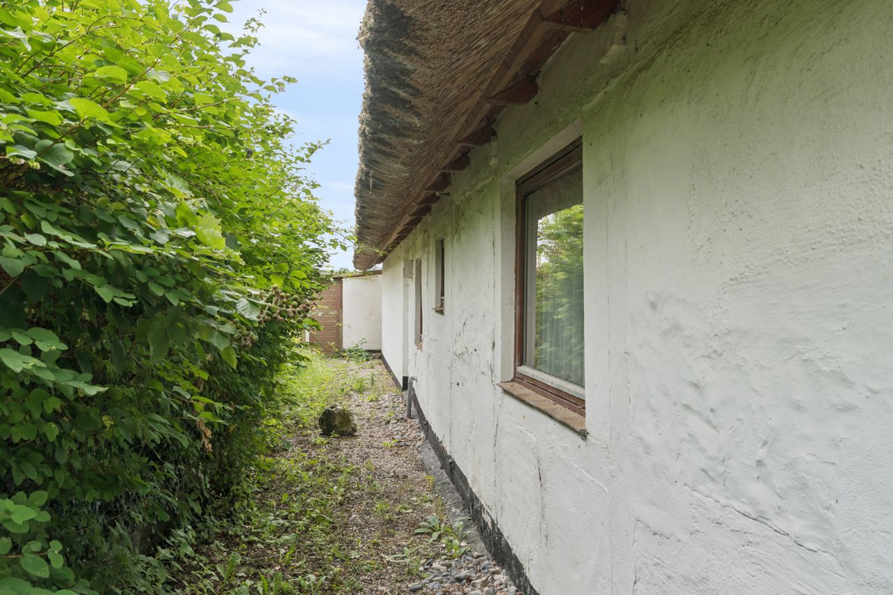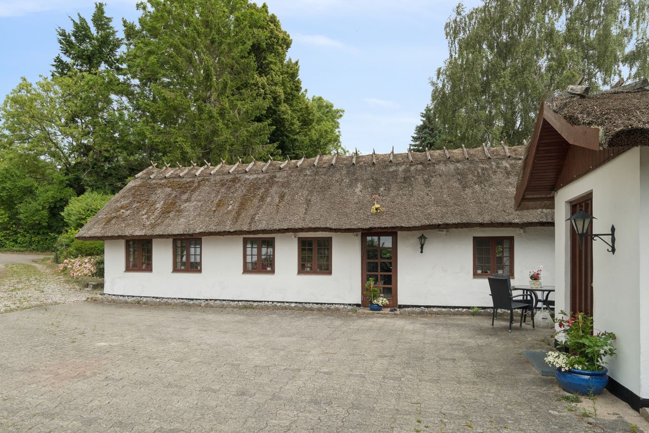 I det hyggelige Svenstrup ligger denne særlige bindingsværksejendom, hvor den hvide facade smyger sig over stok og sten. Dette passer som fod i hose til udtrykket med de mørkebrune vinduesrammer og døre og ikke mindst det fine stråtag med kviste. Her kombineres historie og landlig idyl i smuk harmoni.